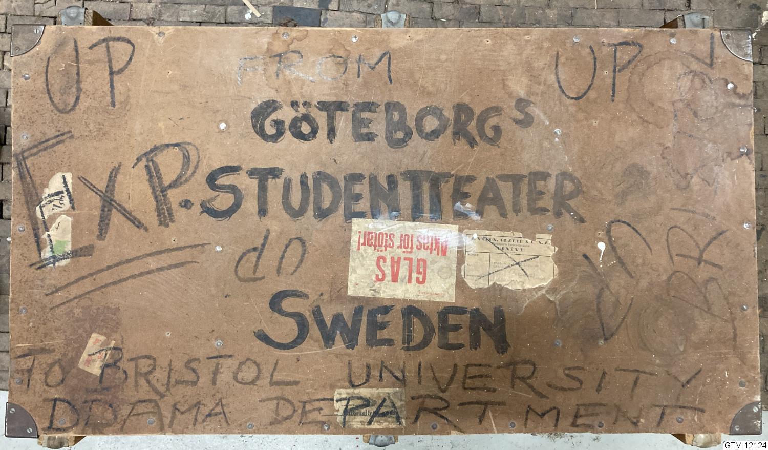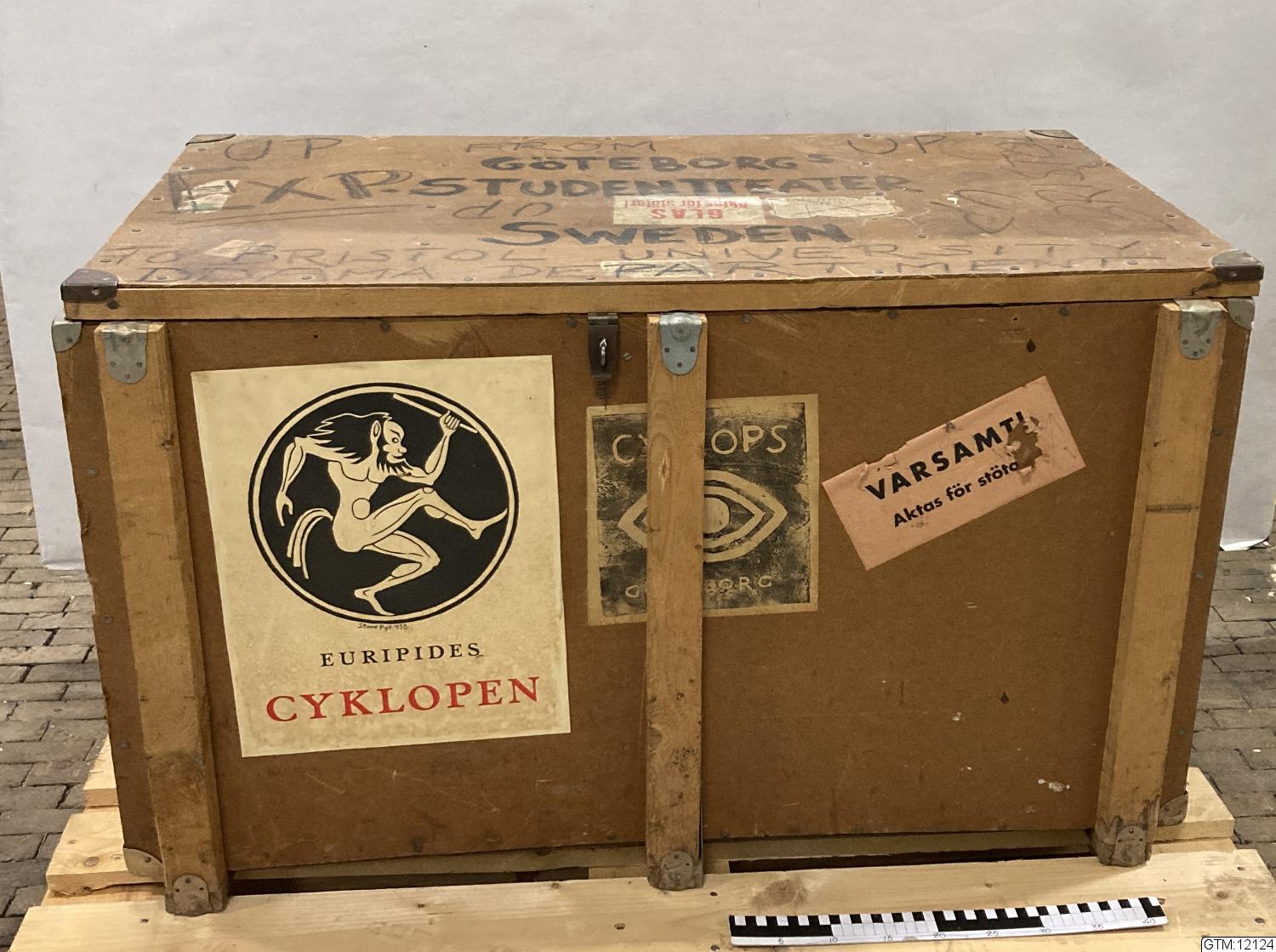 - En koffert i trä som förvarat 8 st (se sammanhörande föremål) teatermasker kopplade till föreställningen Cyklopen 1957. Kofferten är prydd med diverse olika märken kopplade till föreställningen/teatergruppen. Förmodas ha transporterat maskerna till Genève där föreställningen hade sin premiär på teaterfestivalen Delphiaden, varför kofferten bär stämplar och uppmaningar om varmsam hantering.