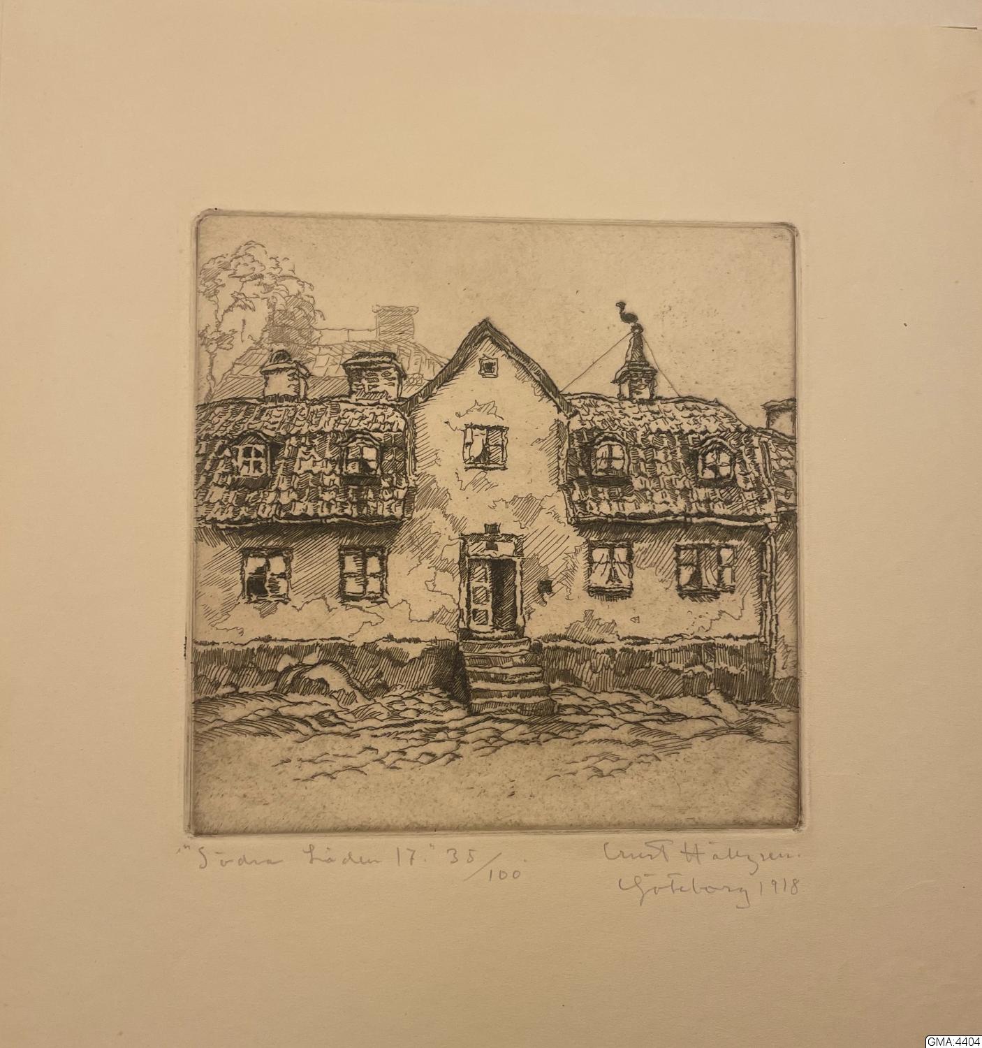 "Södra Liden 17." Etsning, sign. Ernst Hällgren, Göteborg 1918. (För ytterligare upplysning, se GMA:4096, under Beskrivning.)