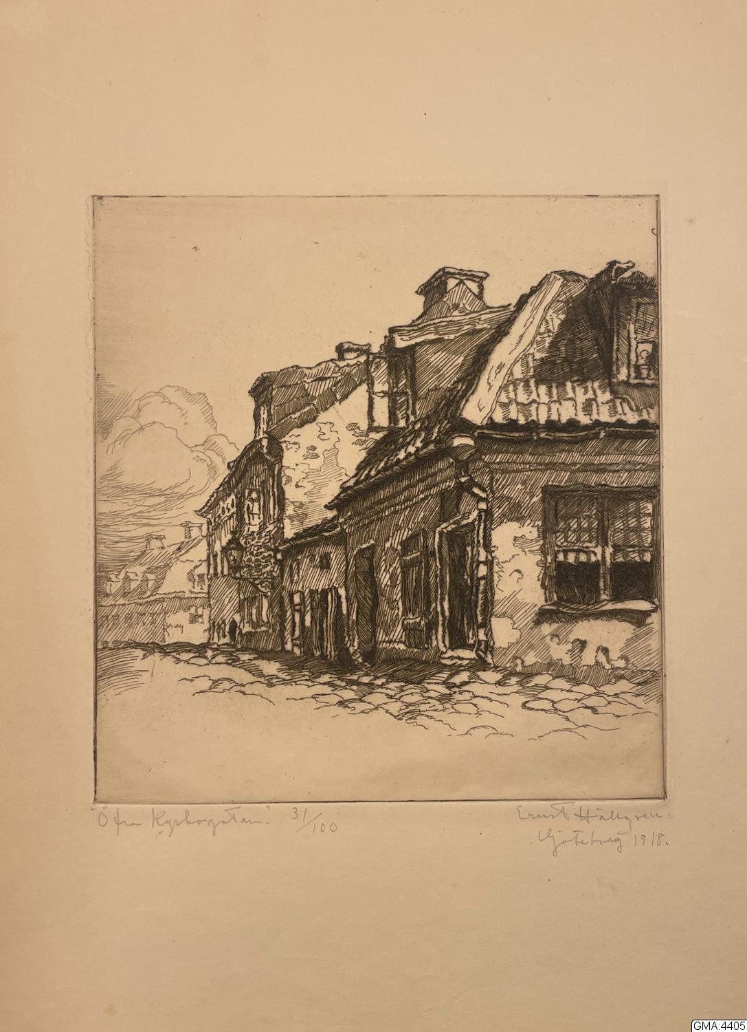 "Öfra Kyrkogatan" (fr.h. nr.3,5 o.s.v.). Etsning, sign. Ernst Hällgren, Göteborg 1918. (För ytterligare upplysning, se GMA:4096, under Beskrivning.)