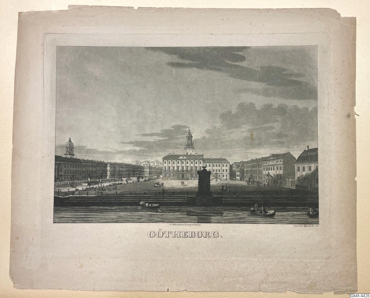 - Gustav Adolfs torg (Stora Torget) sett från öster över Östra Hamnkanalen. Akvatinta efter teckning av Leonard Björkfeldt (=GMA:3730. neg. E.418, 419, 421.) (För ytterligare upplysning, se GMA:4096, under Beskrivning.)