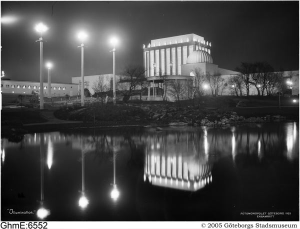 Jubileumsutställningen 1923. Bild från utställningsområdet: Minneshallen med närmaste omgivning i kvällsillumination sett över Näckrosdammen.