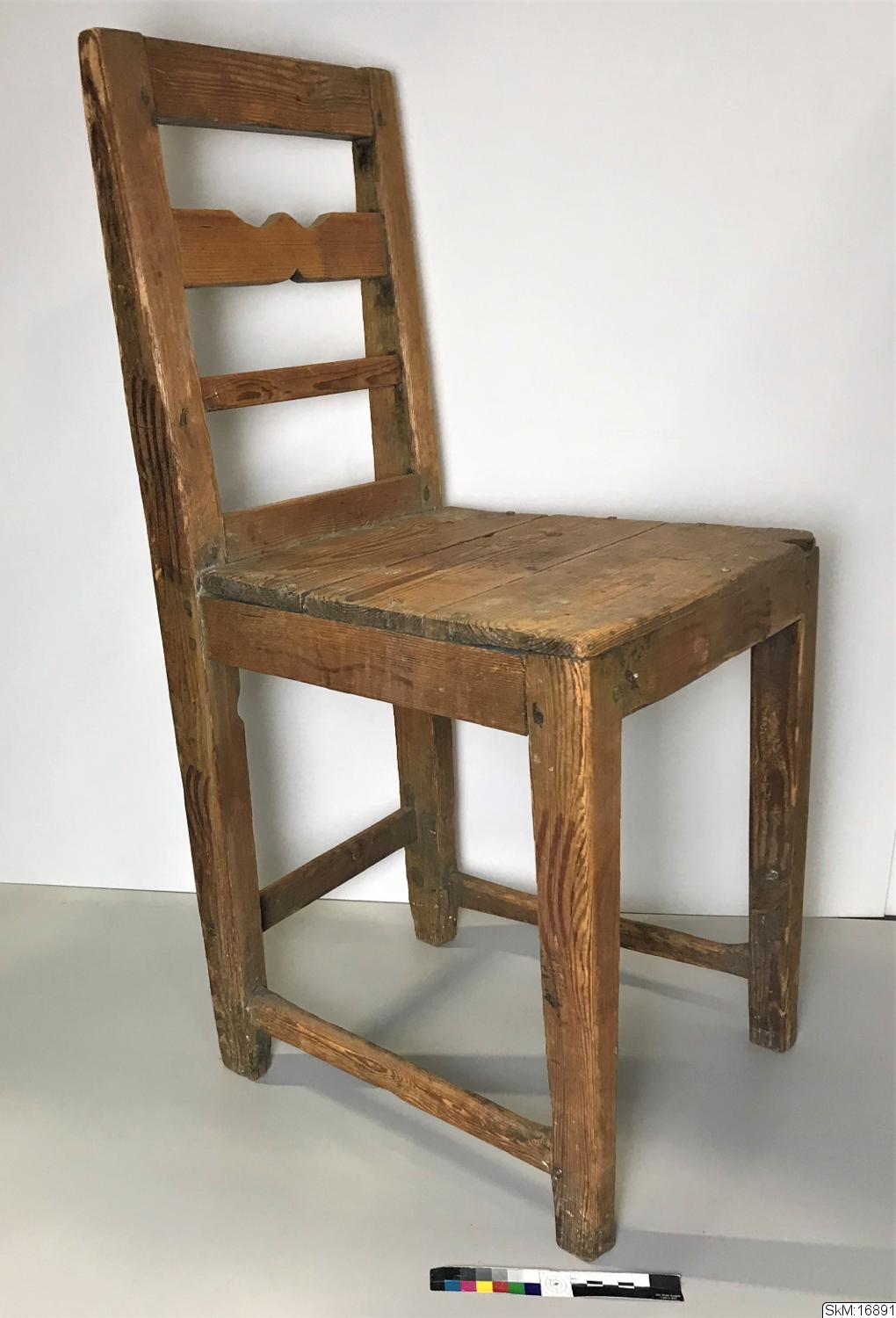 - stol av trä, har använta som skolstol. Skadad besnställning.