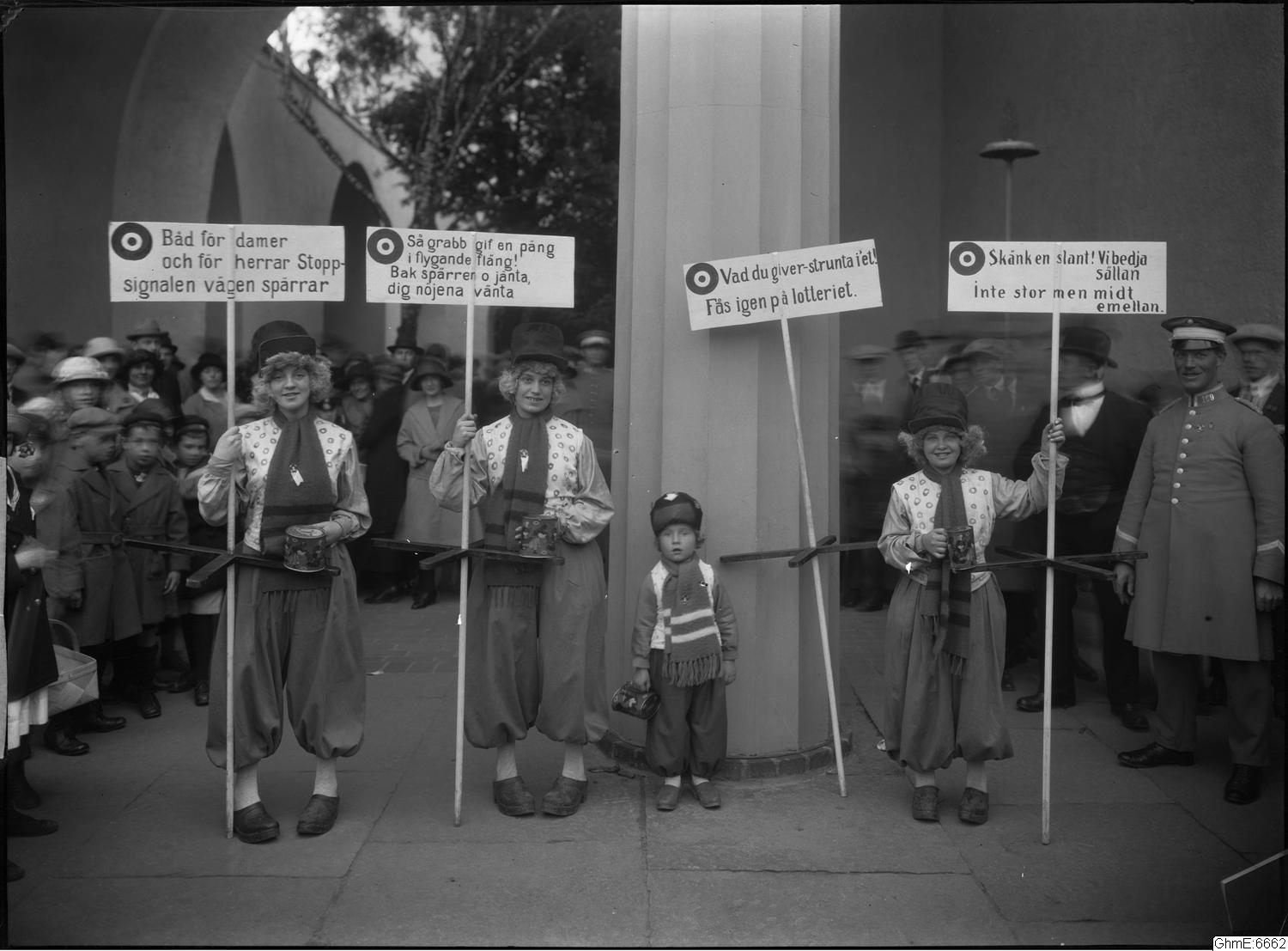 utställning; barnens dag; flicka; barn; sparbössa; insamling; skylt; dräkt; lotteri