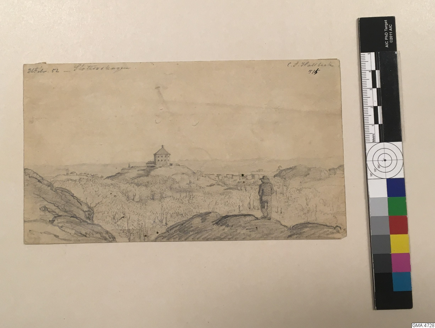 - Blyertsteckning, sign." C. S. Hallbeck - 21 Febr. 52 - Slottsskogen." Motivet: Utsikt mot nordost från höjd i Slottsskogen.(Repr. i Hugo Fröding: Berättelser ur Göteborgs nyare historia (1924), vid sid. 208.) (D:16.069.)