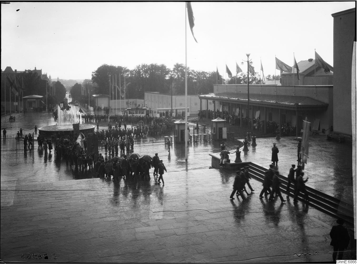 - Skyttar på väg till prisutdelning på utställningsområdet efter tävlan. Jubileumsutställningen 1923.