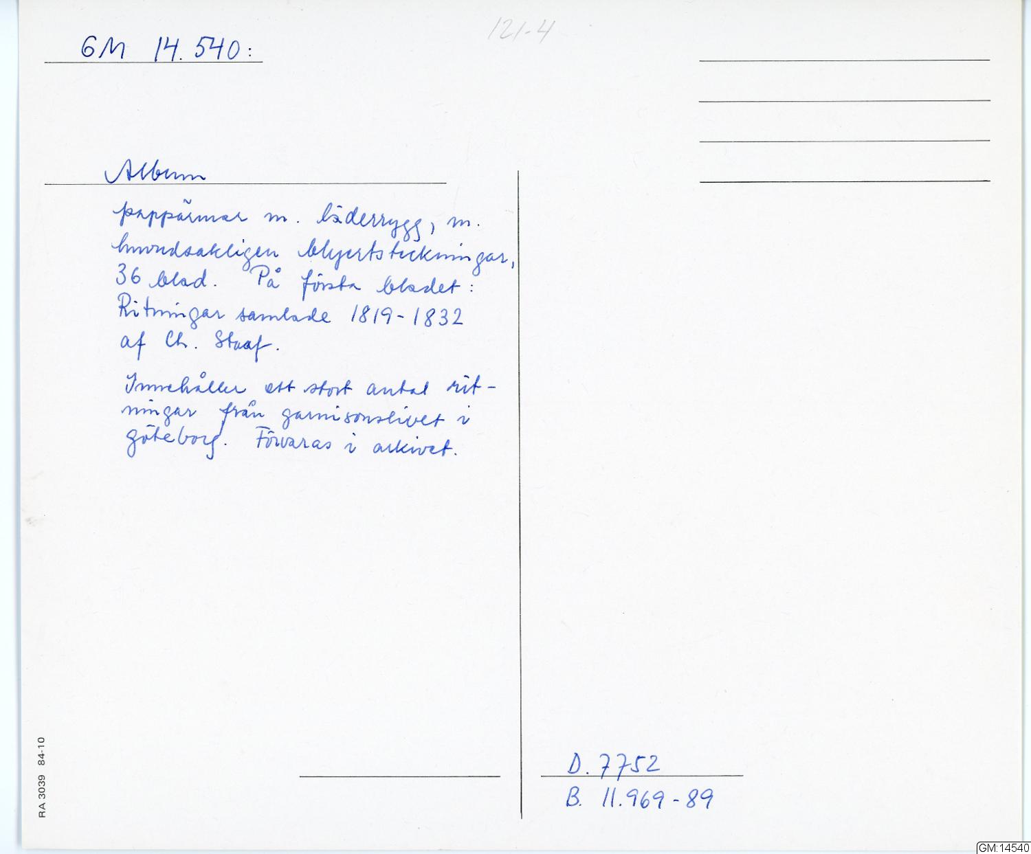 Album innehållande huvudsakligen blyertsteckningar, 36 blad. På första bladet: Ritningar samlade 1819-1832 af Ch. Staaf. Innehåller ett stort antal ritningar från garnisonsarkivet i Göteborg. Förvaras i arkivet.
