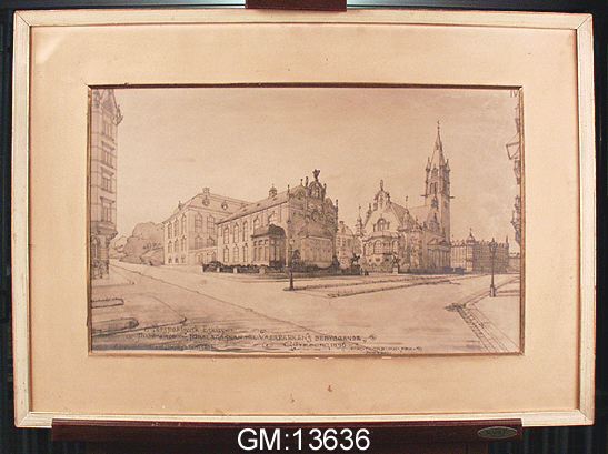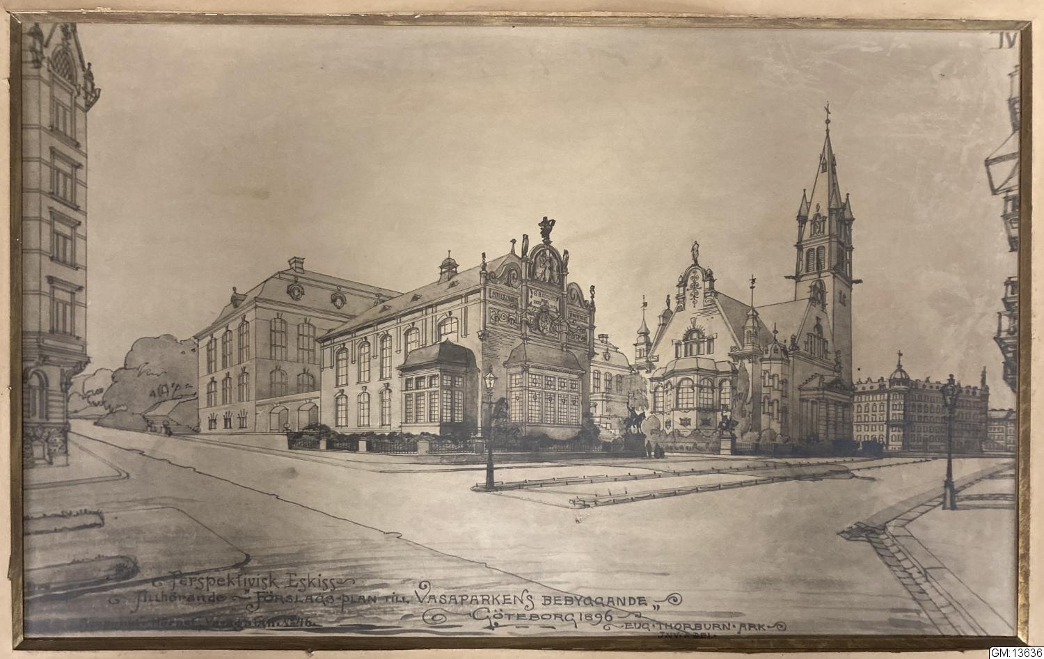 Perspektivisk Eskiss tillhörande förslagsplan till Vasaparkens bebyggande. Synpunkt hörnet Vasagatan nr 46. Göteborg 1896 Eug. Thorburn Ark. Inv. & del