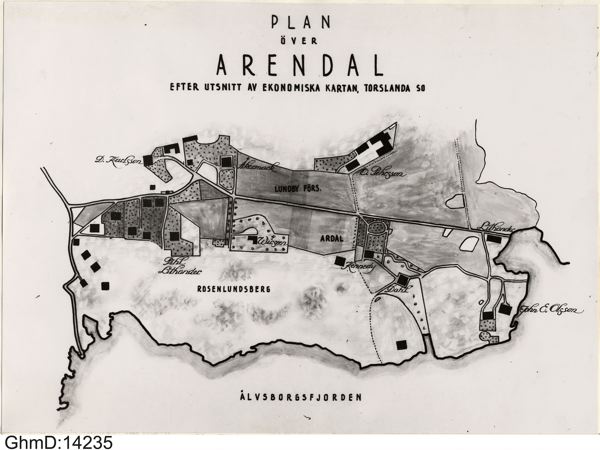 Karta utförd av Hugo Kennroth 1956 som utställningsmaterial i anslutning till visning av Historiska museets forografering av vissa byggnader i Arendalsområdet.