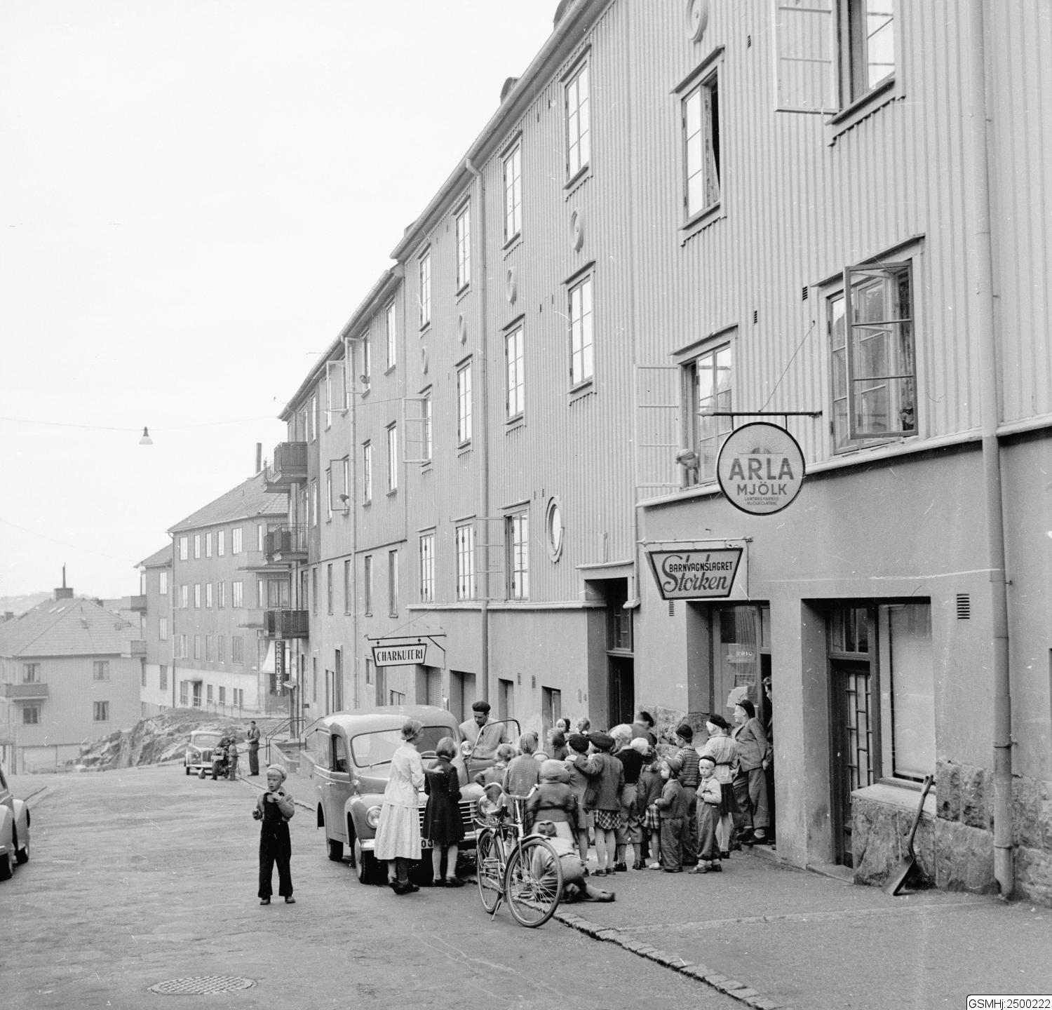 - Bilden visar en folksamling utanför butiken Storken ( barnvagnslagret) på Sjömansgatan runt 1950-tal. Arla-butiken bredvid sålde mjölk och mejerier. Uppståndelsen utanför kan visa på att en leverans av nya leksaker landar till butiken.