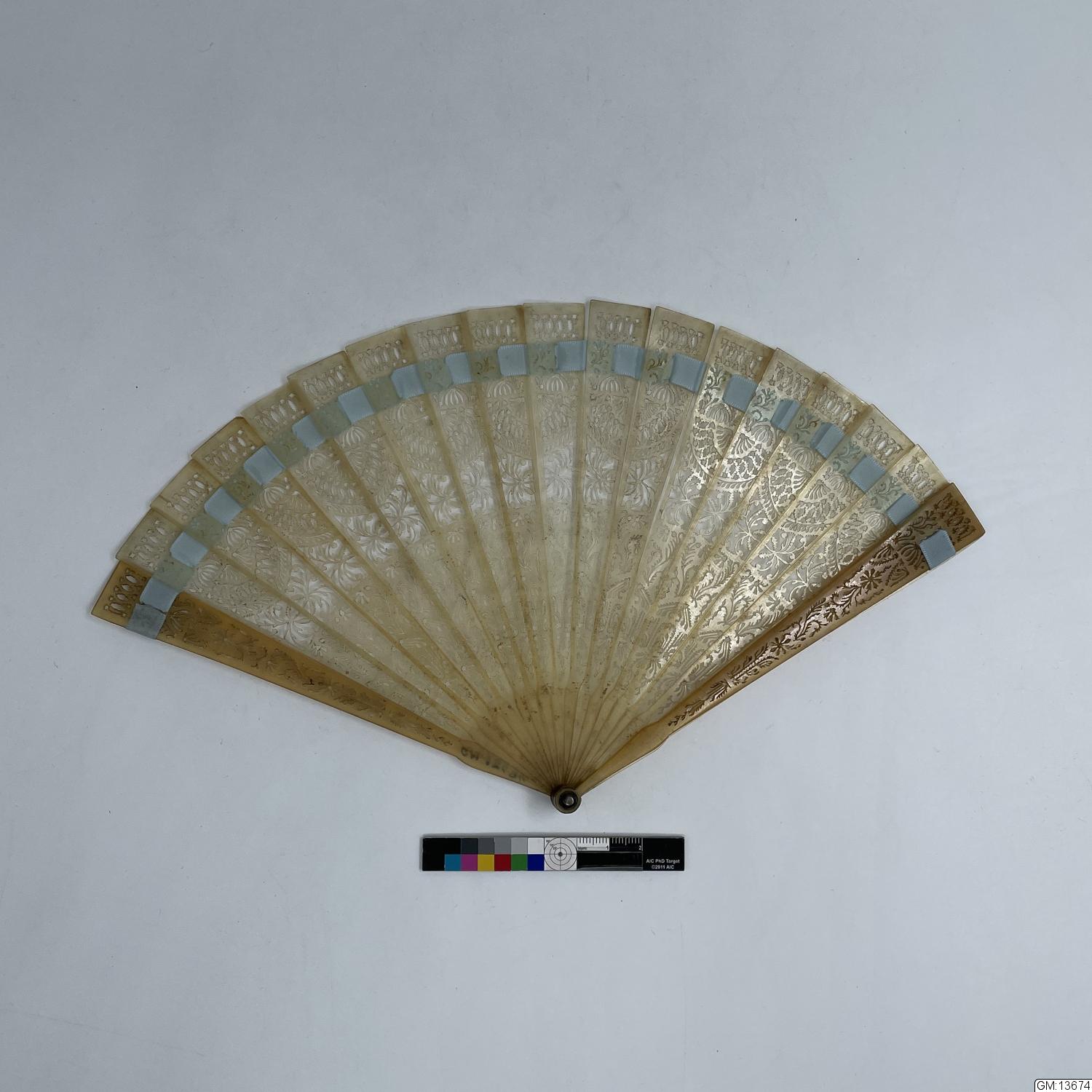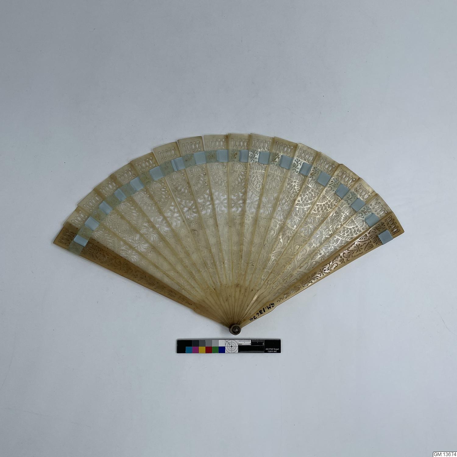 - solfjäder av celluloid, sammanhållen av blått sidenband.