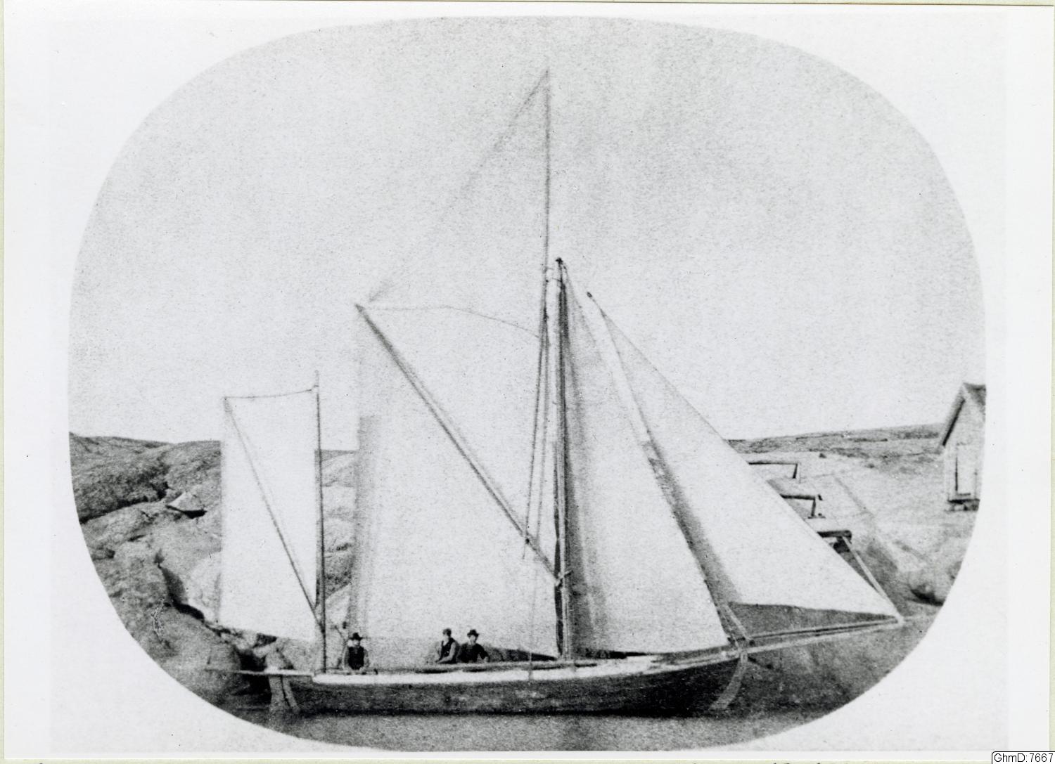 Foto av foto av skiss, 'Björn av Hasselösund' spririggad däcksbåt. Originalet hos sjökapten Axel Nilsson.