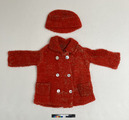 Dockkläder bestående av kappa och mössa i röd yllefrotté.