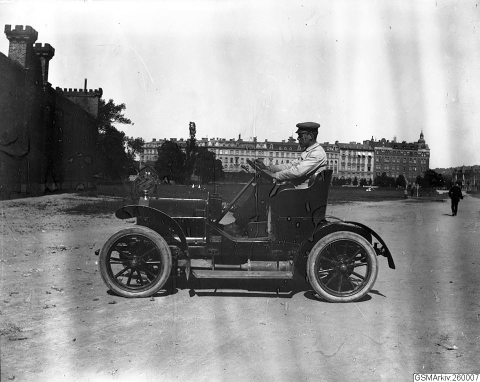 - En franskbyggd bil av märket Darracq fotograferad på Heden invid Excercishuset. Sten Sturegatan i bakgrunden. Ett litet emblem nära torpeden, strax nedanför förarens fot har texten "And. Skog Automobil-affär Göteborg". Anders Skog var en känd tidig bilimportör i staden som började importverksamheten med just Darracq. Källa: P Sörliden