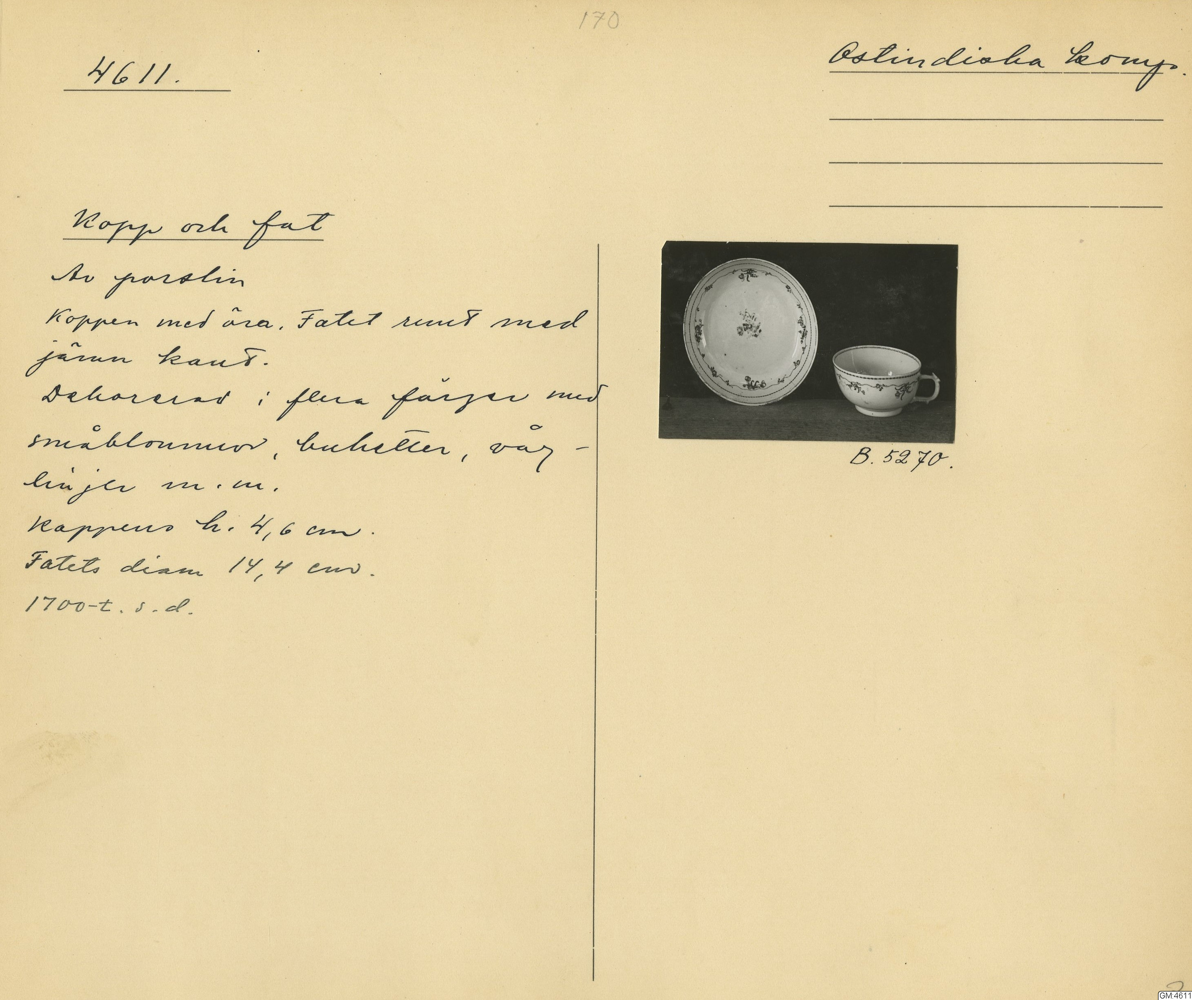 GM katalogkort 170. 18E. Porslin Ostindiskt 1. Thé mm 1. Kannor, koppar, fat