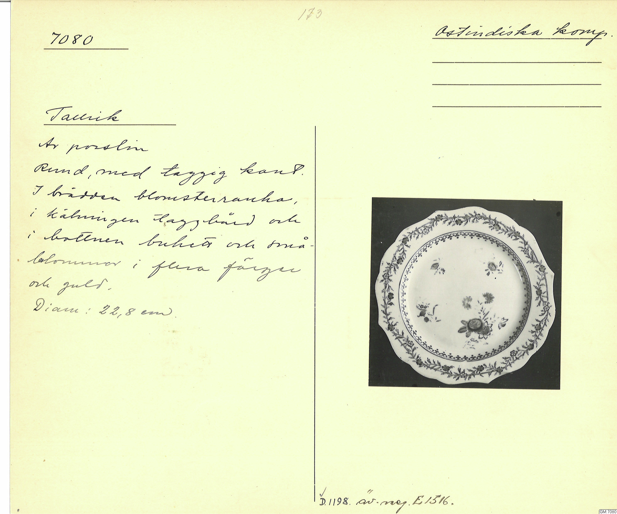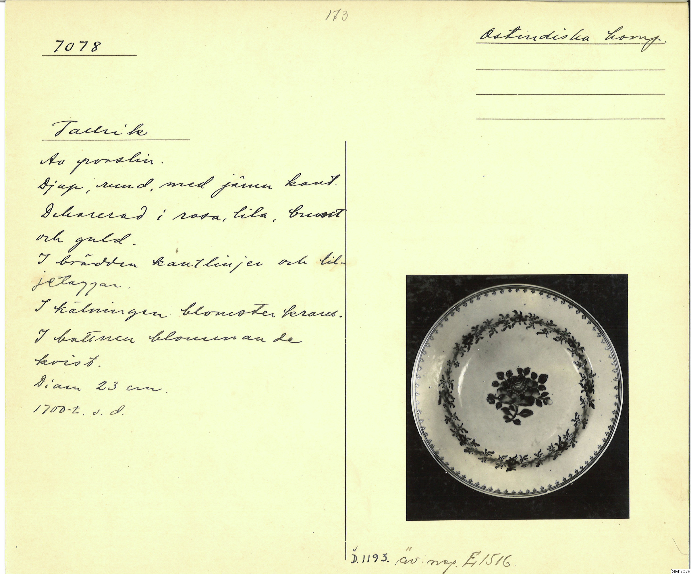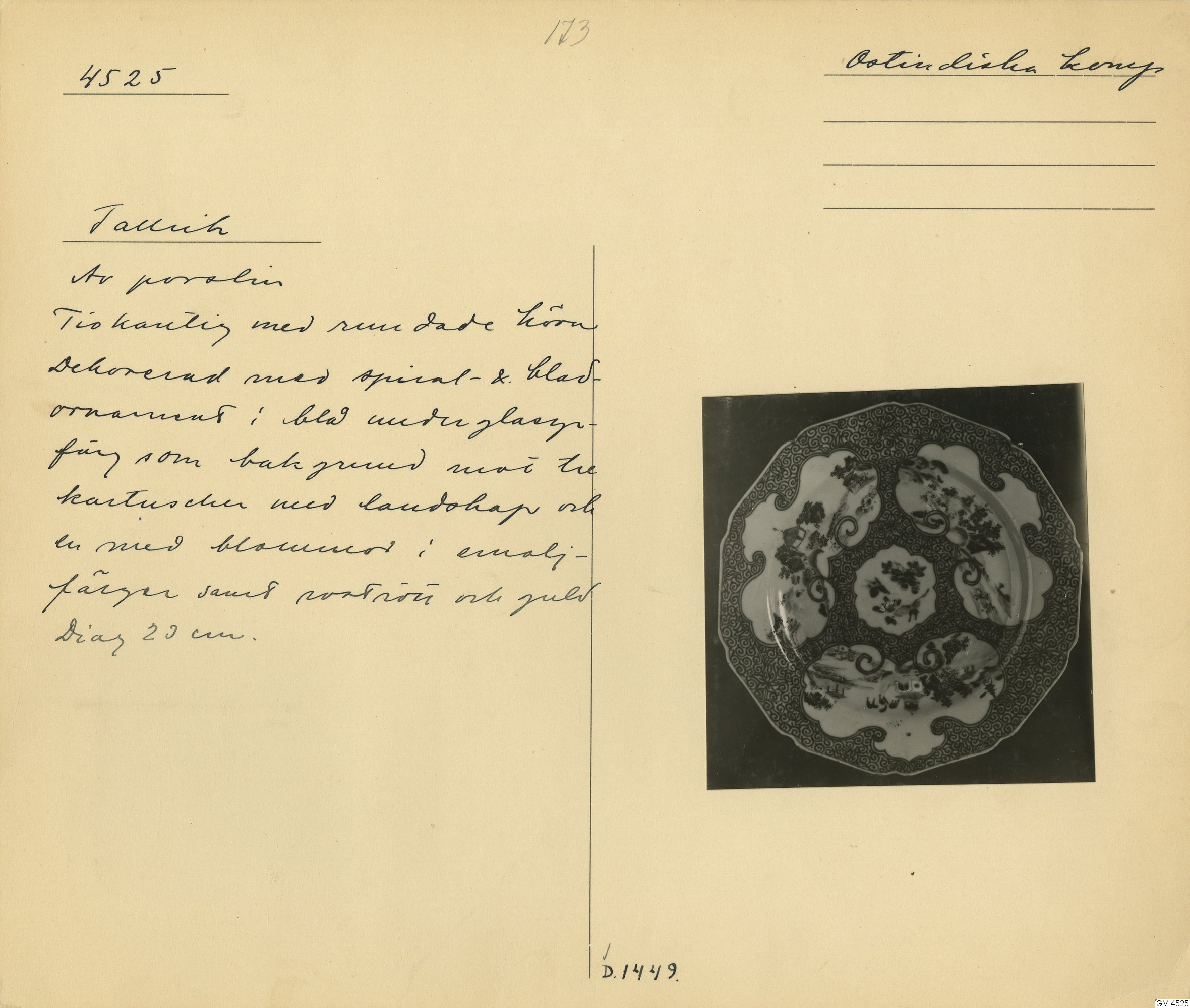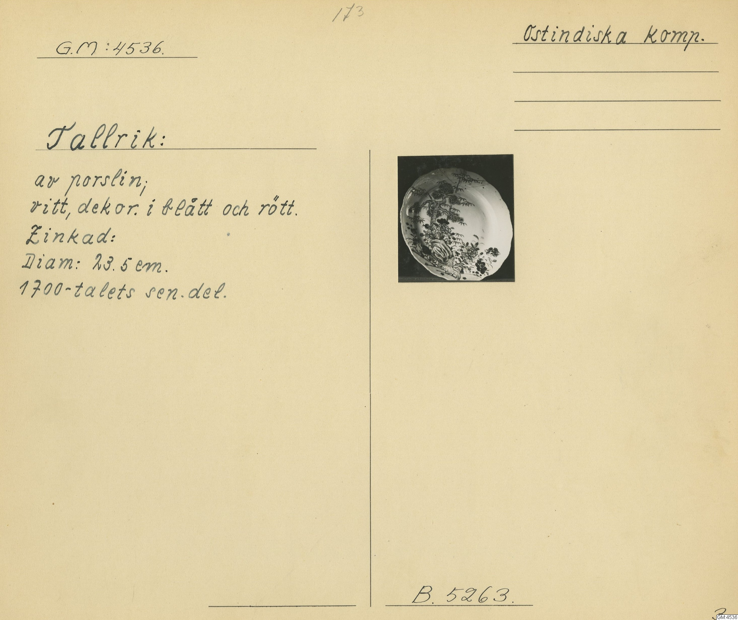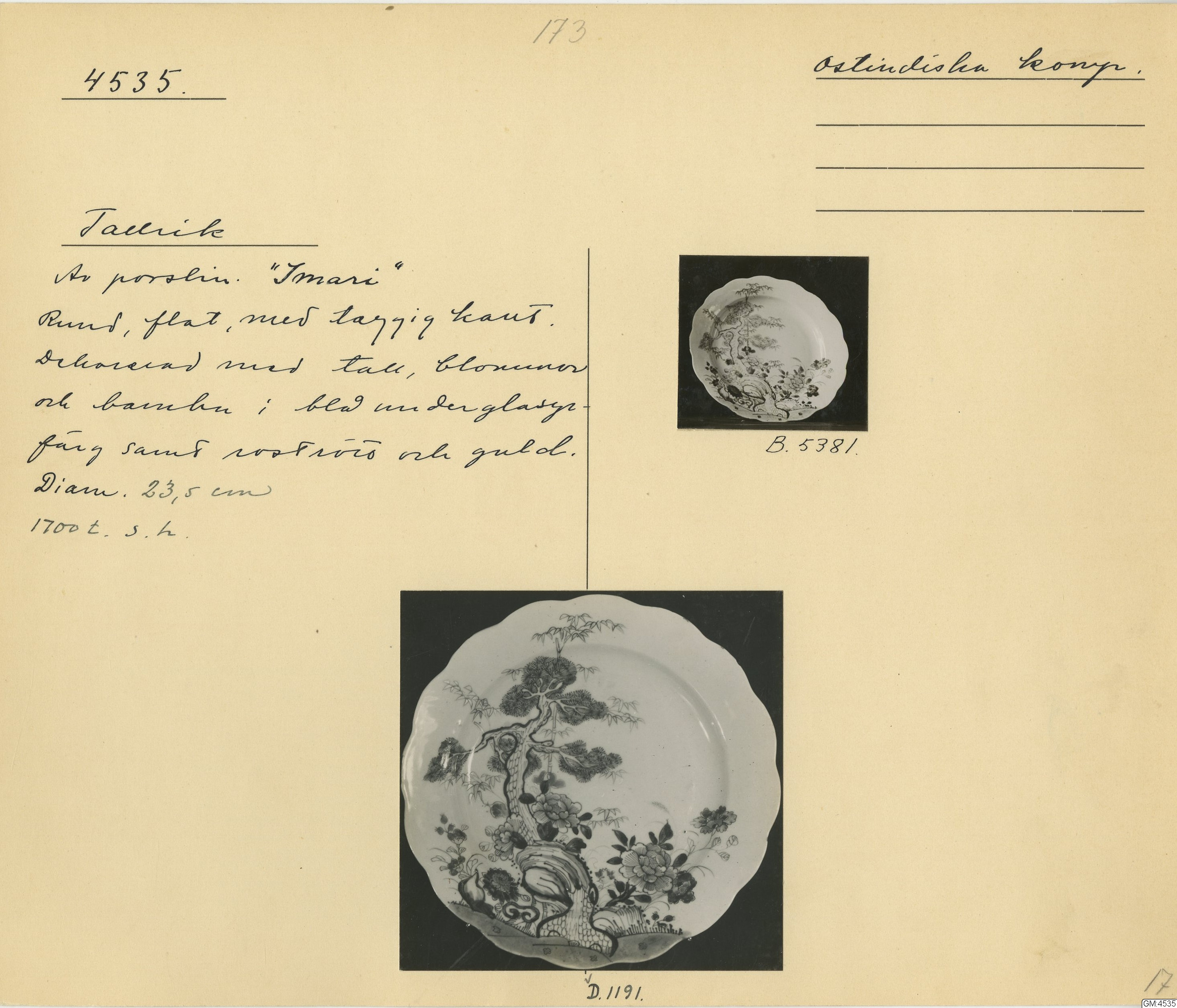 GM katalogkort 173. 18E Porslin Ostindiskt 3. Tallrikar 1