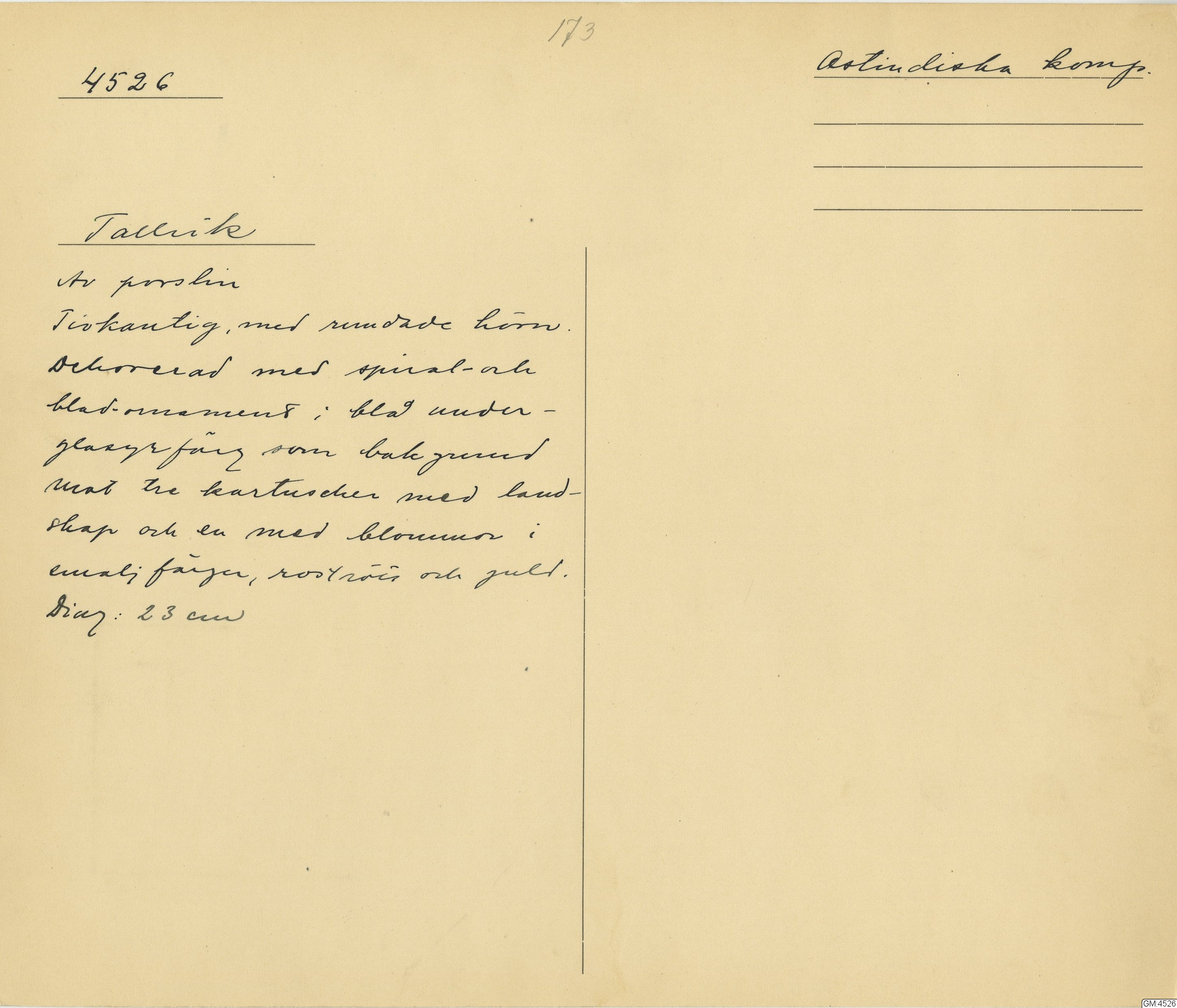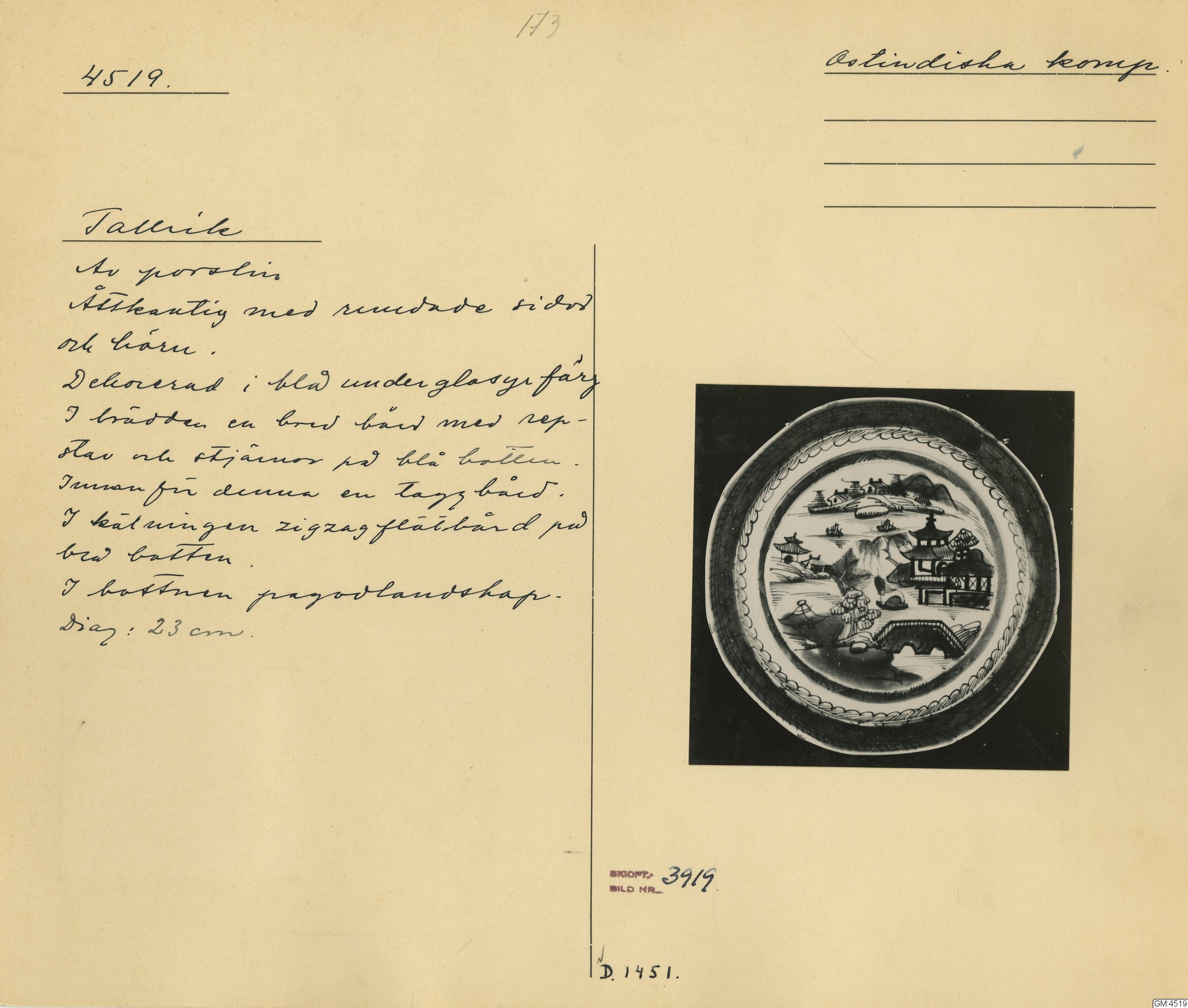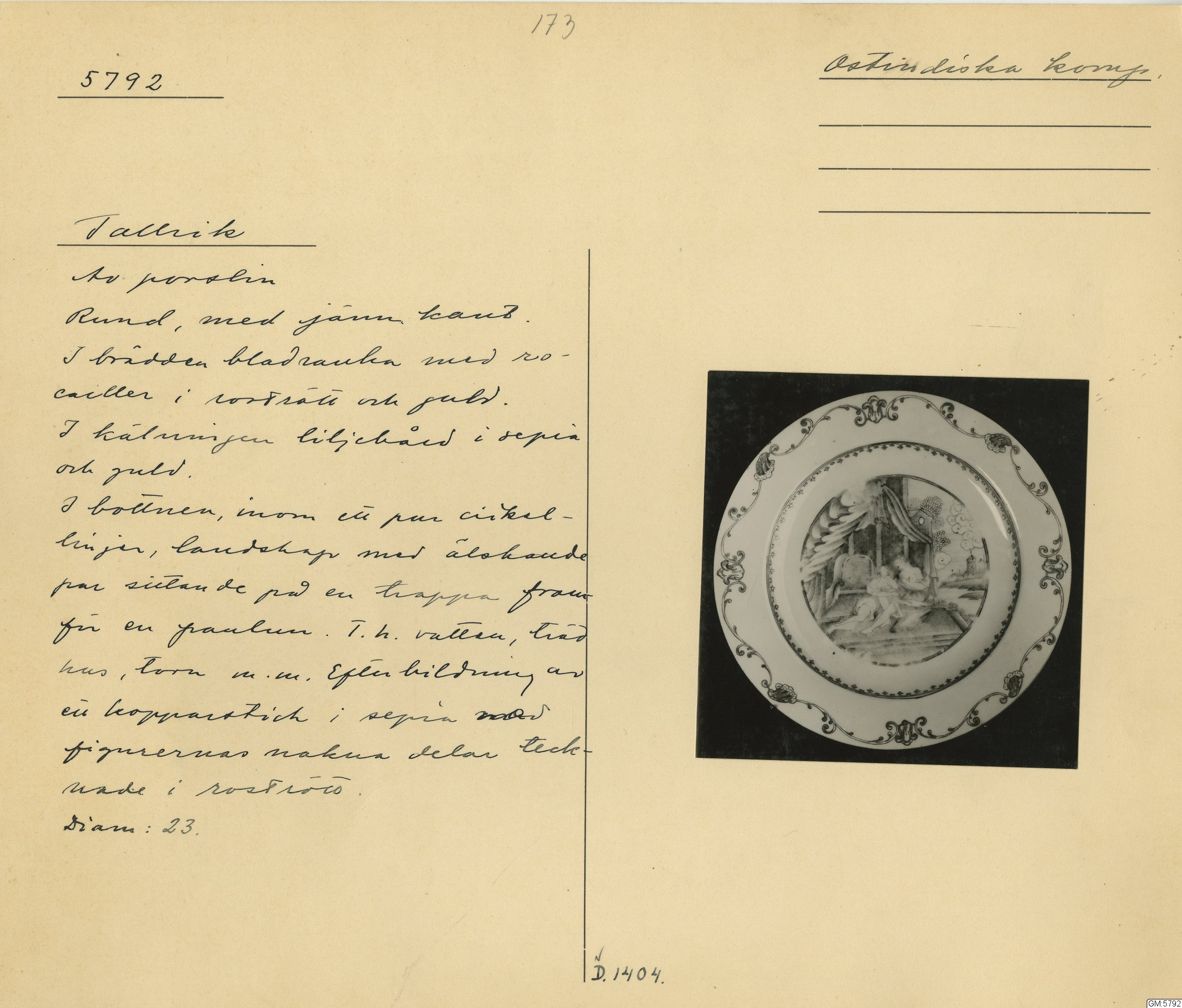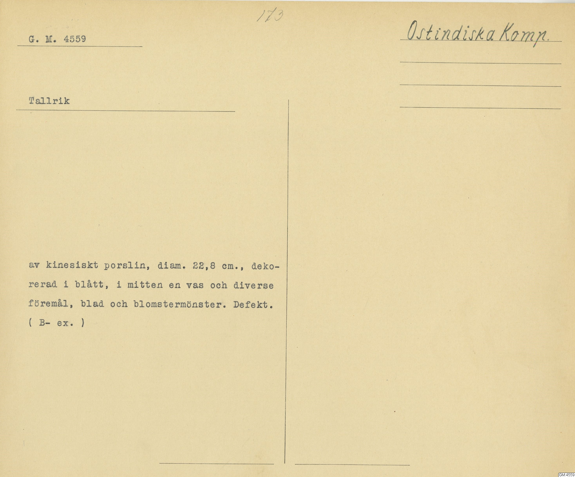 GM katalogkort 173. 18E Porslin Ostindiskt 3. Tallrikar 1
