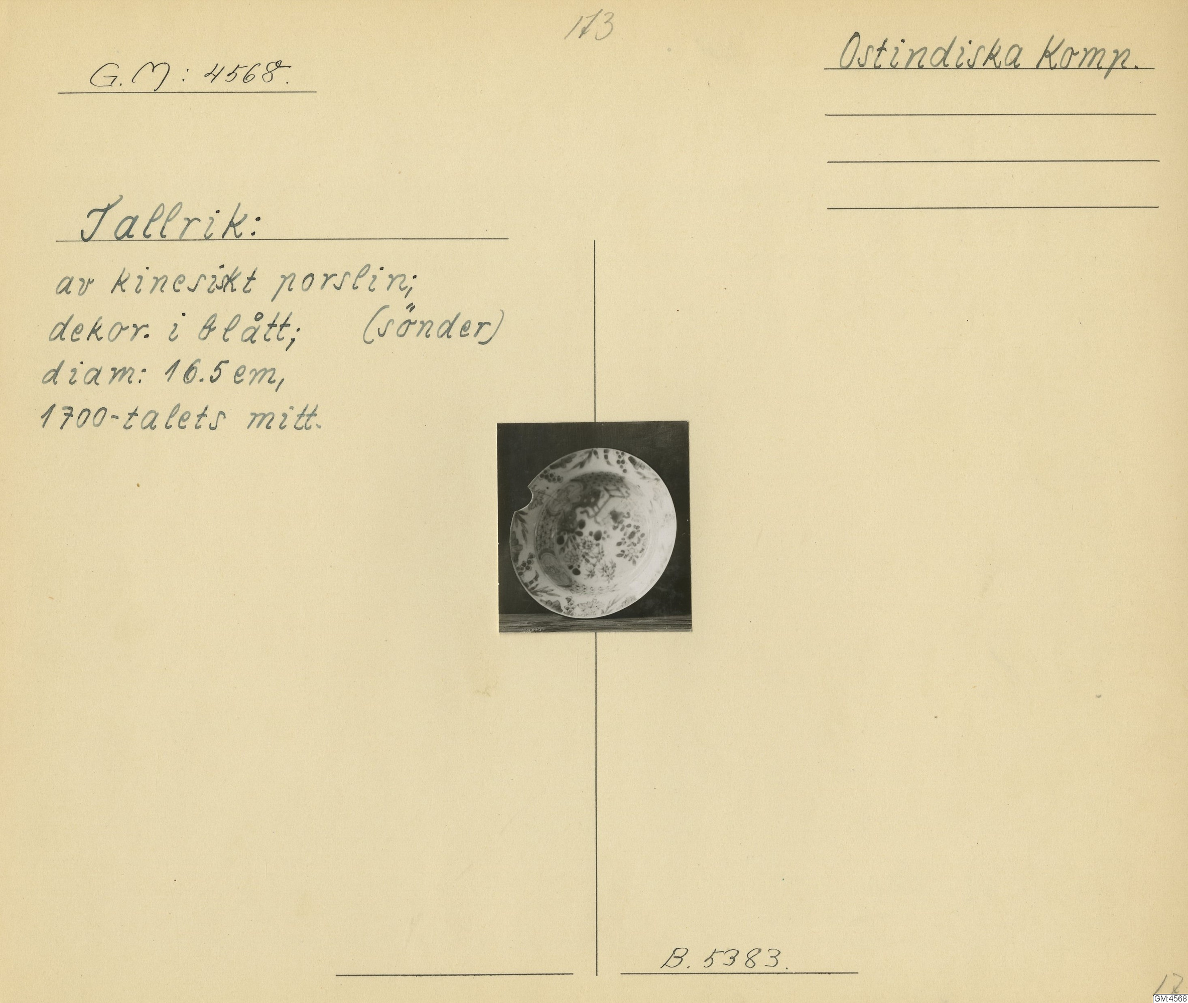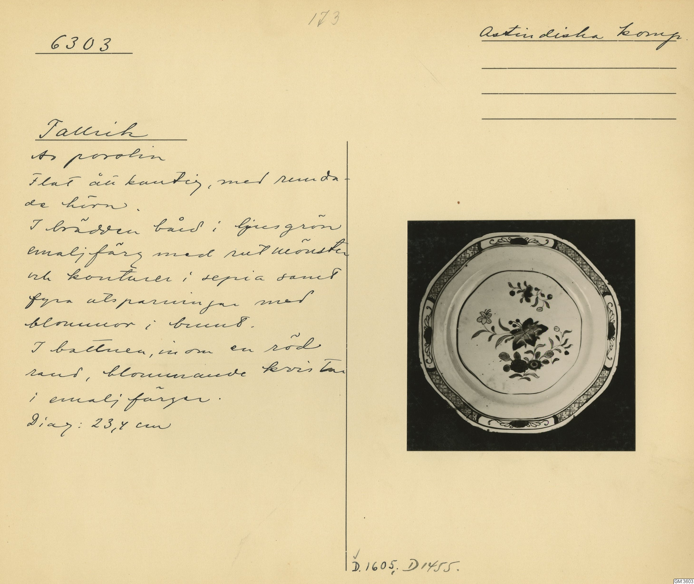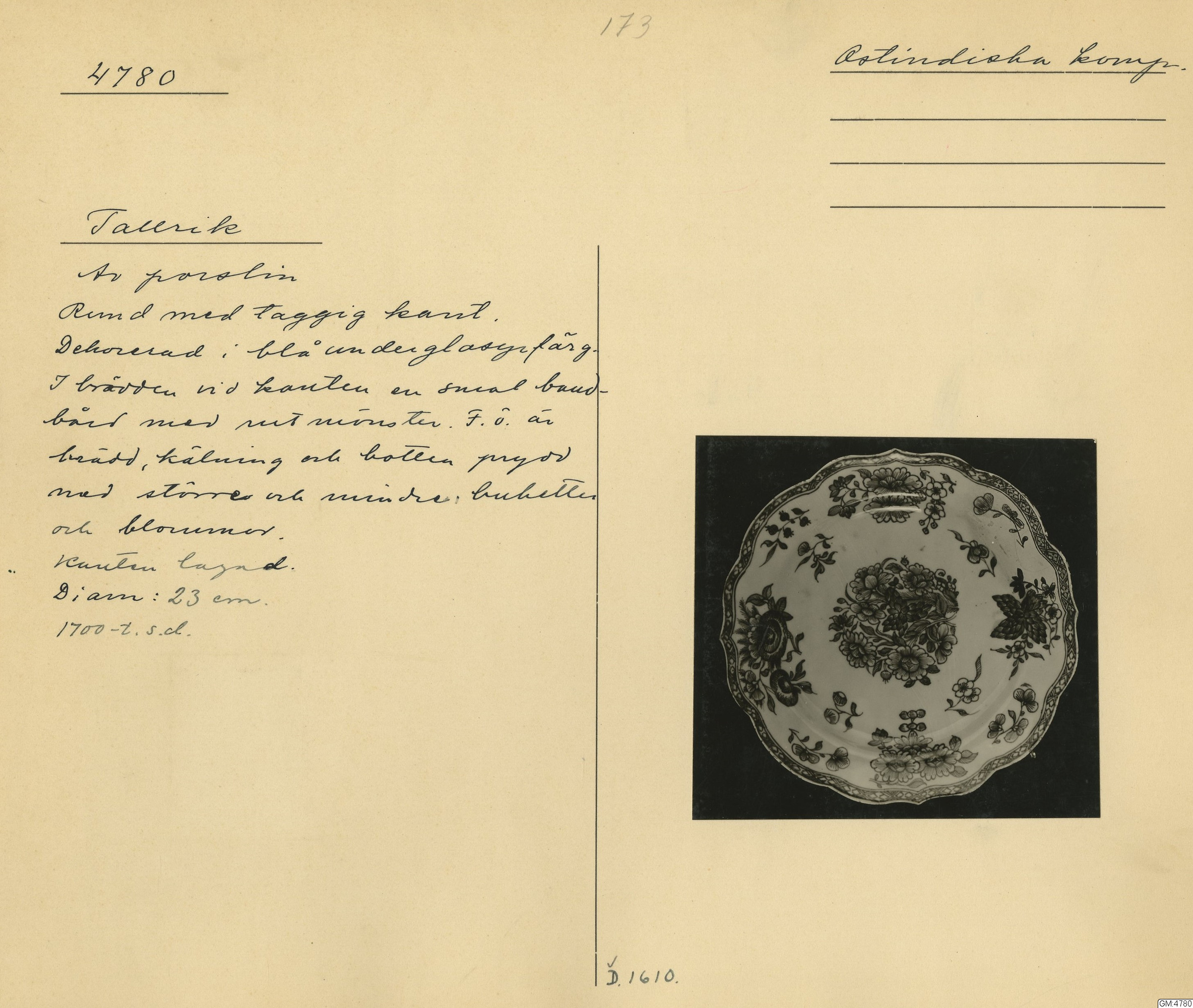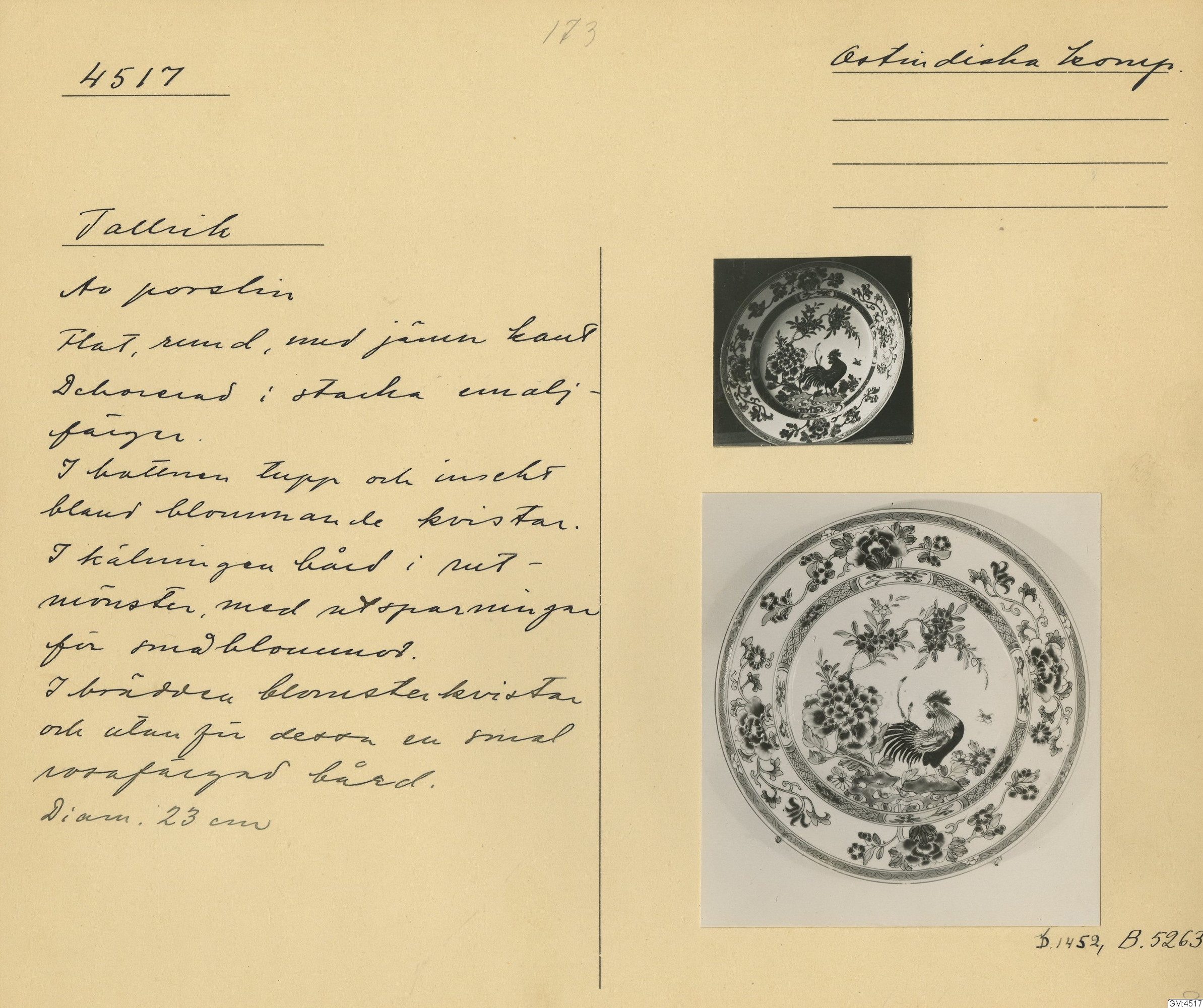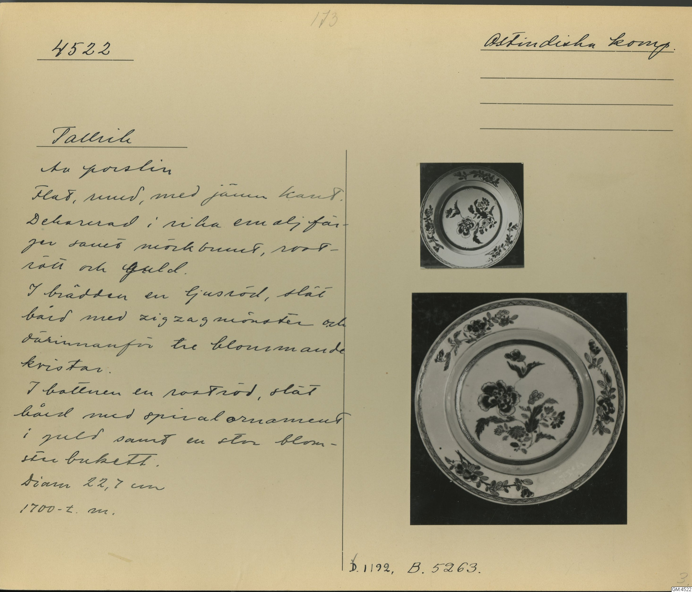 GM katalogkort 173. 18E Porslin Ostindiskt 3. Tallrikar 1