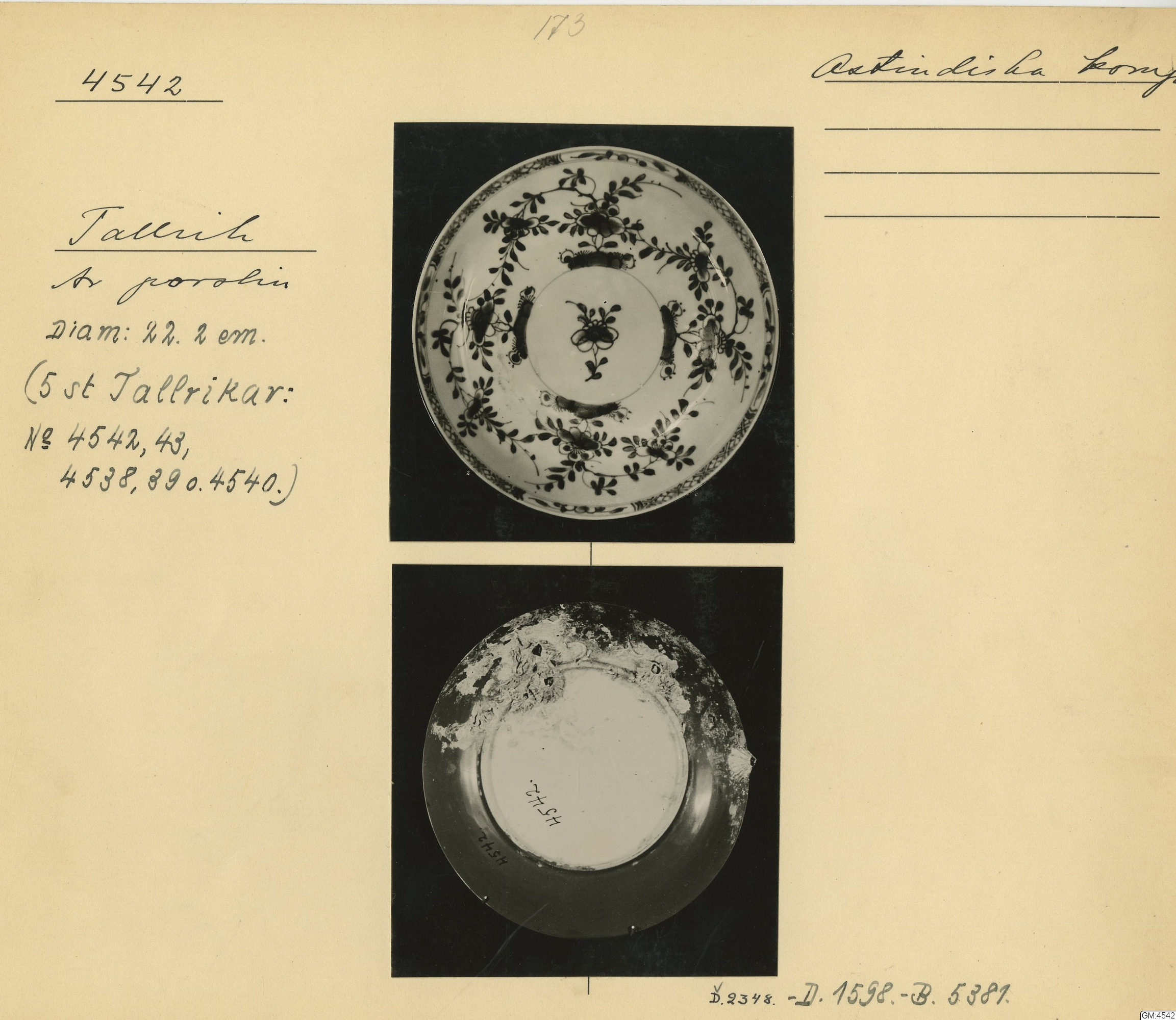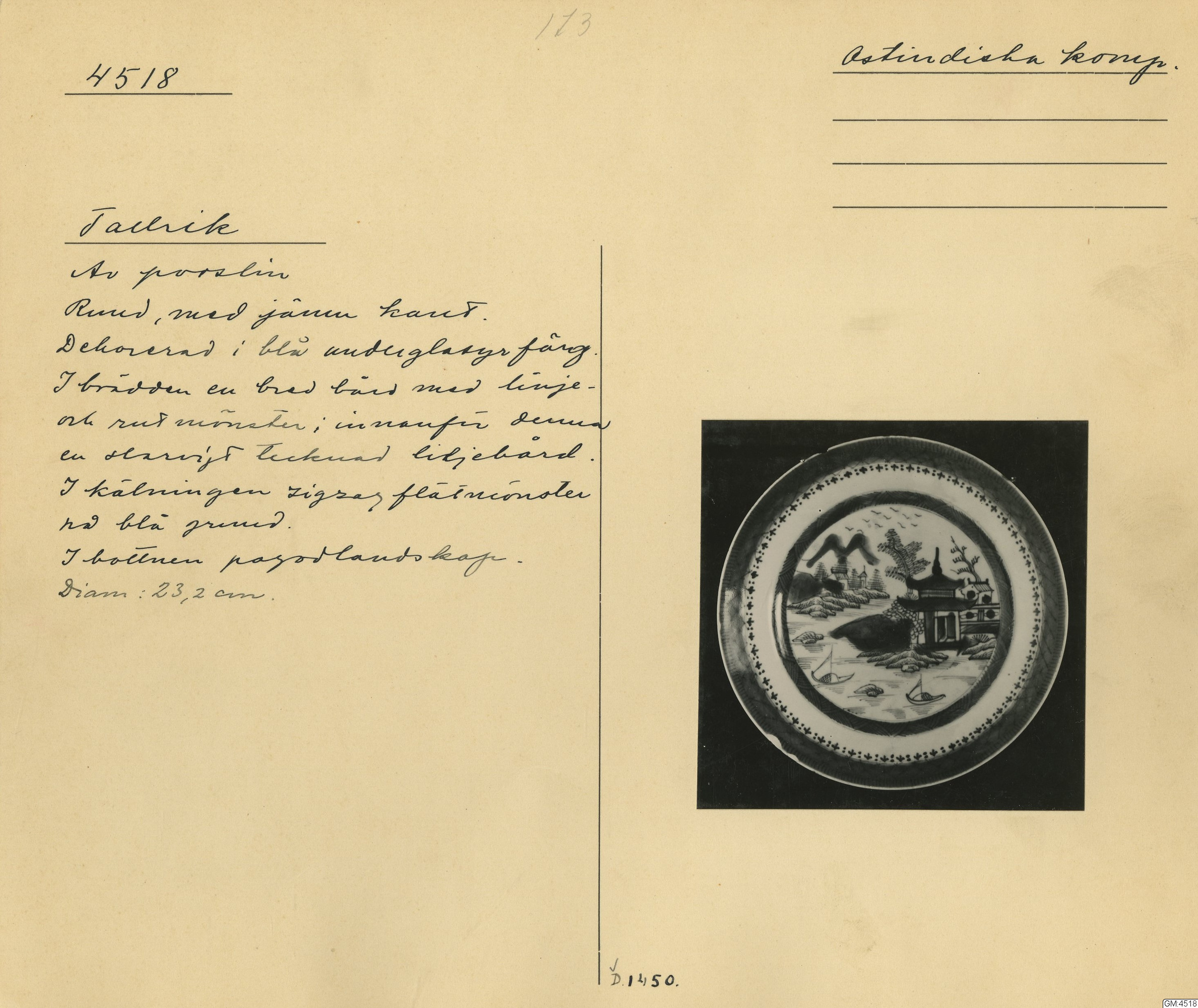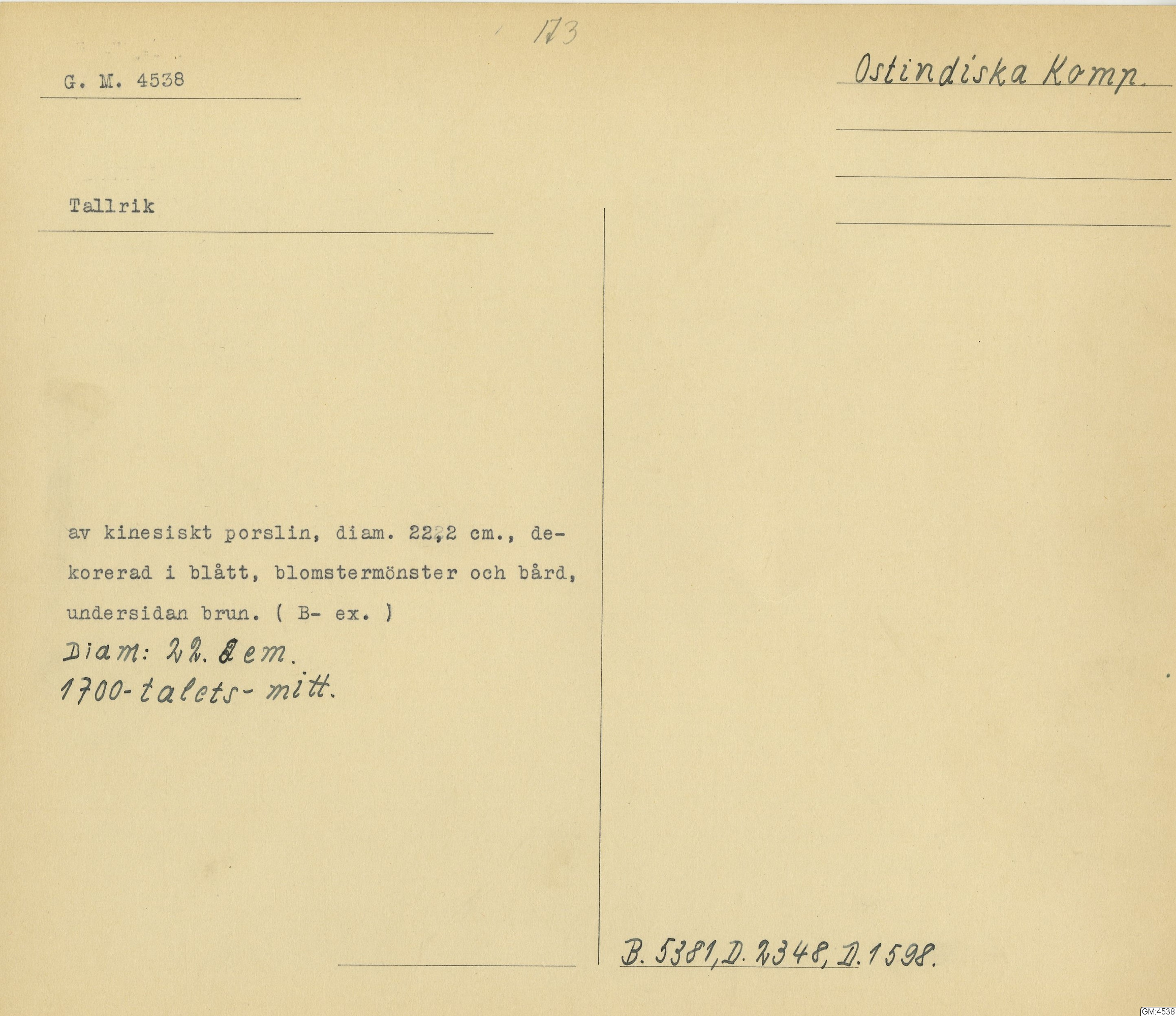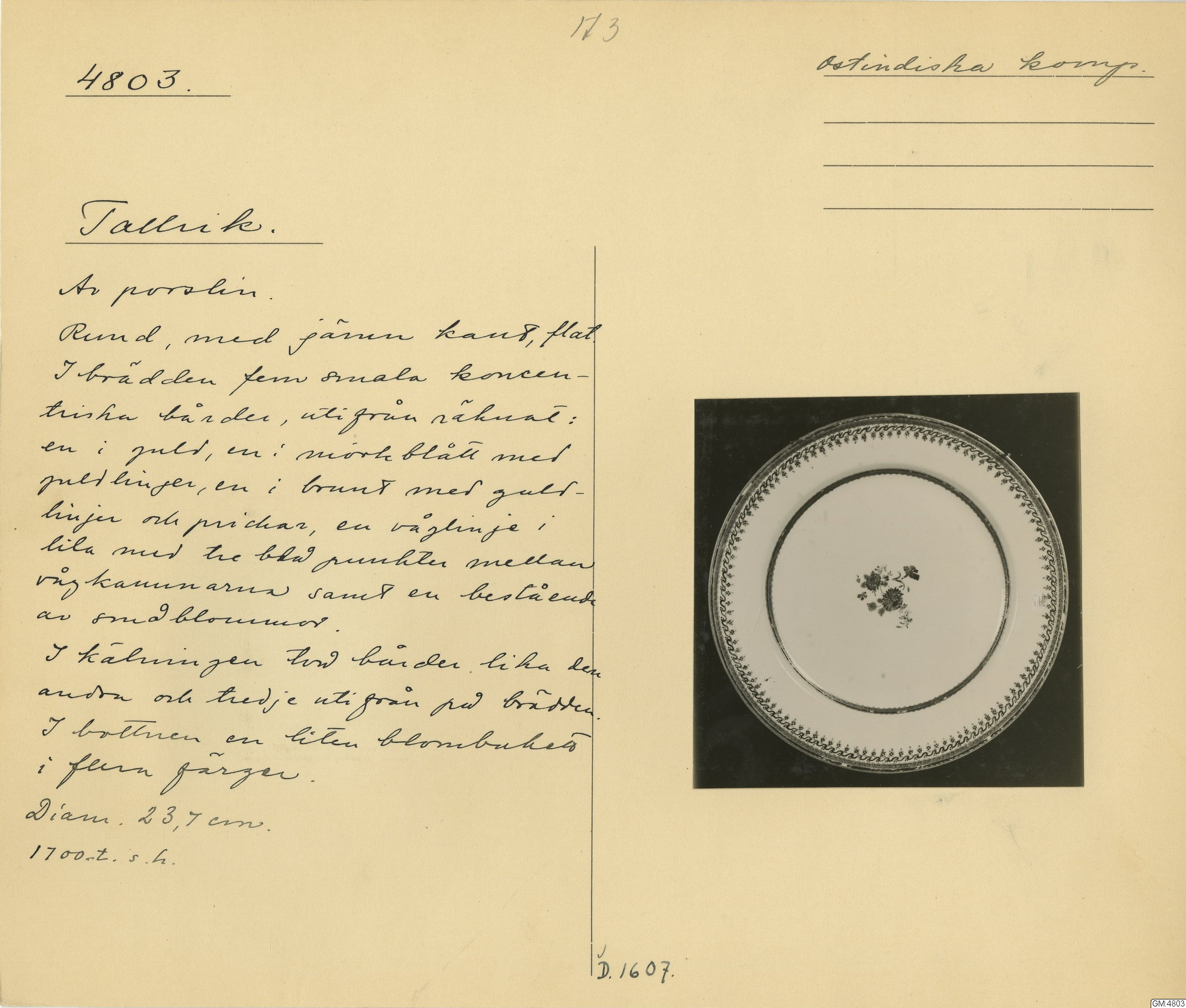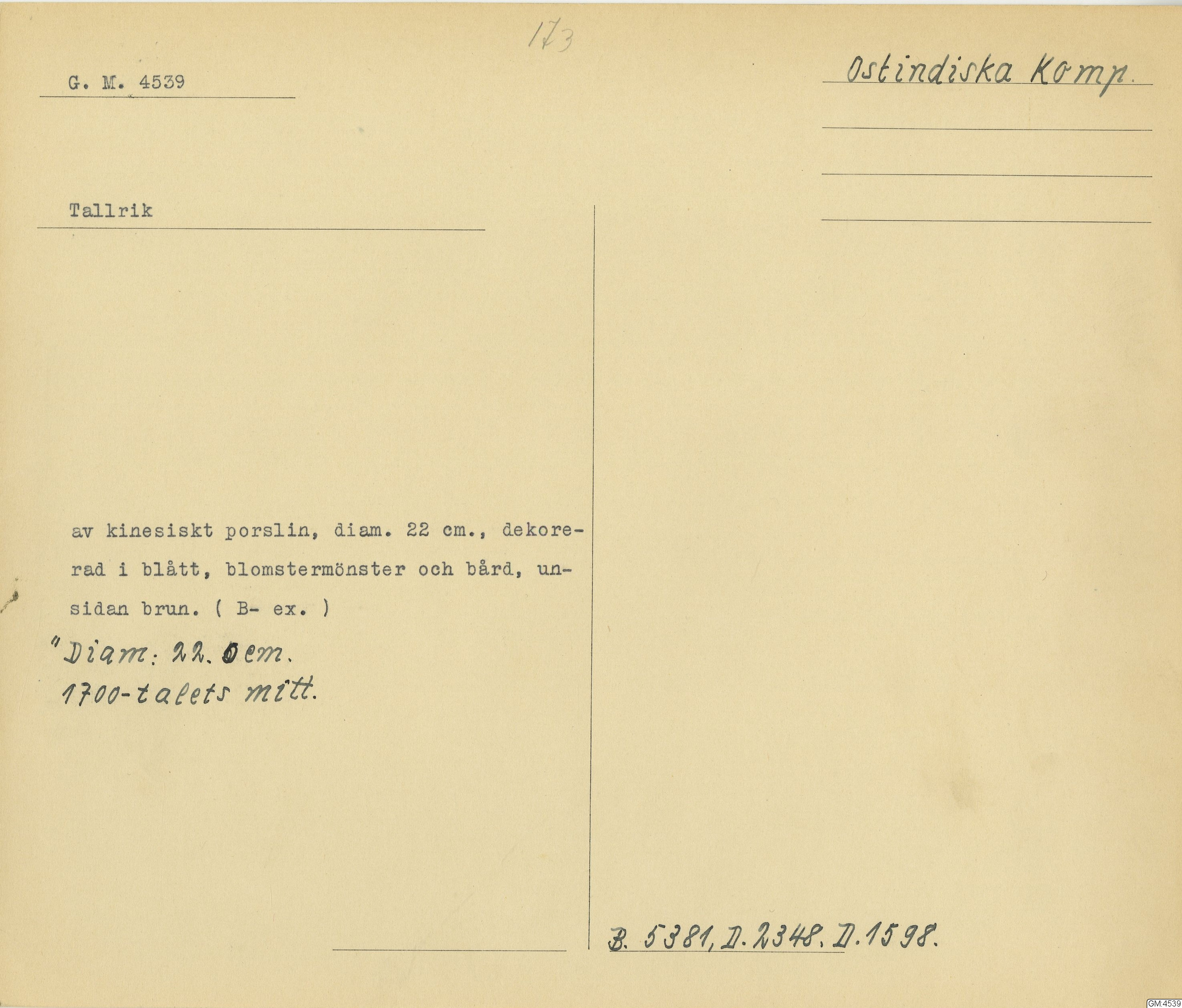 GM katalogkort 173. 18E Porslin Ostindiskt 3. Tallrikar 1