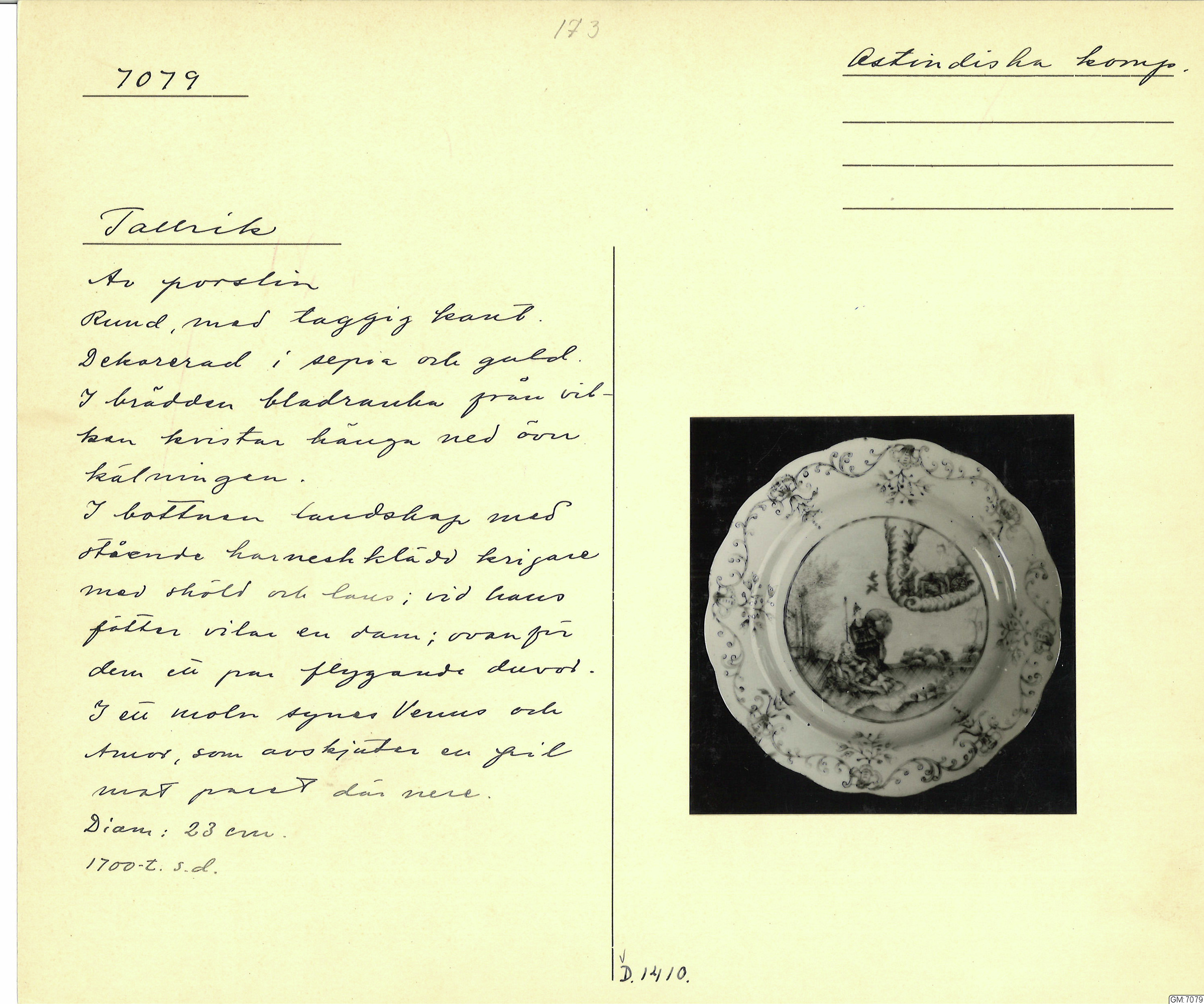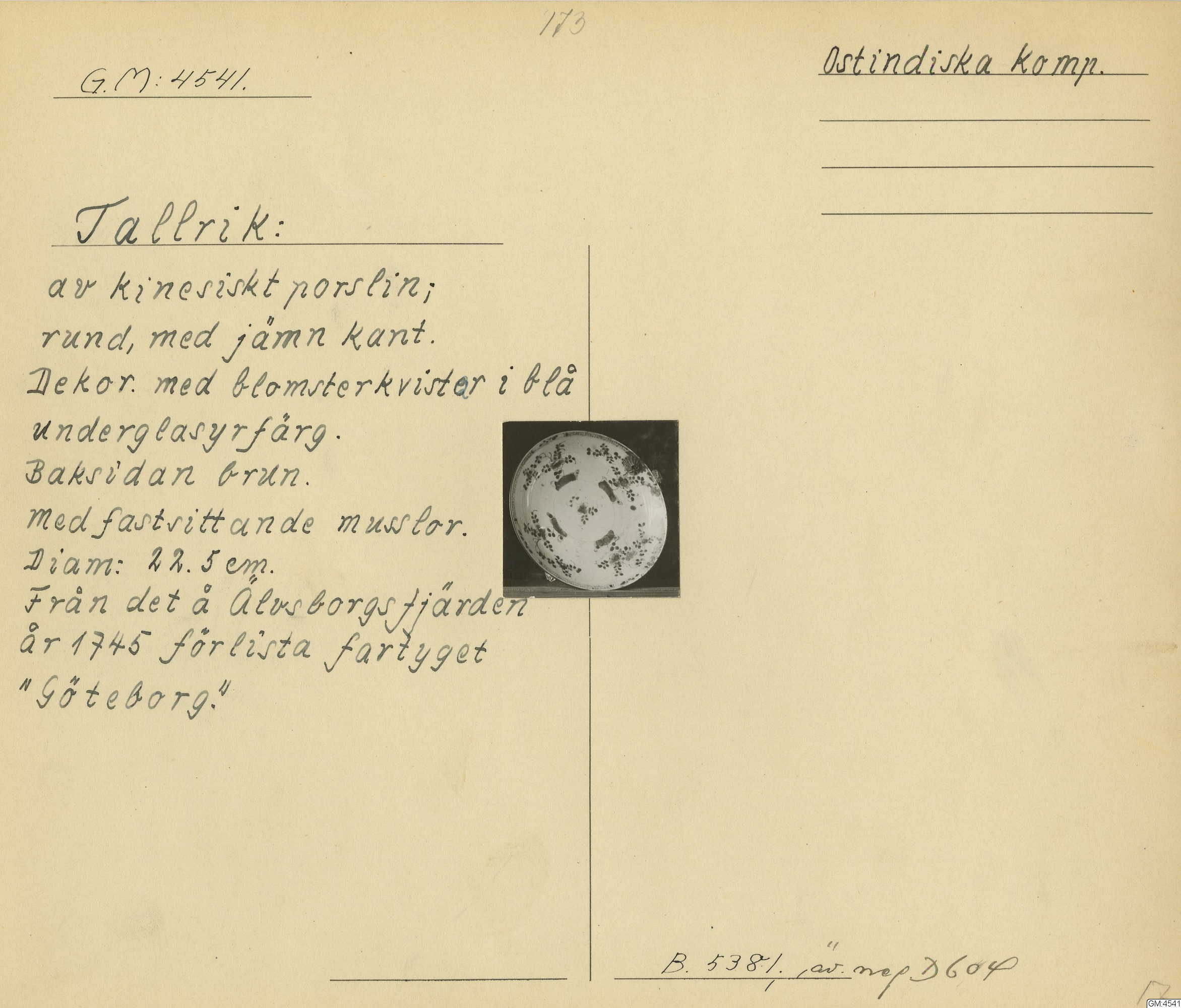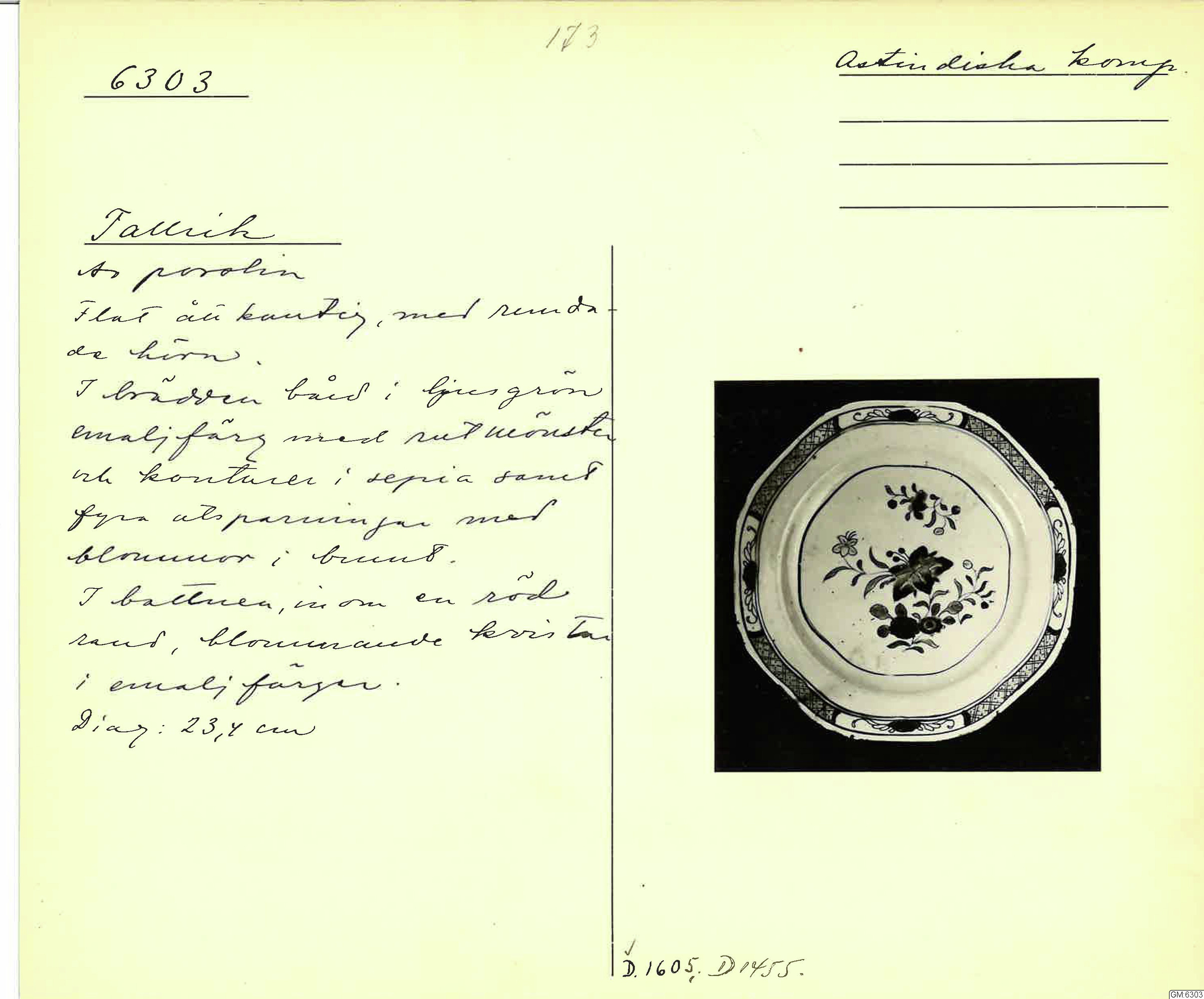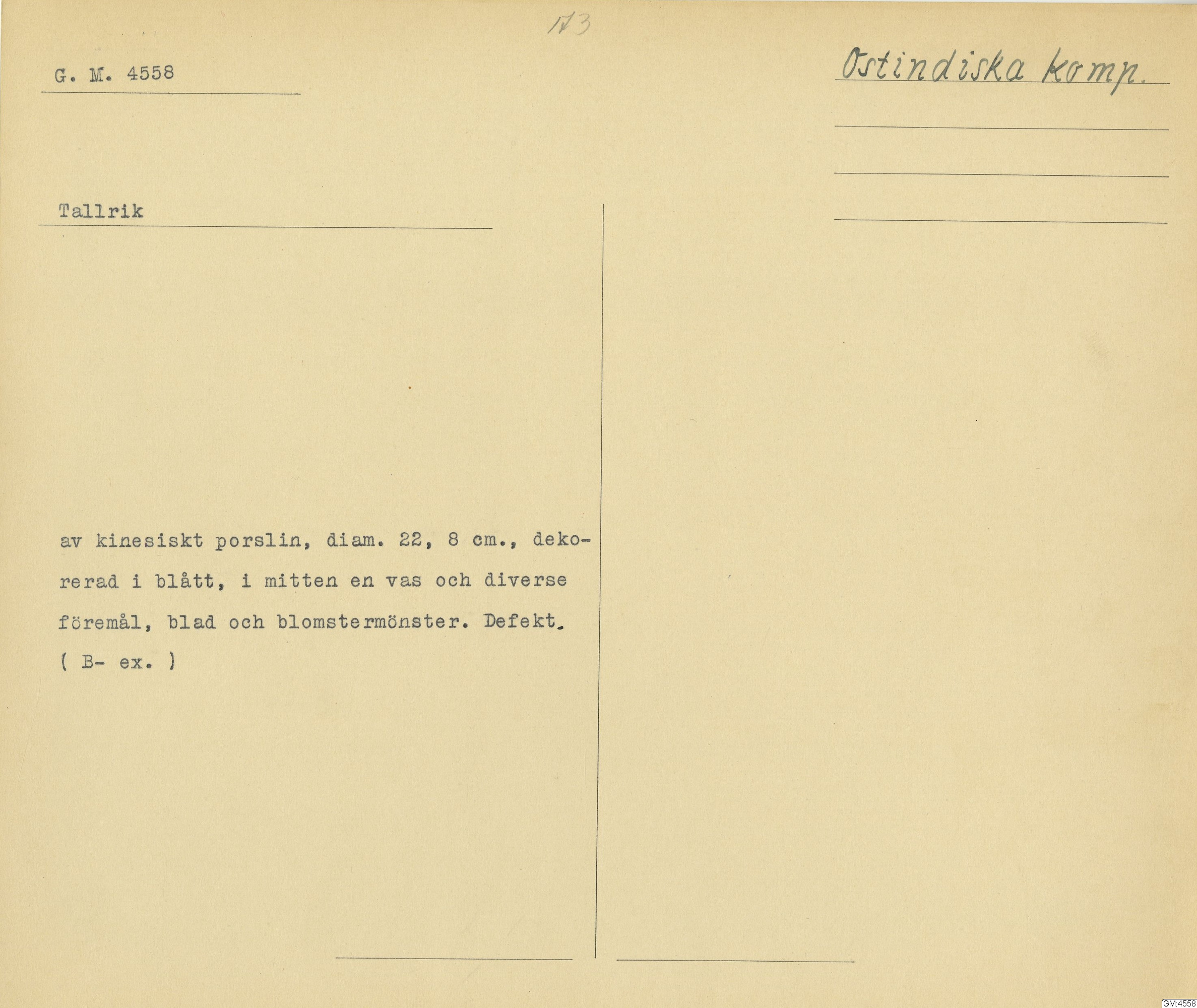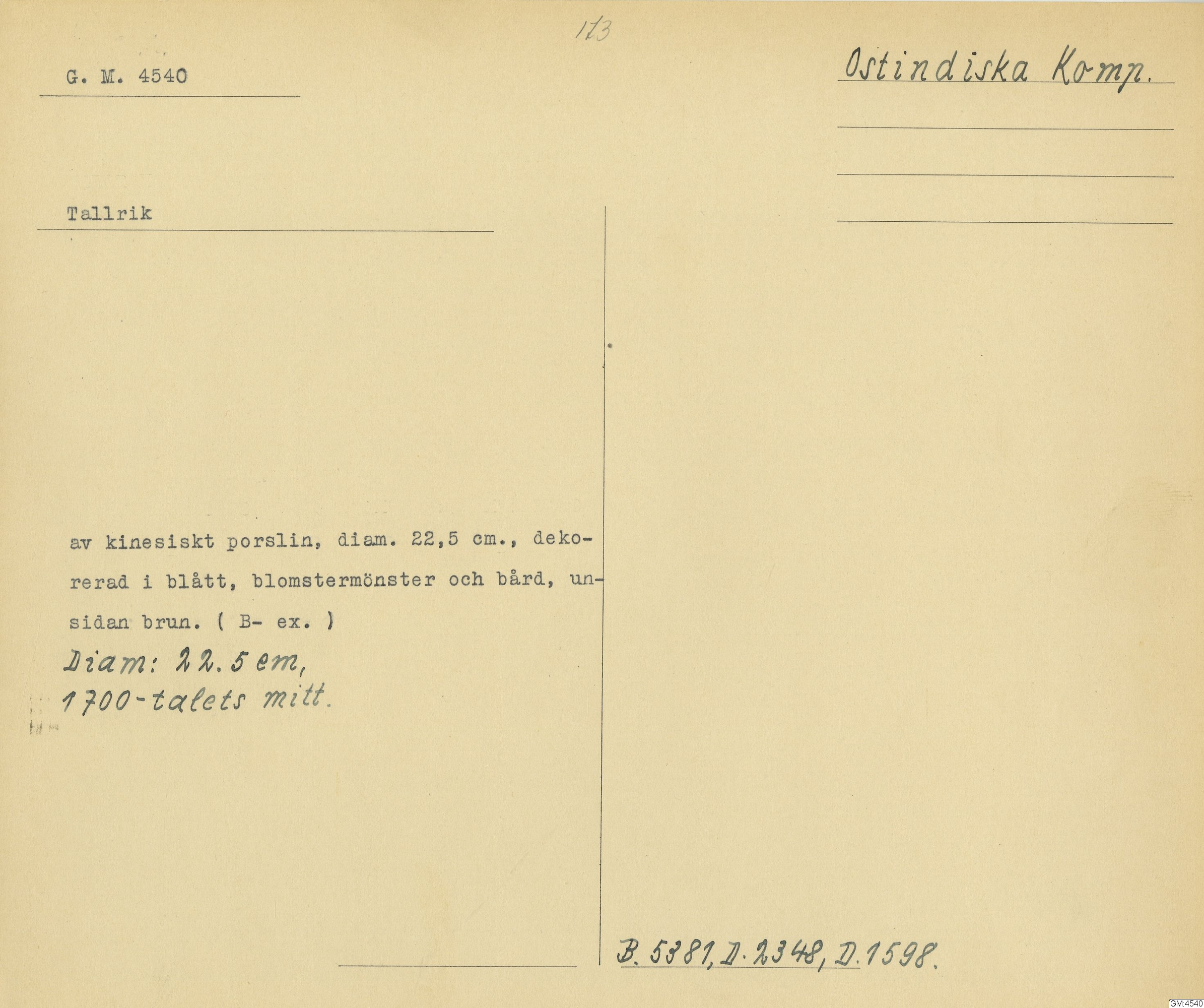 GM katalogkort 173. 18E Porslin Ostindiskt 3. Tallrikar 1