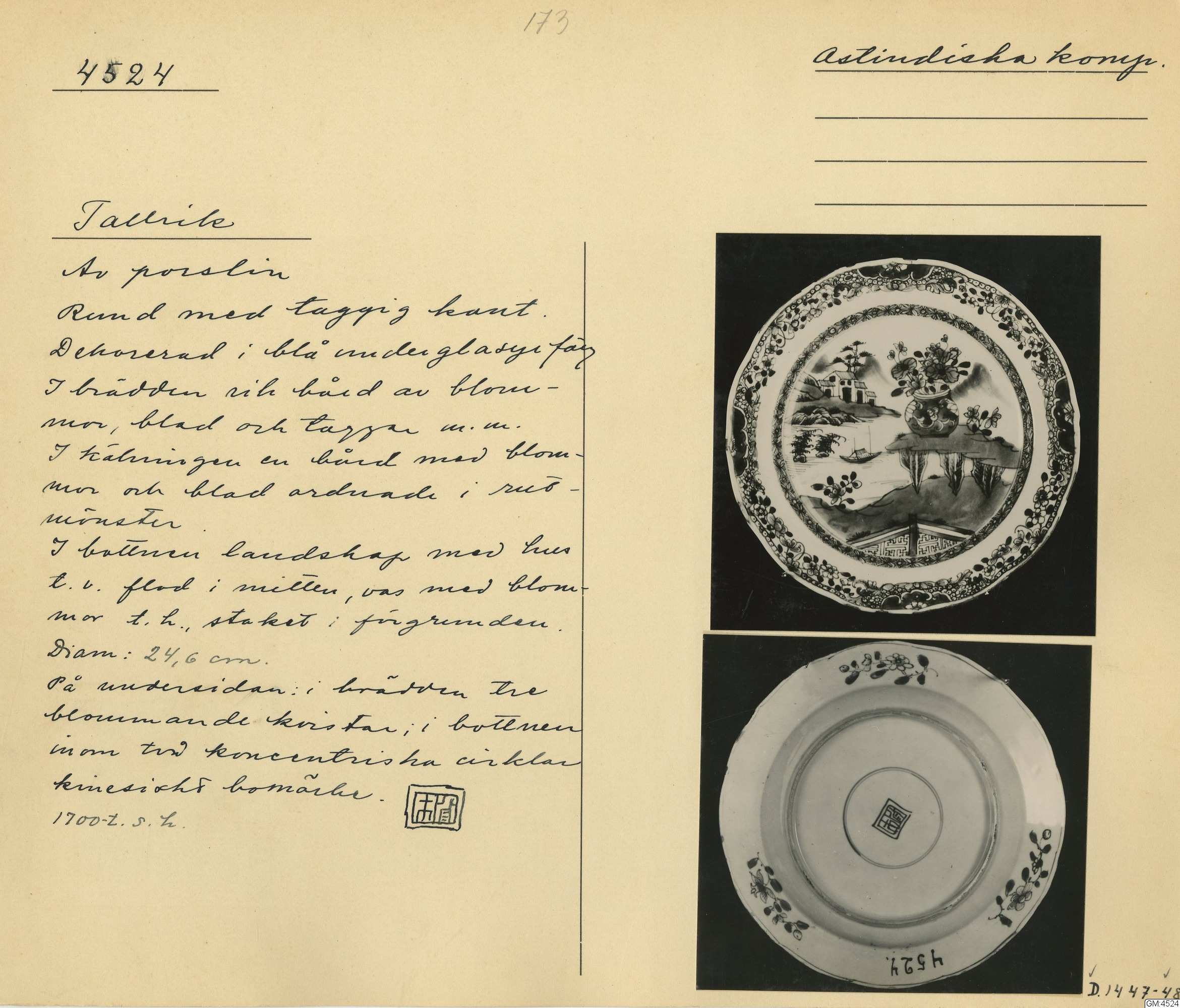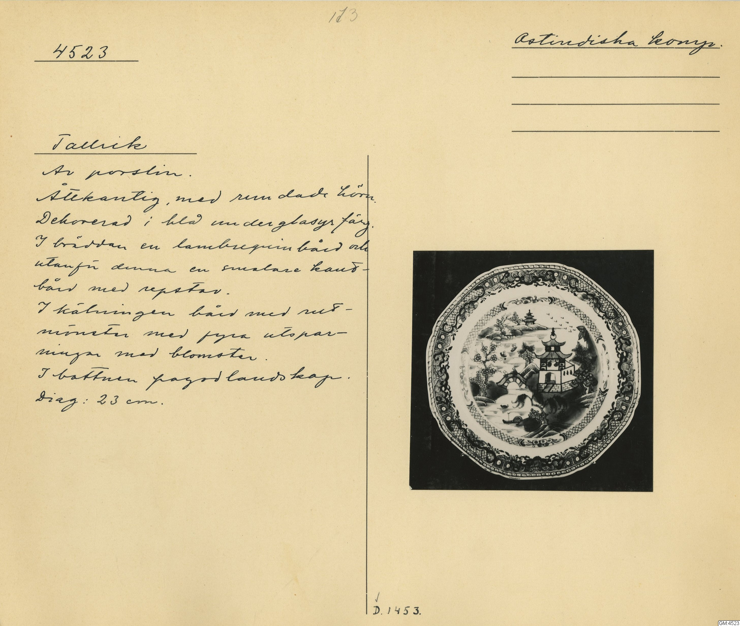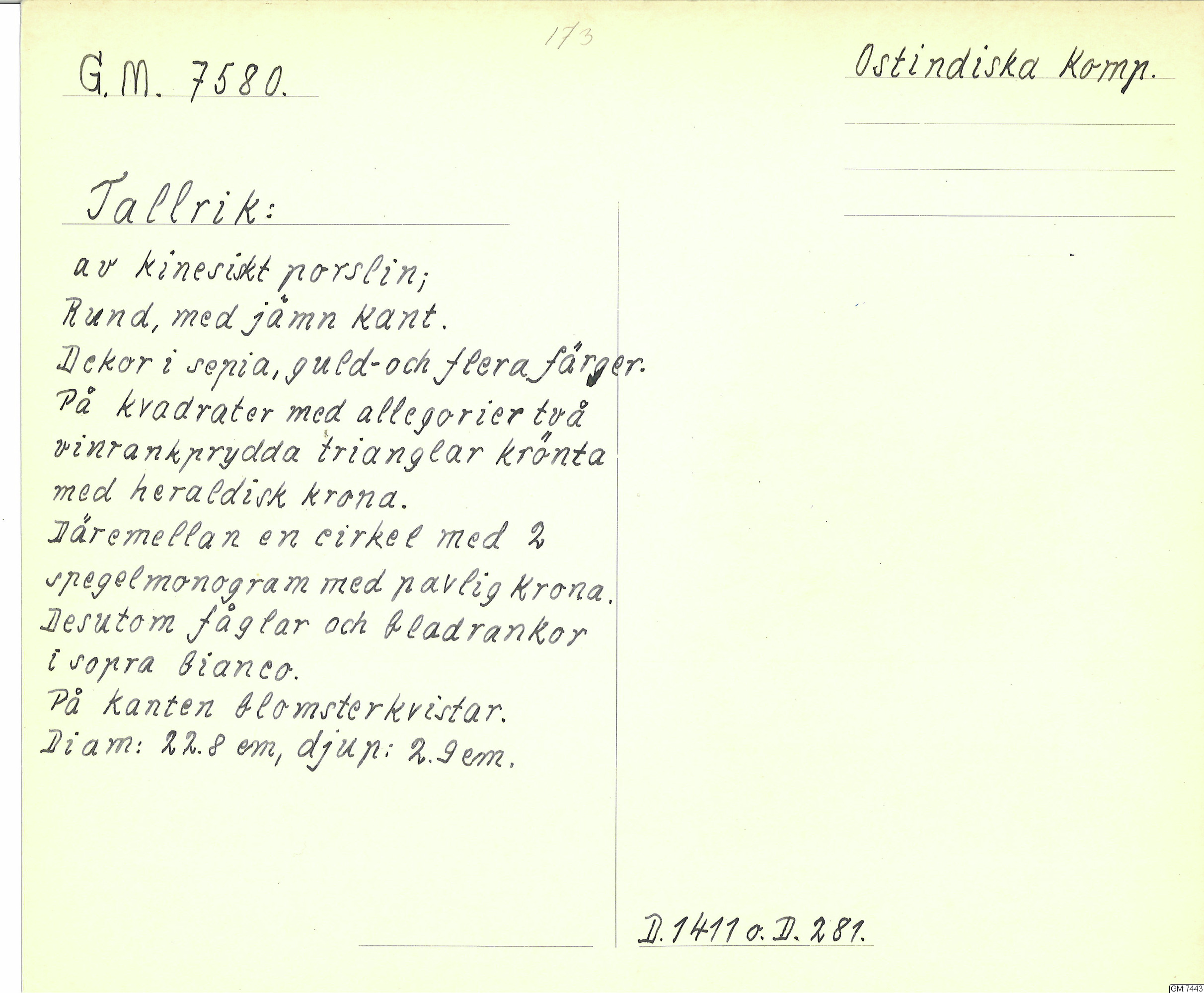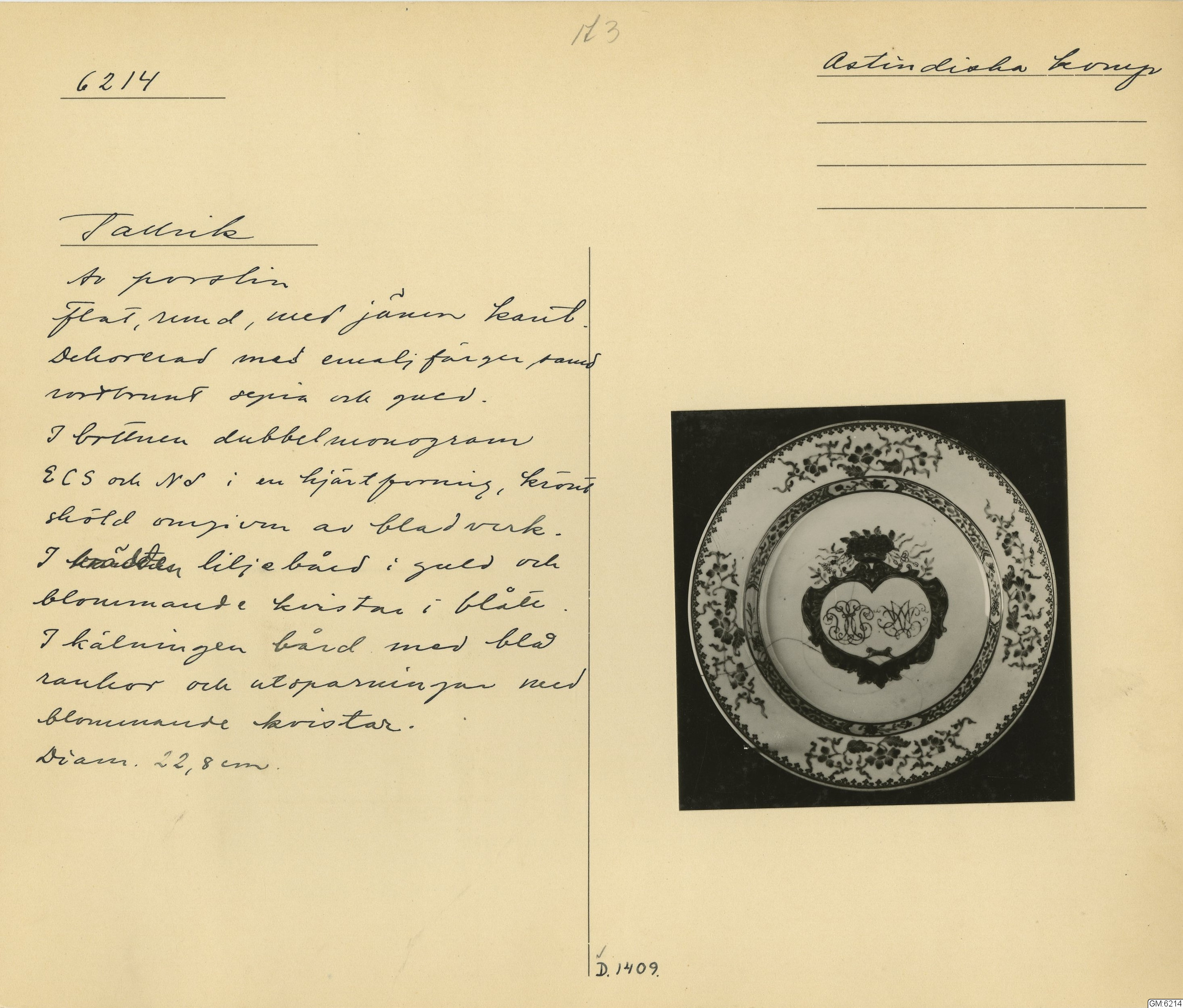 GM katalogkort 173. 18E Porslin Ostindiskt 3. Tallrikar 1