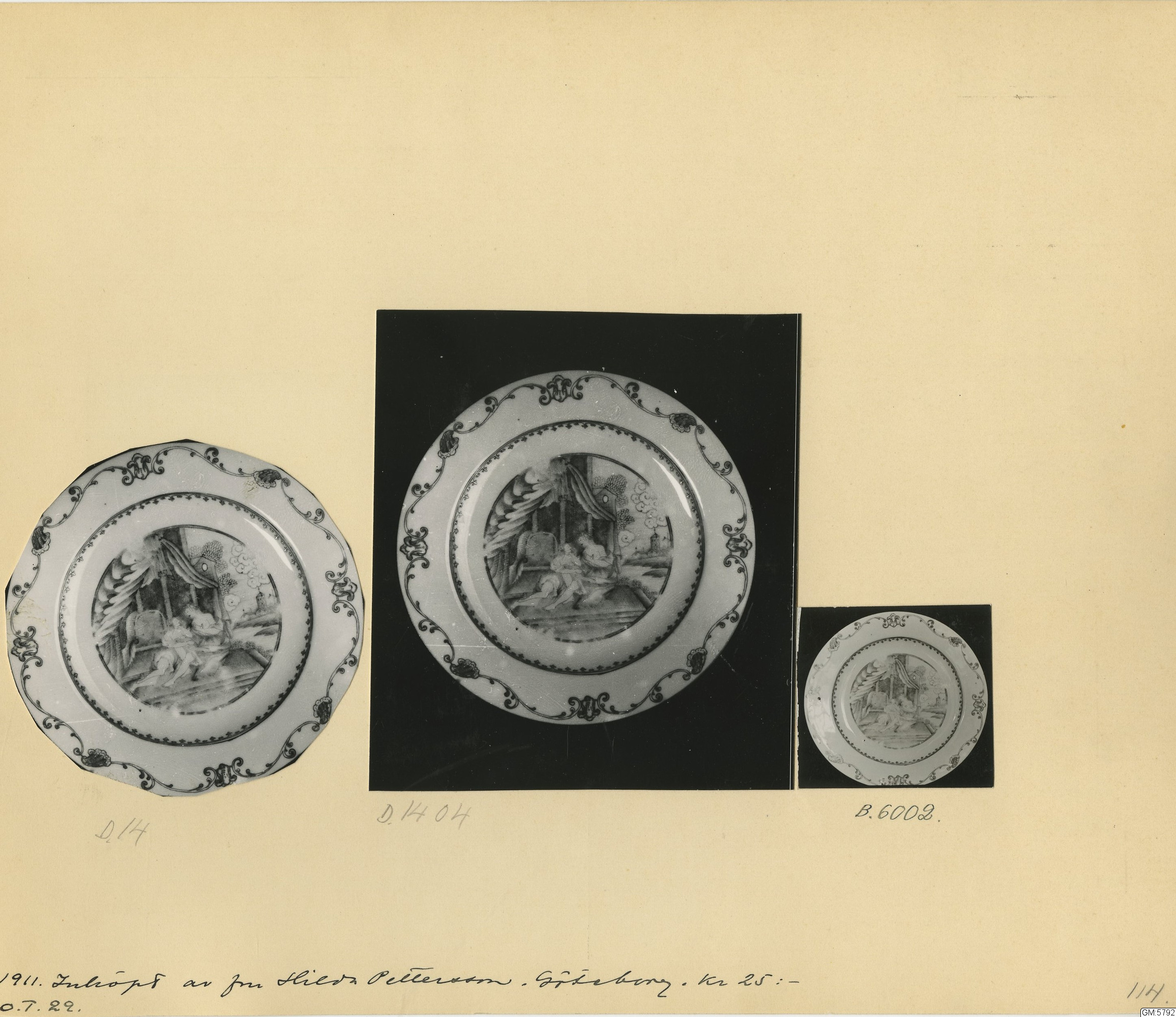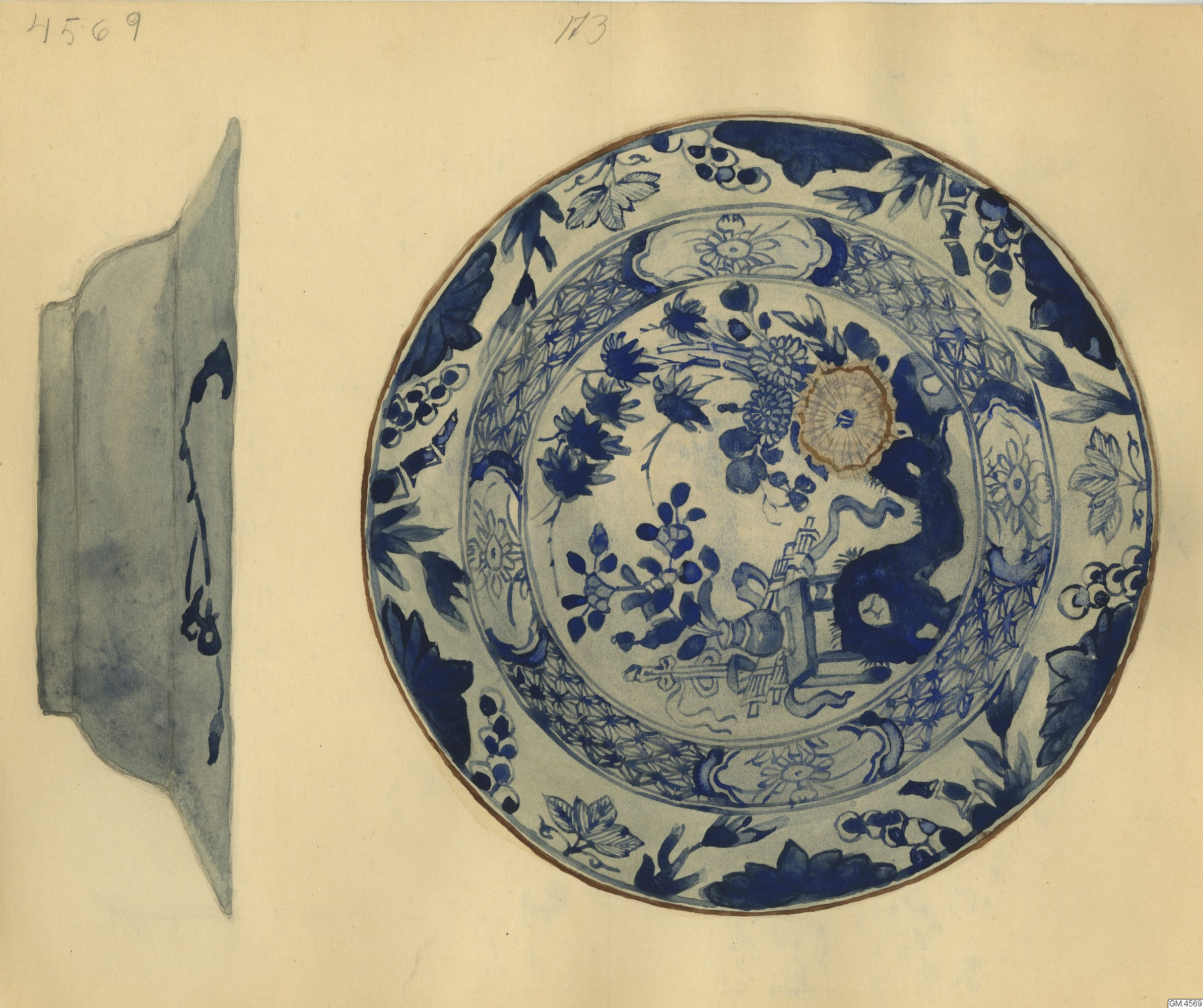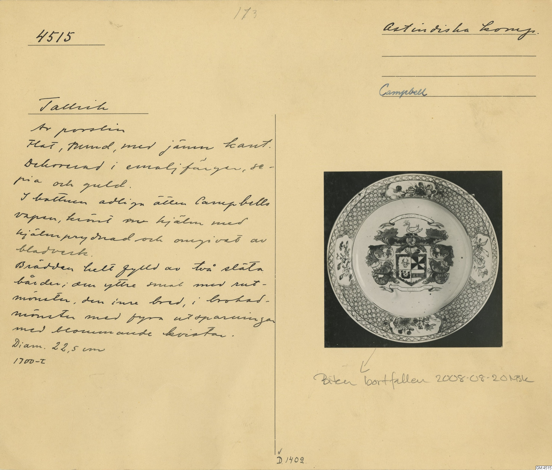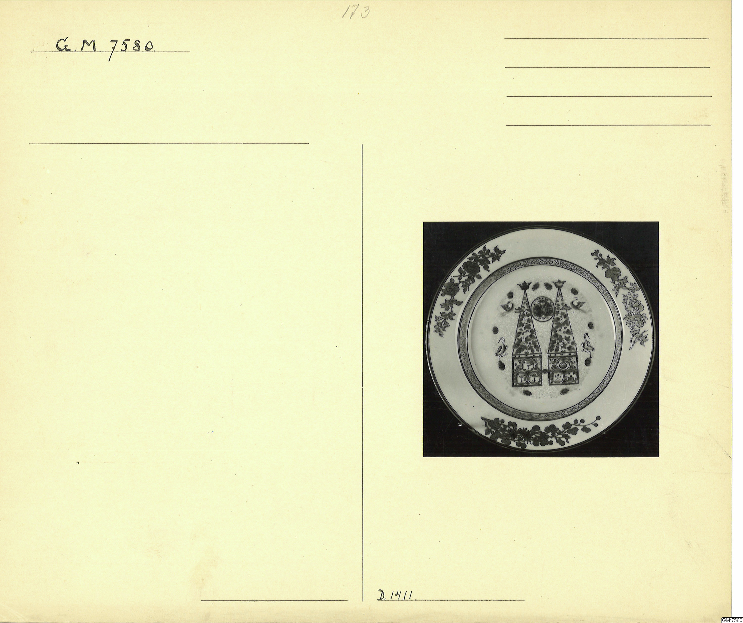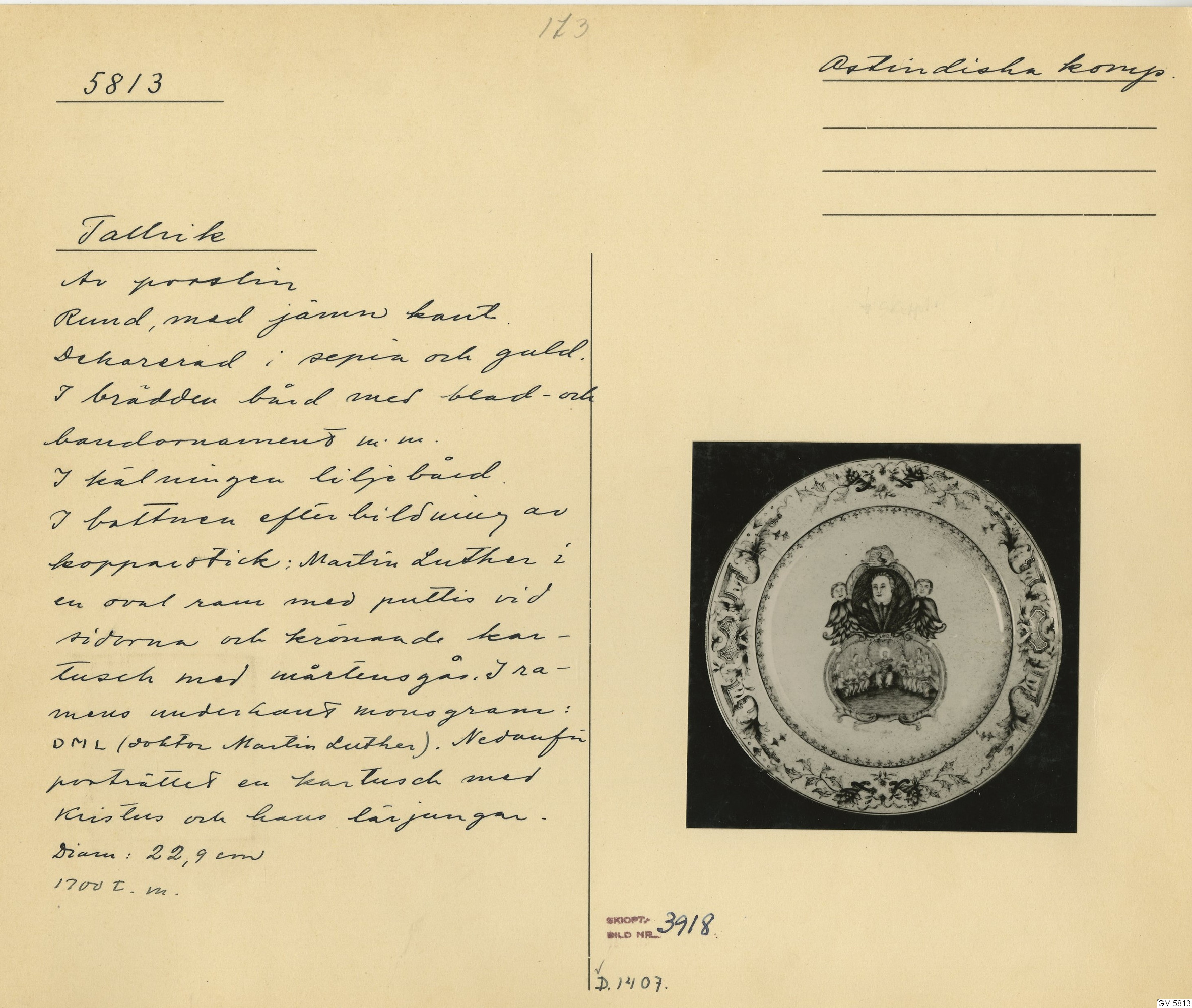 GM katalogkort 173. 18E Porslin Ostindiskt 3. Tallrikar 1