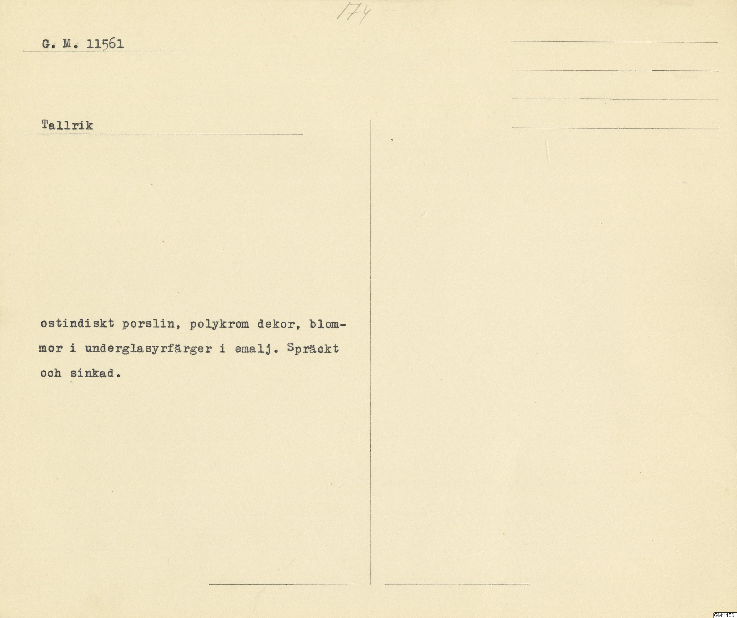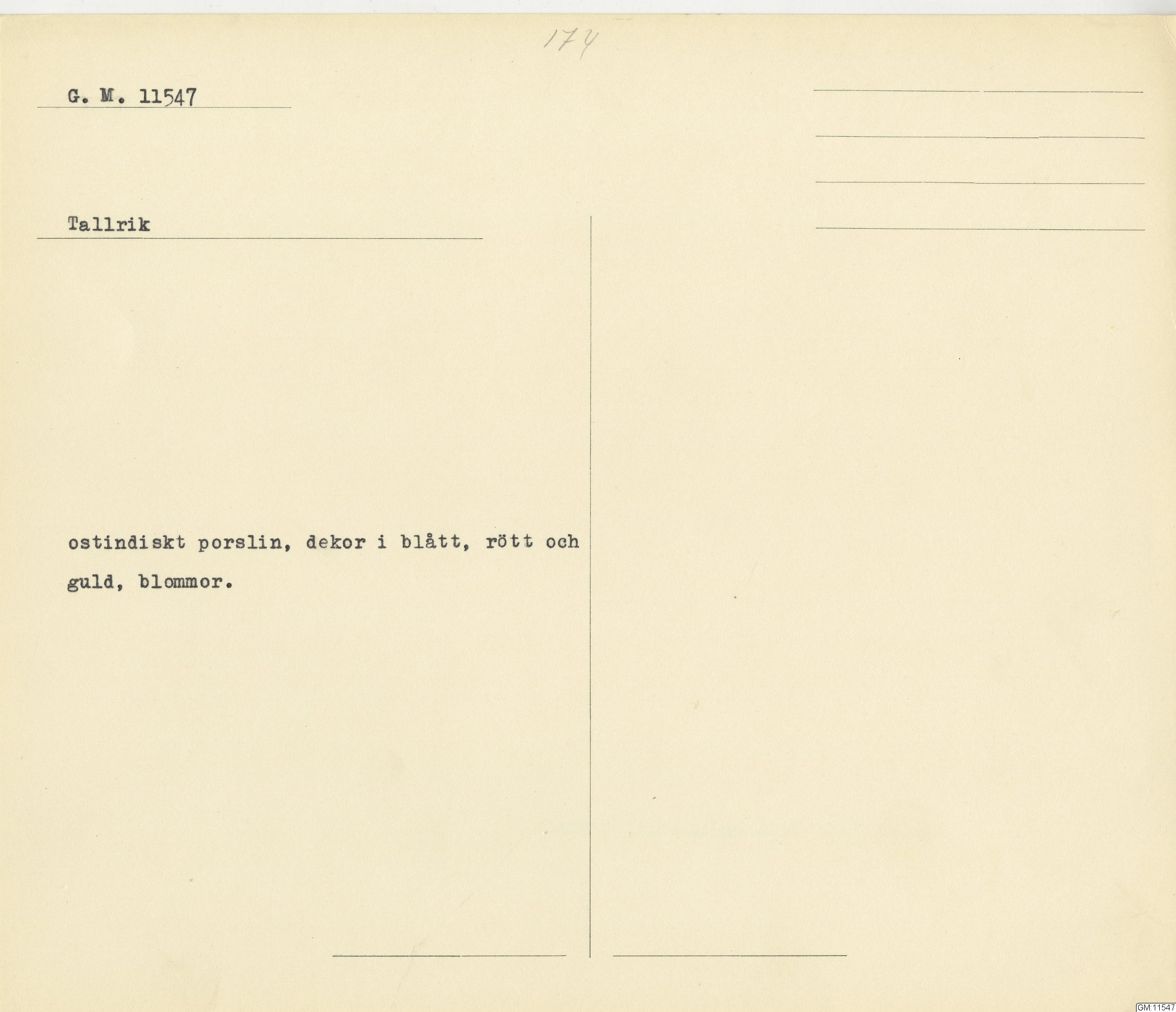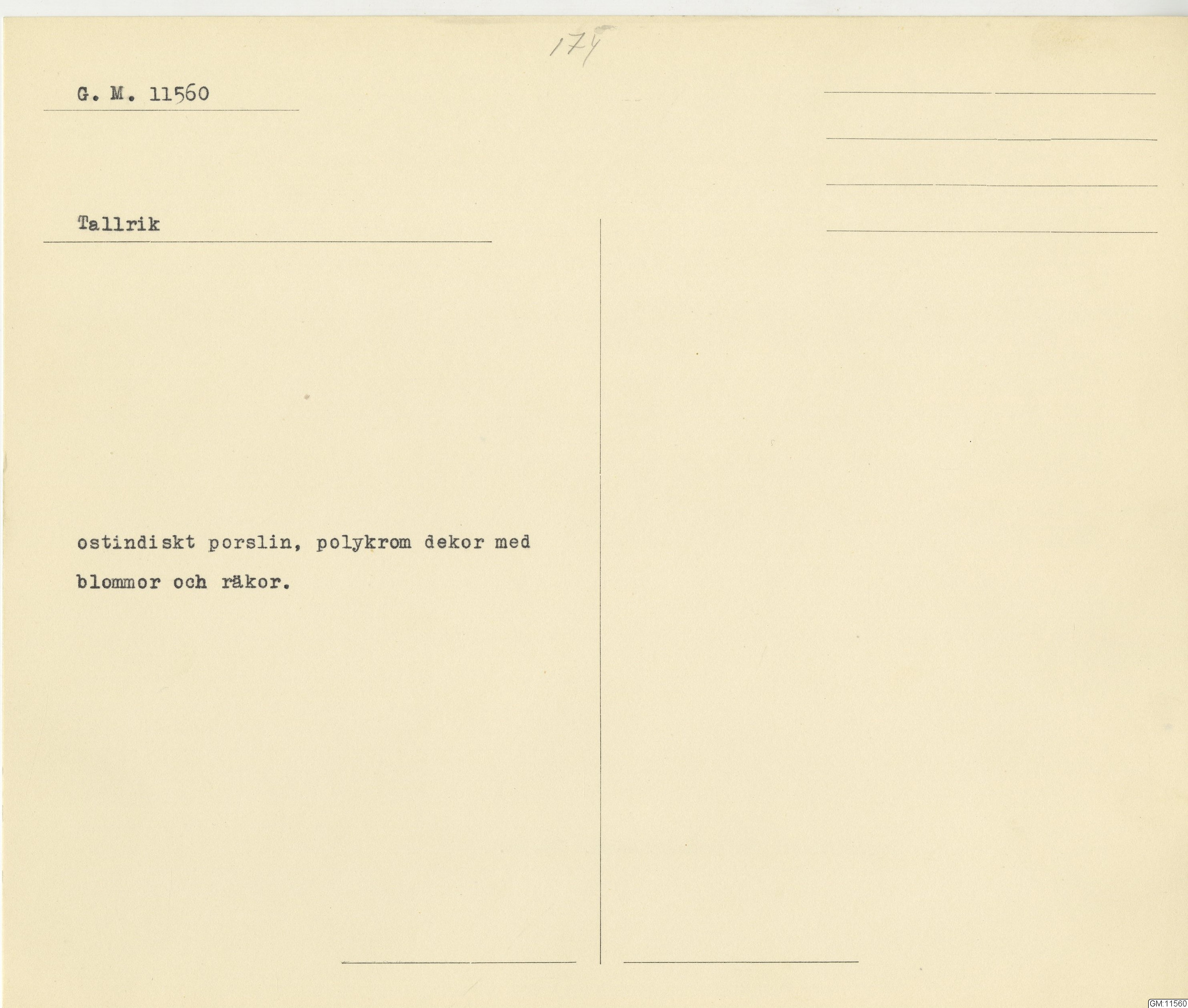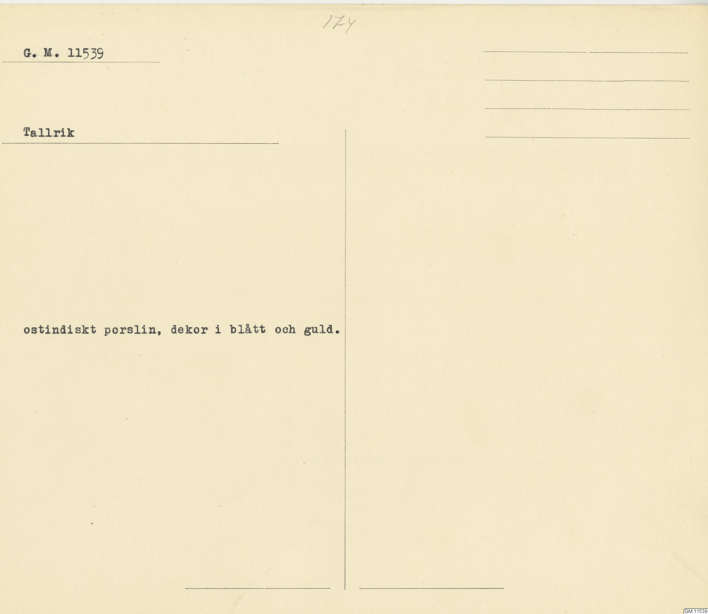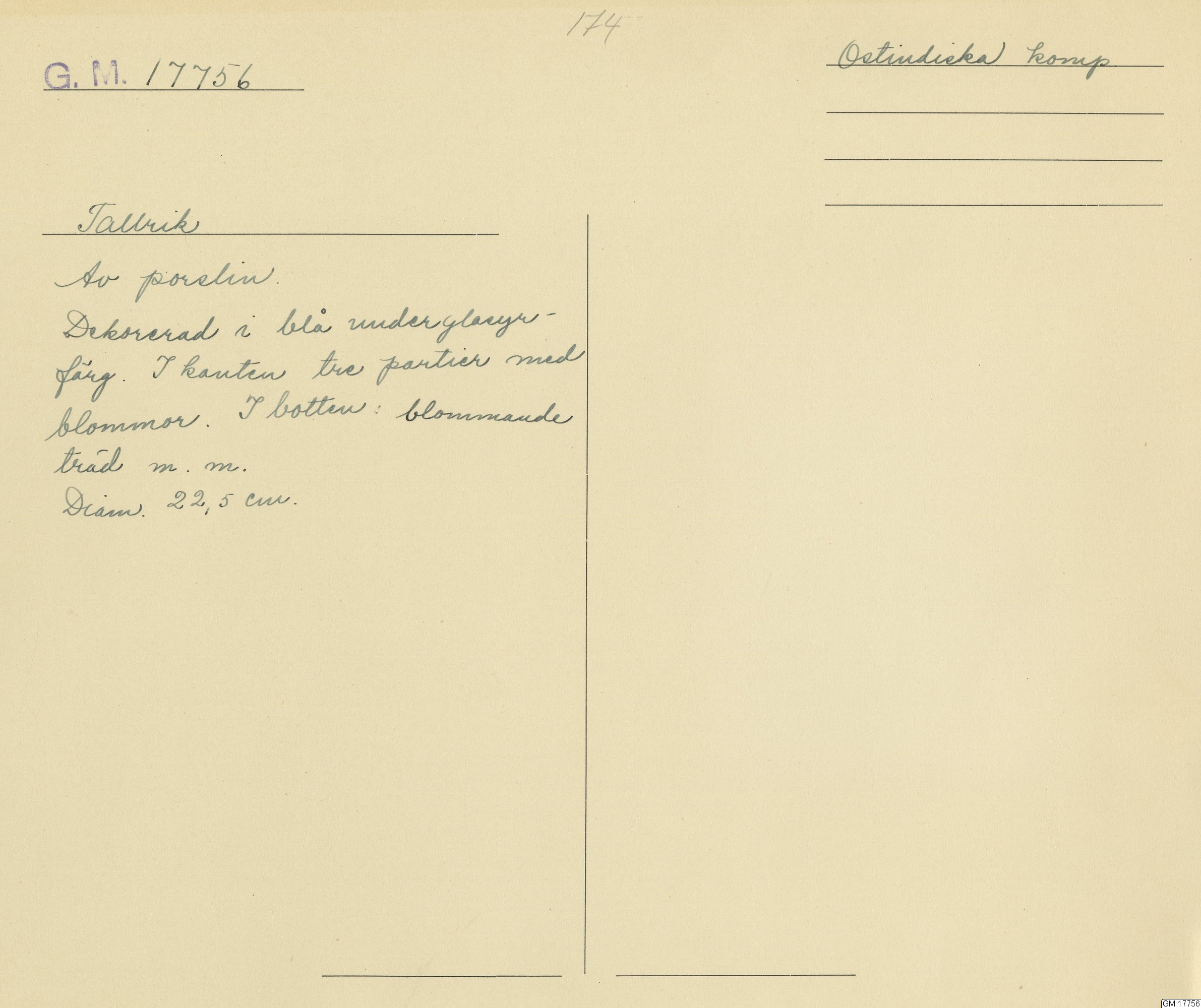 GM katalogkort 174. 18E Porslin Ostindiskt 4. tallrikar 2