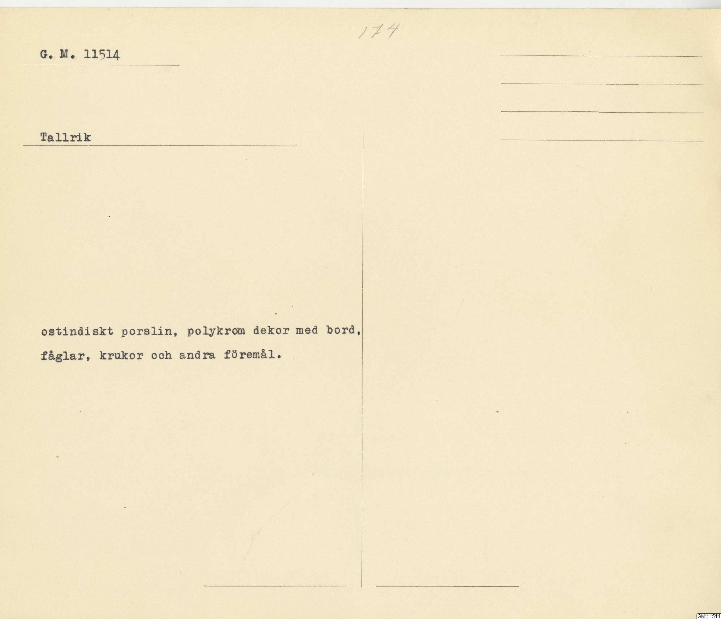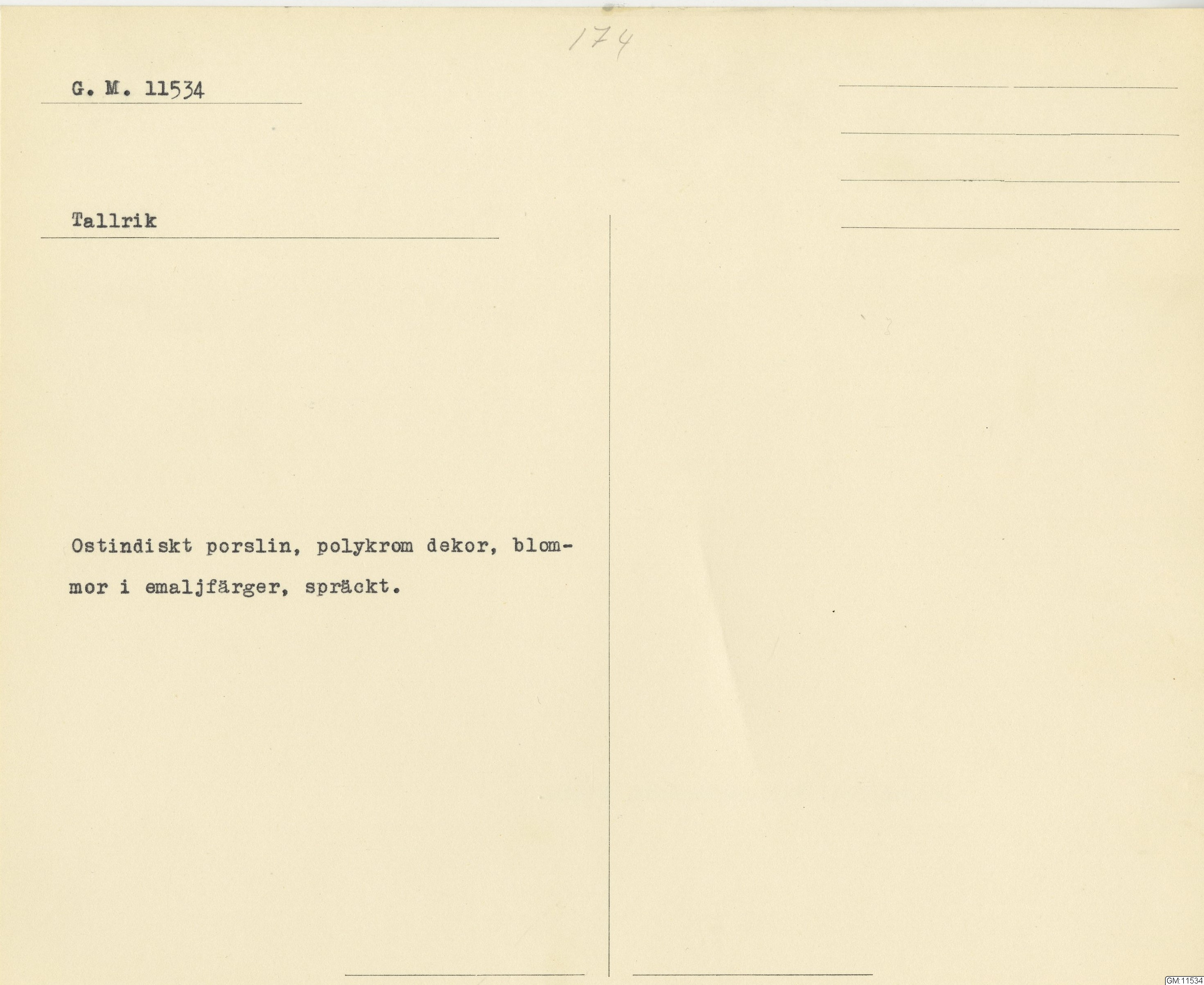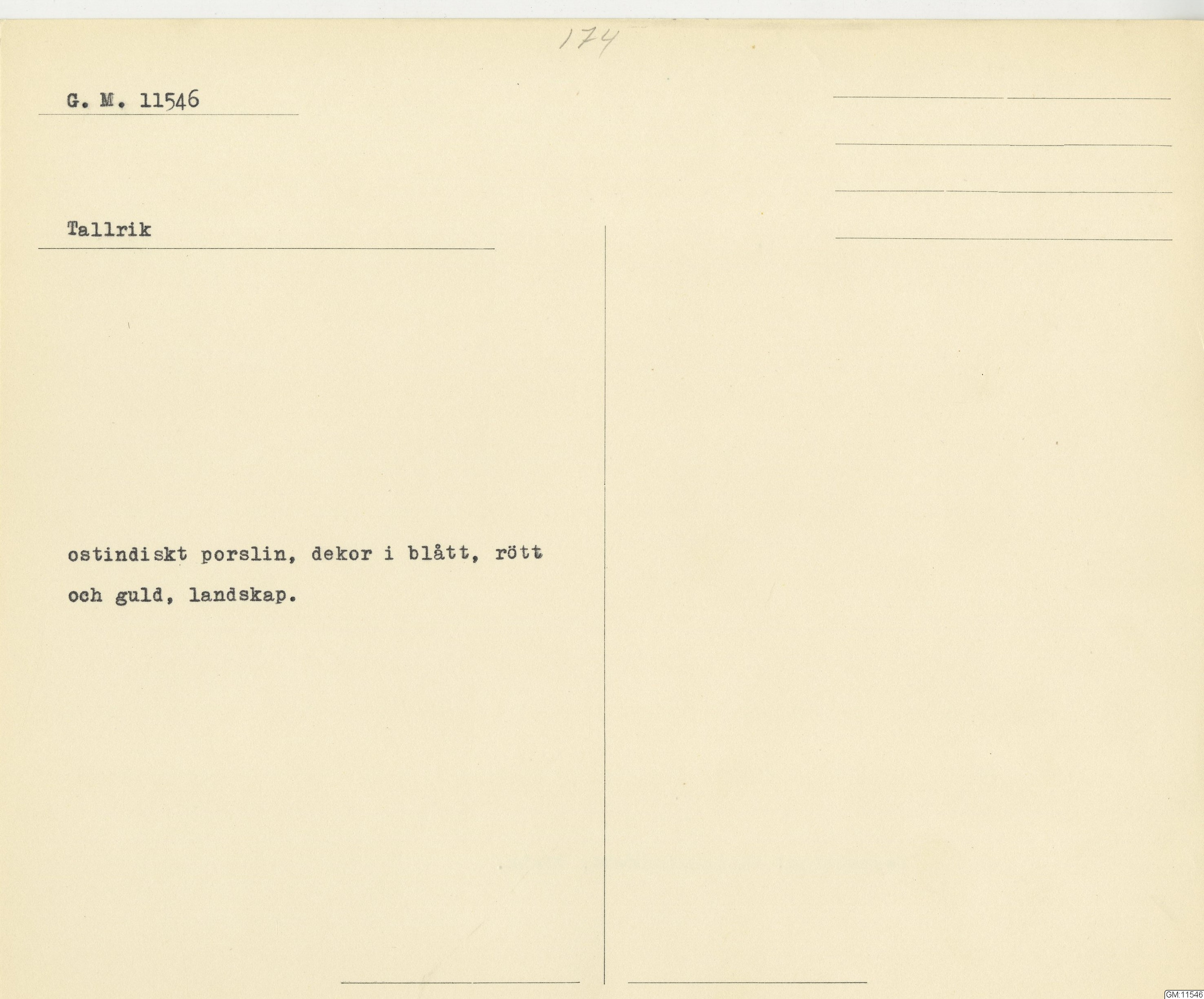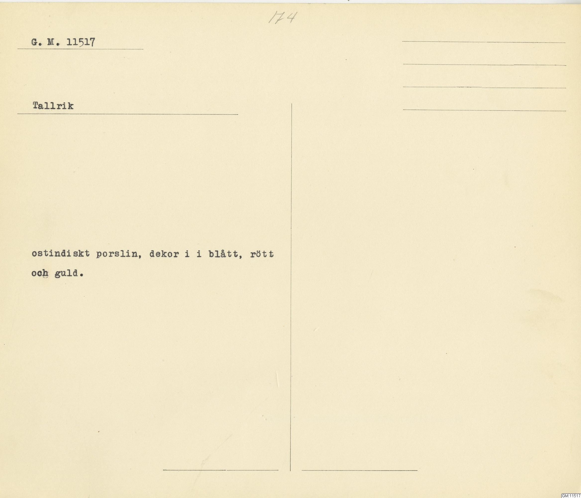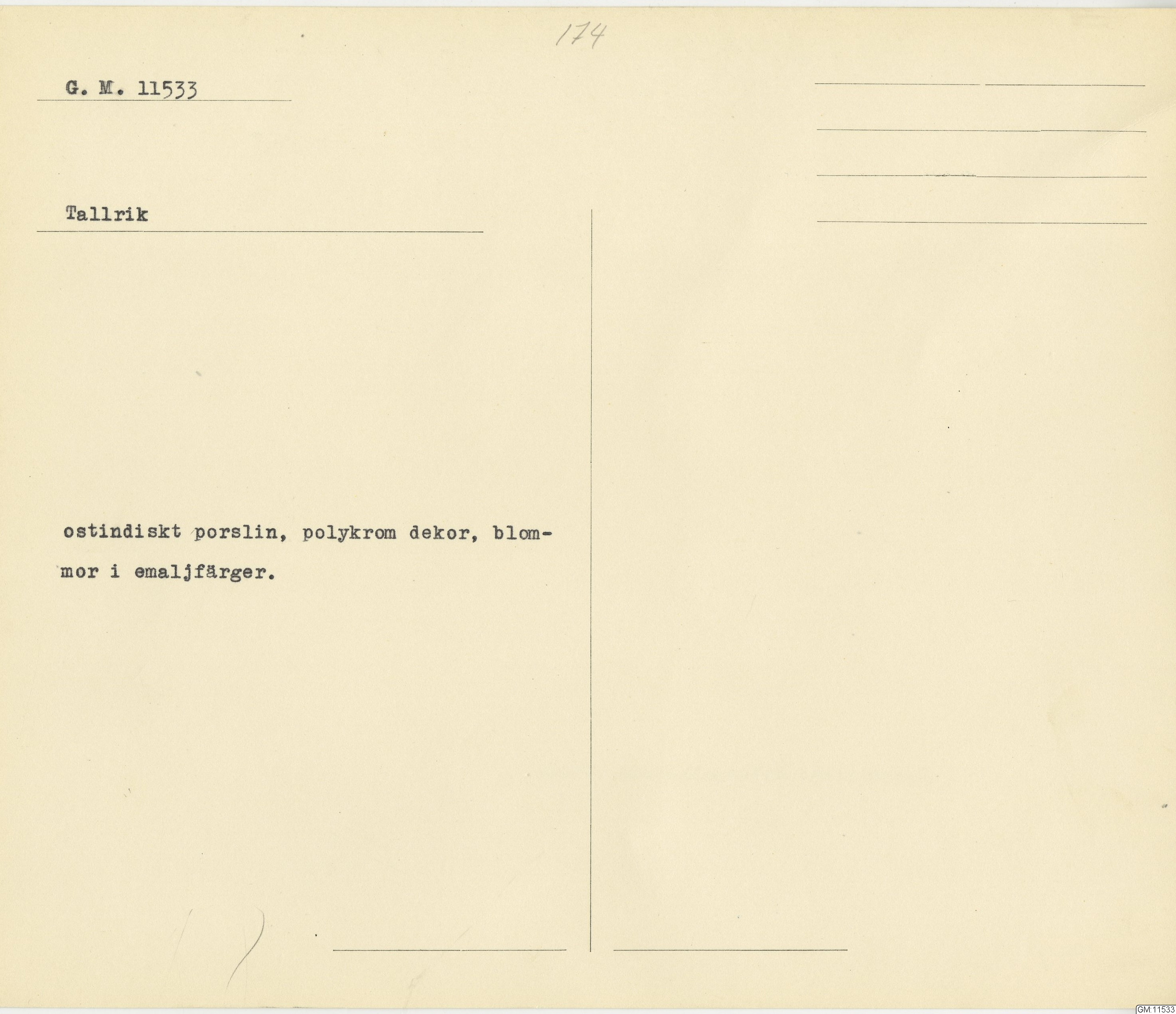 GM katalogkort 174. 18E Porslin Ostindiskt 4. tallrikar 2