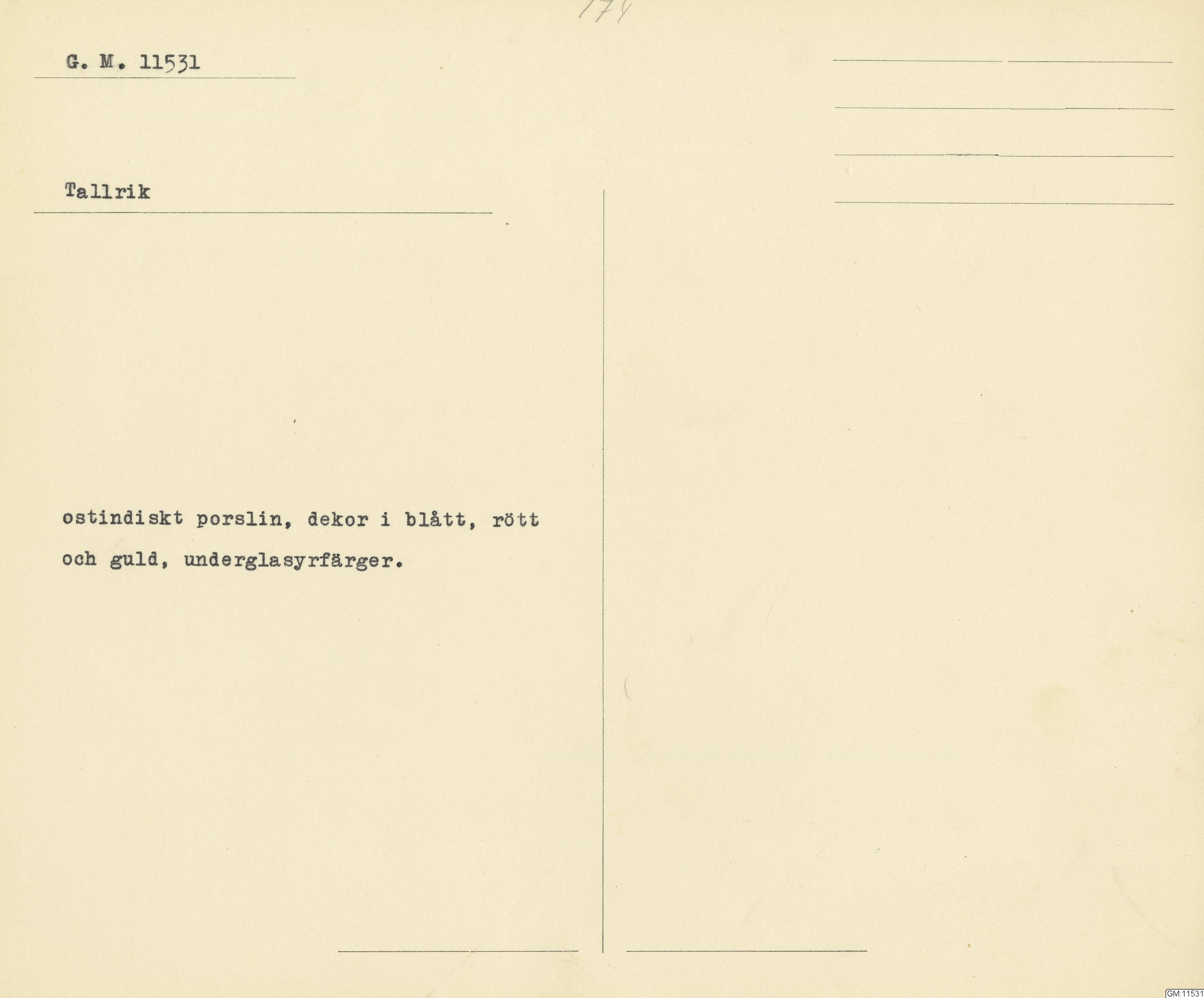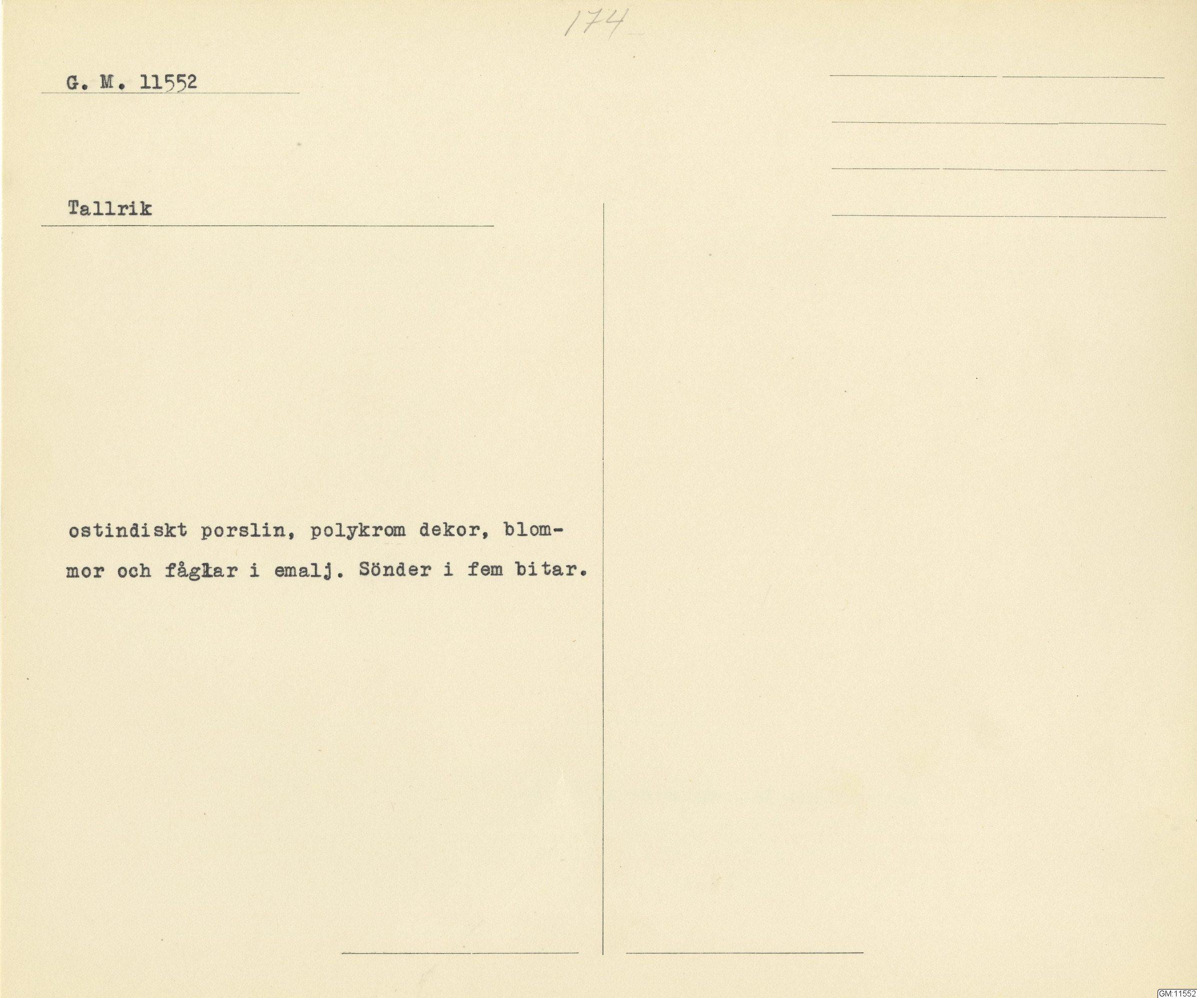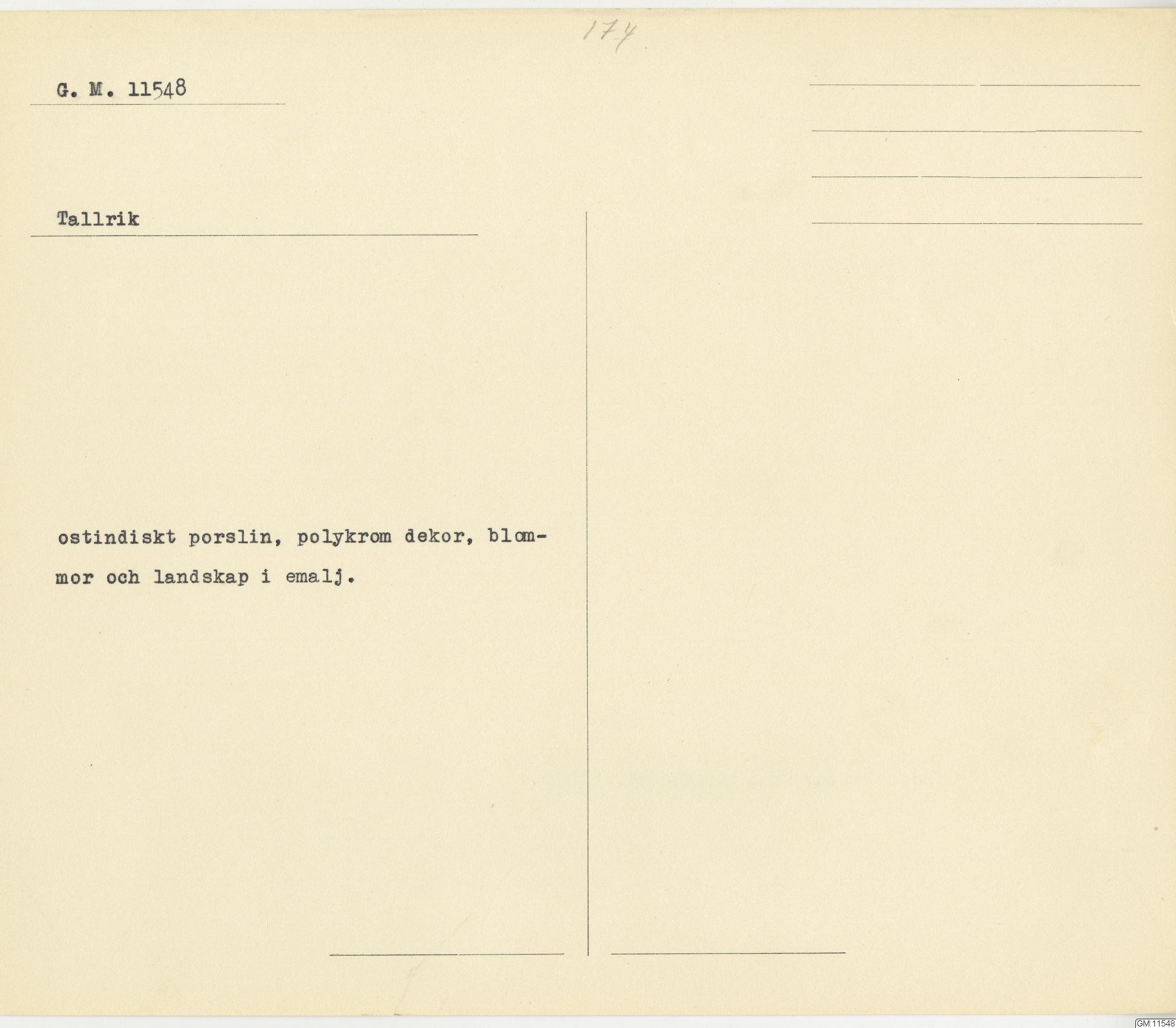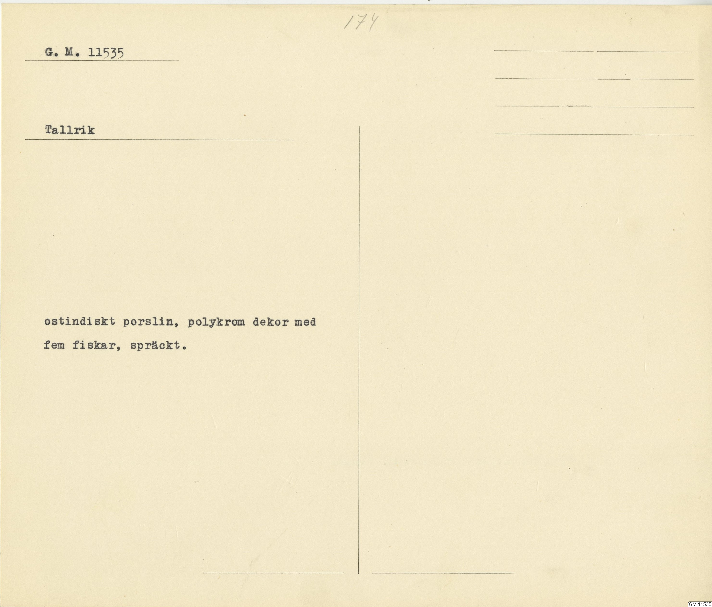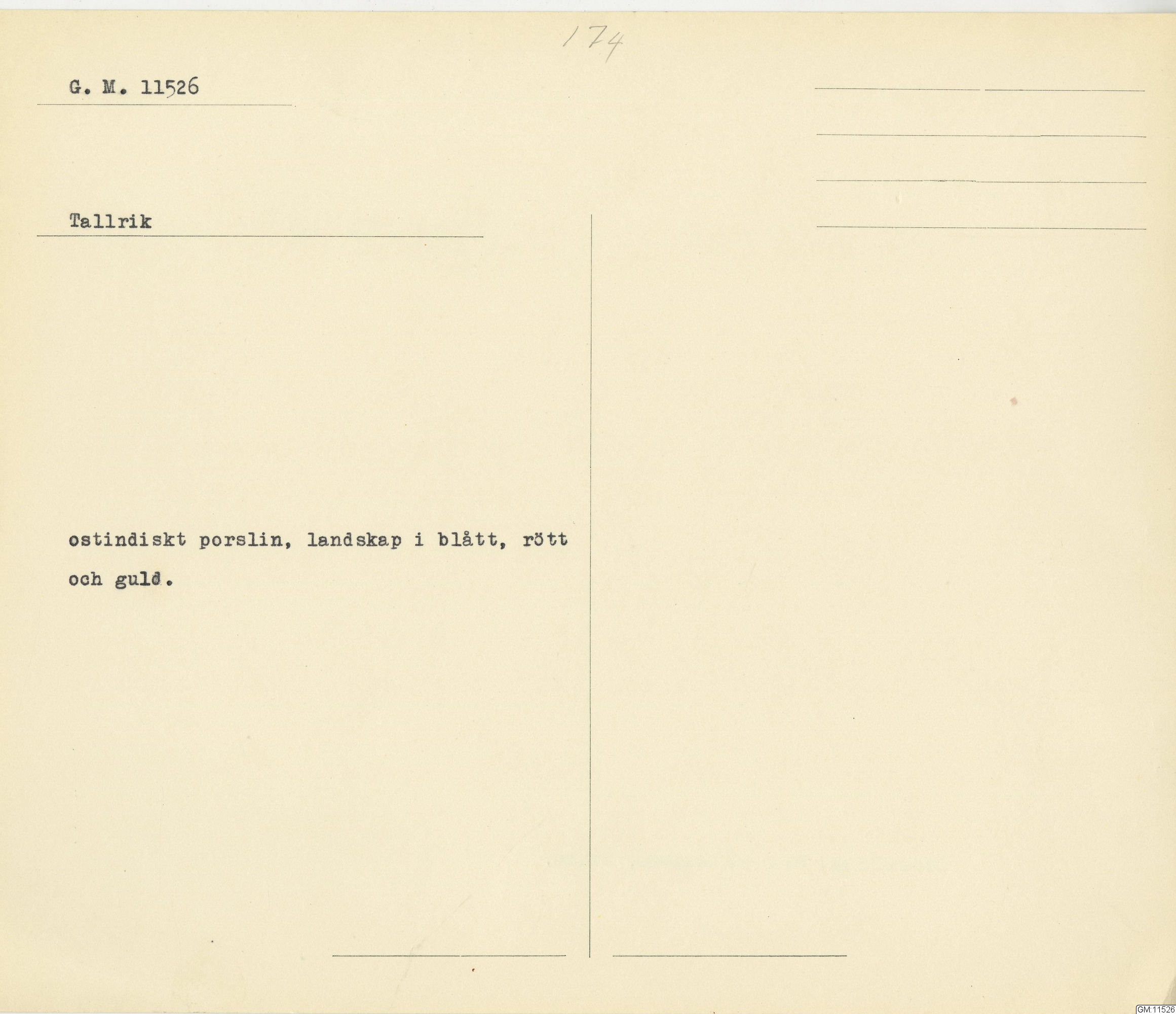 GM katalogkort 174. 18E Porslin Ostindiskt 4. tallrikar 2
