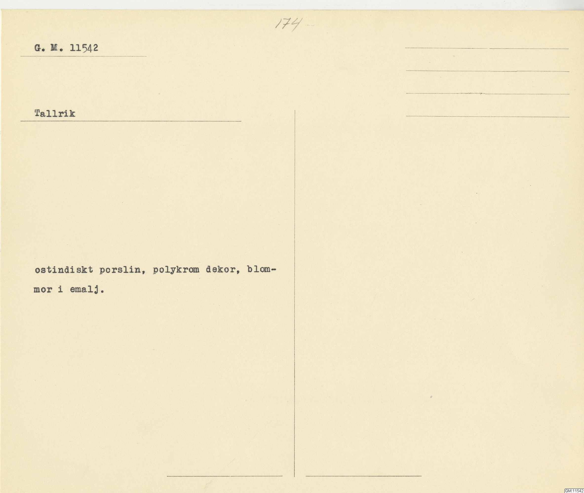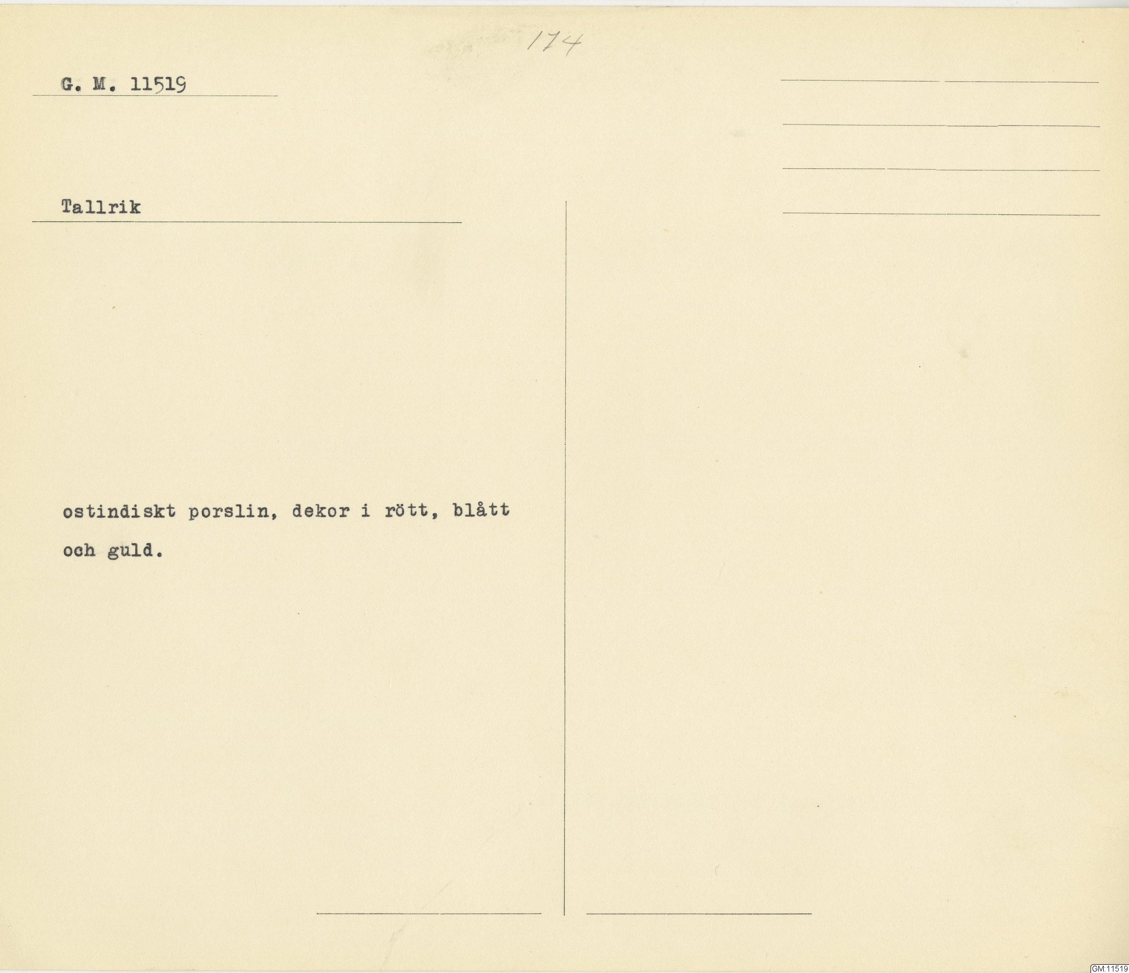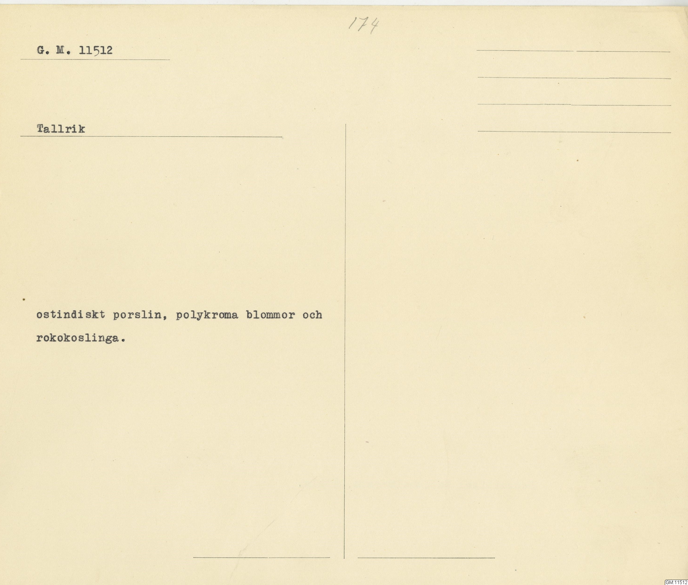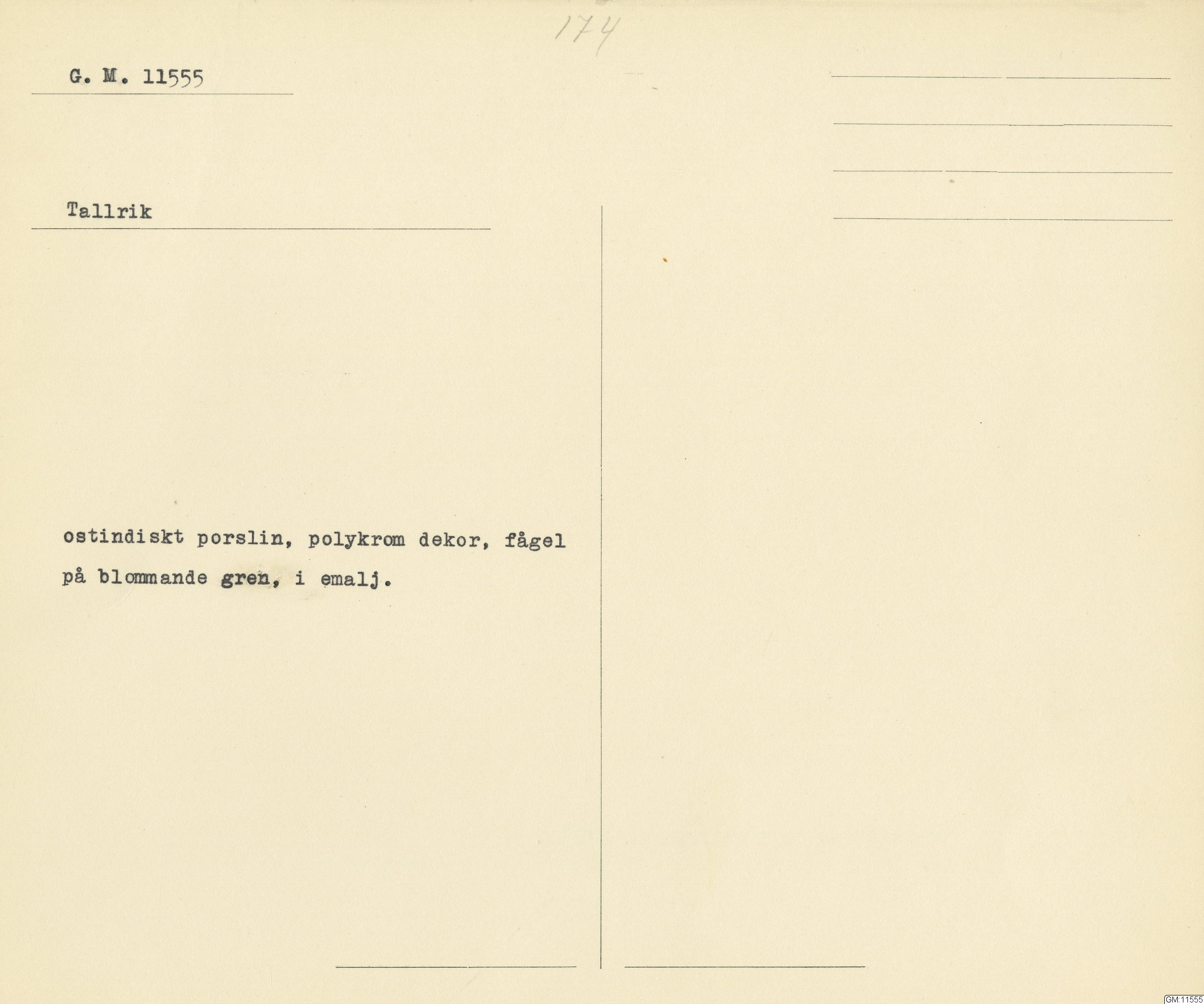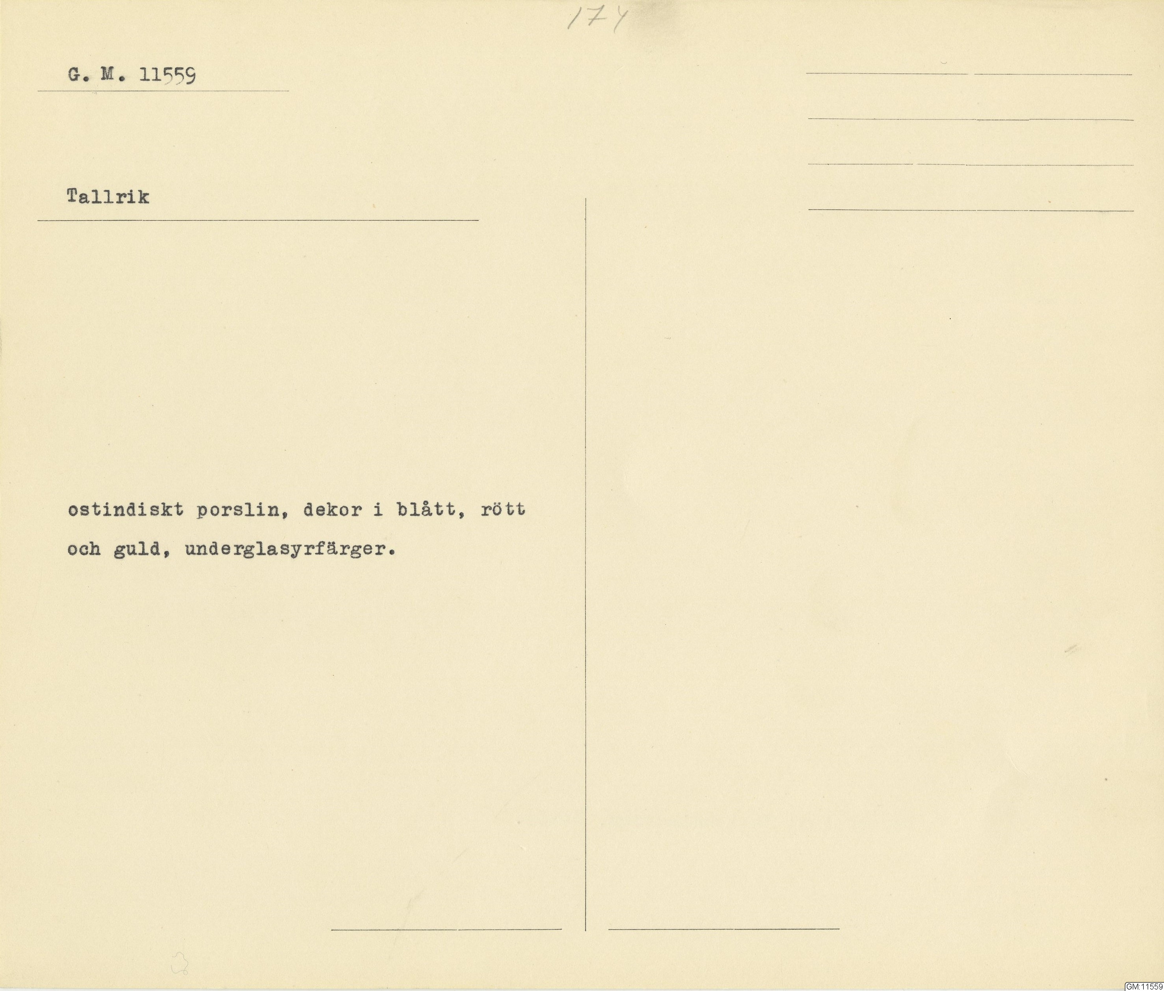 GM katalogkort 174. 18E Porslin Ostindiskt 4. tallrikar 2