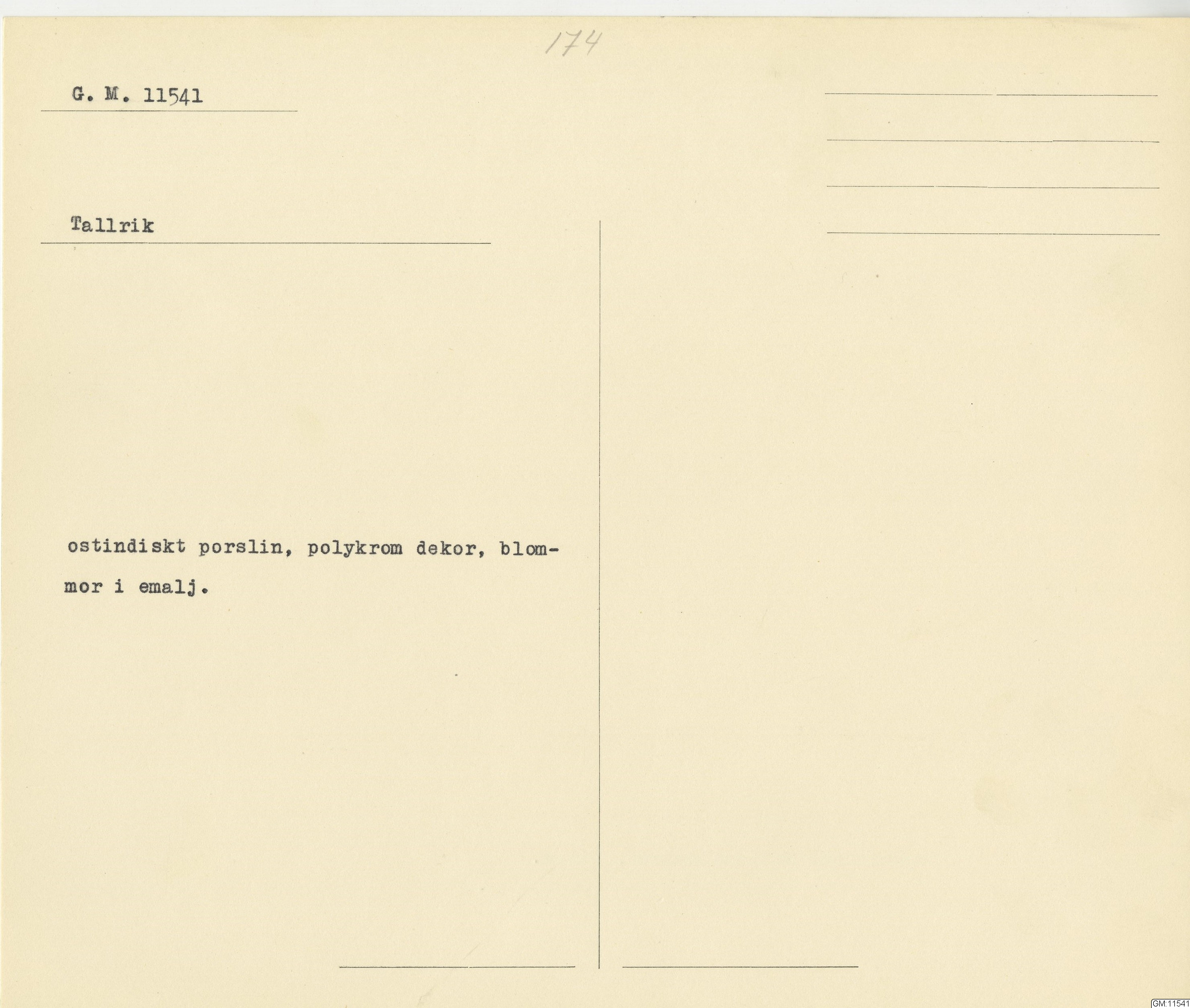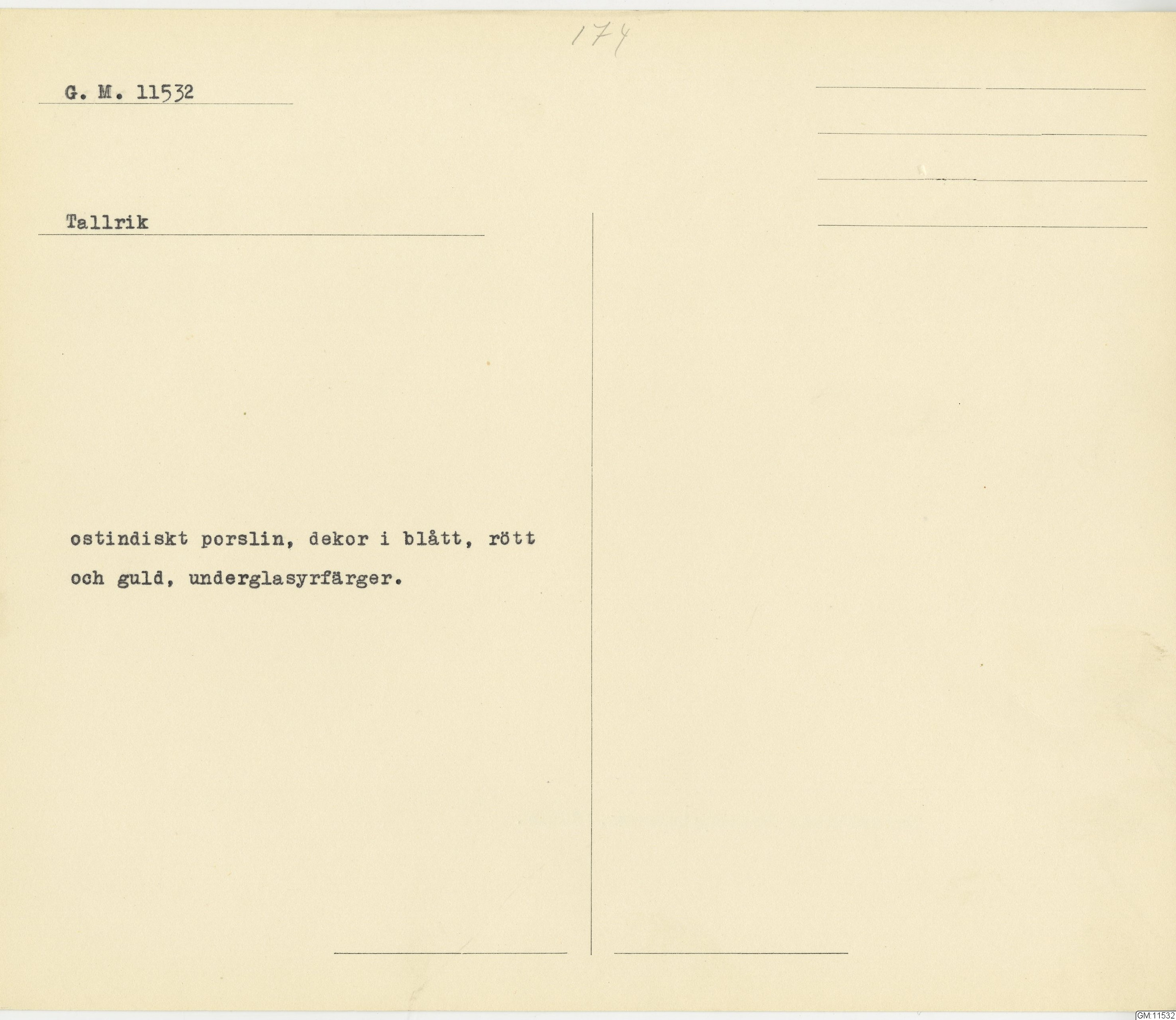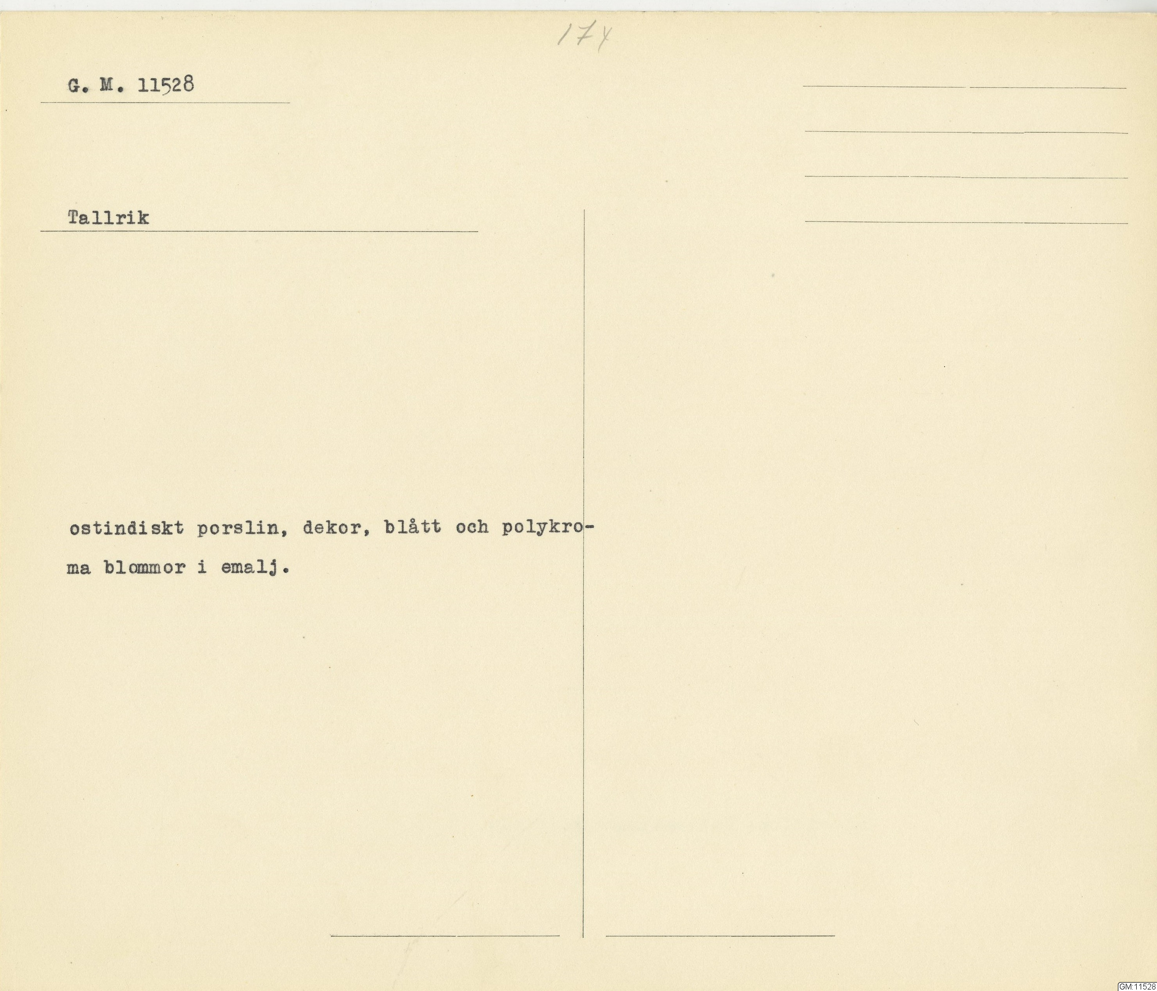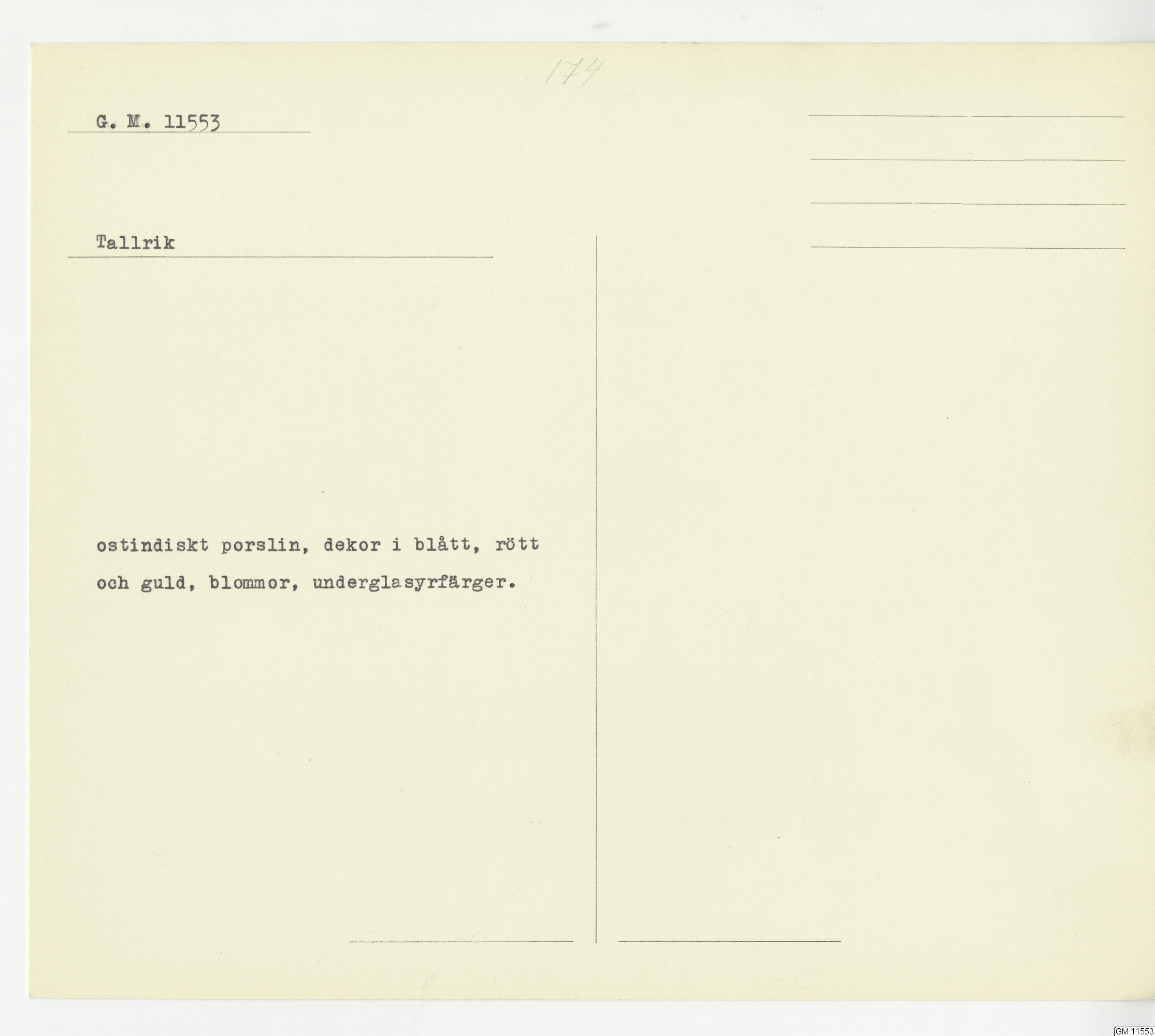 GM katalogkort 174. 18E Porslin Ostindiskt 4. tallrikar 2
