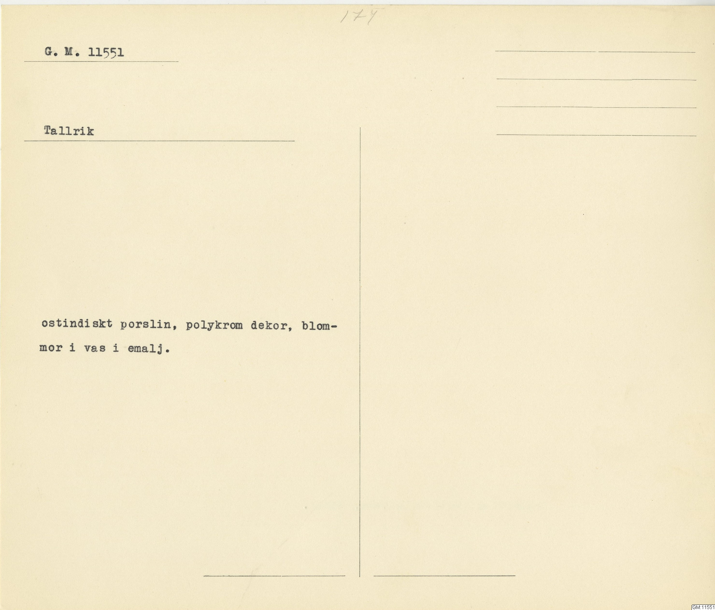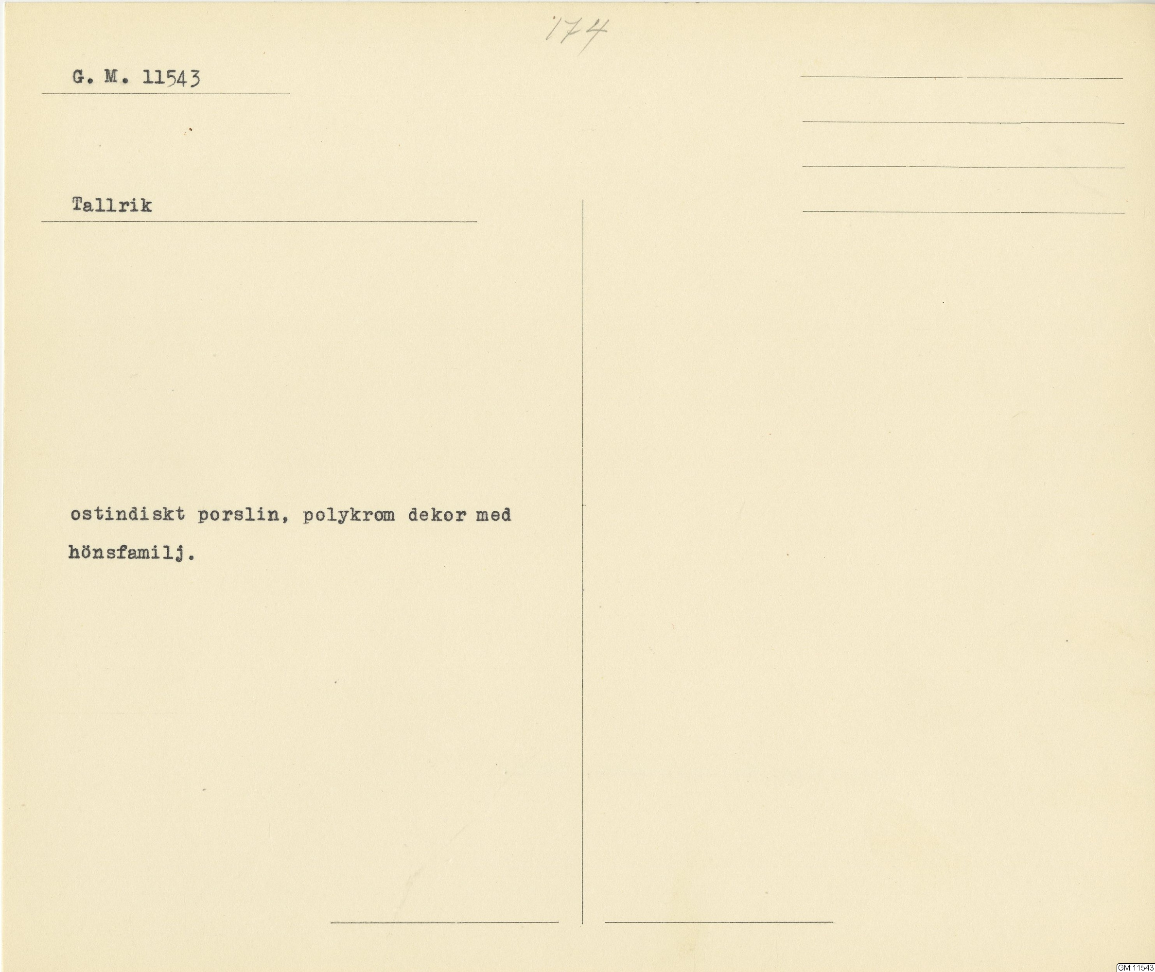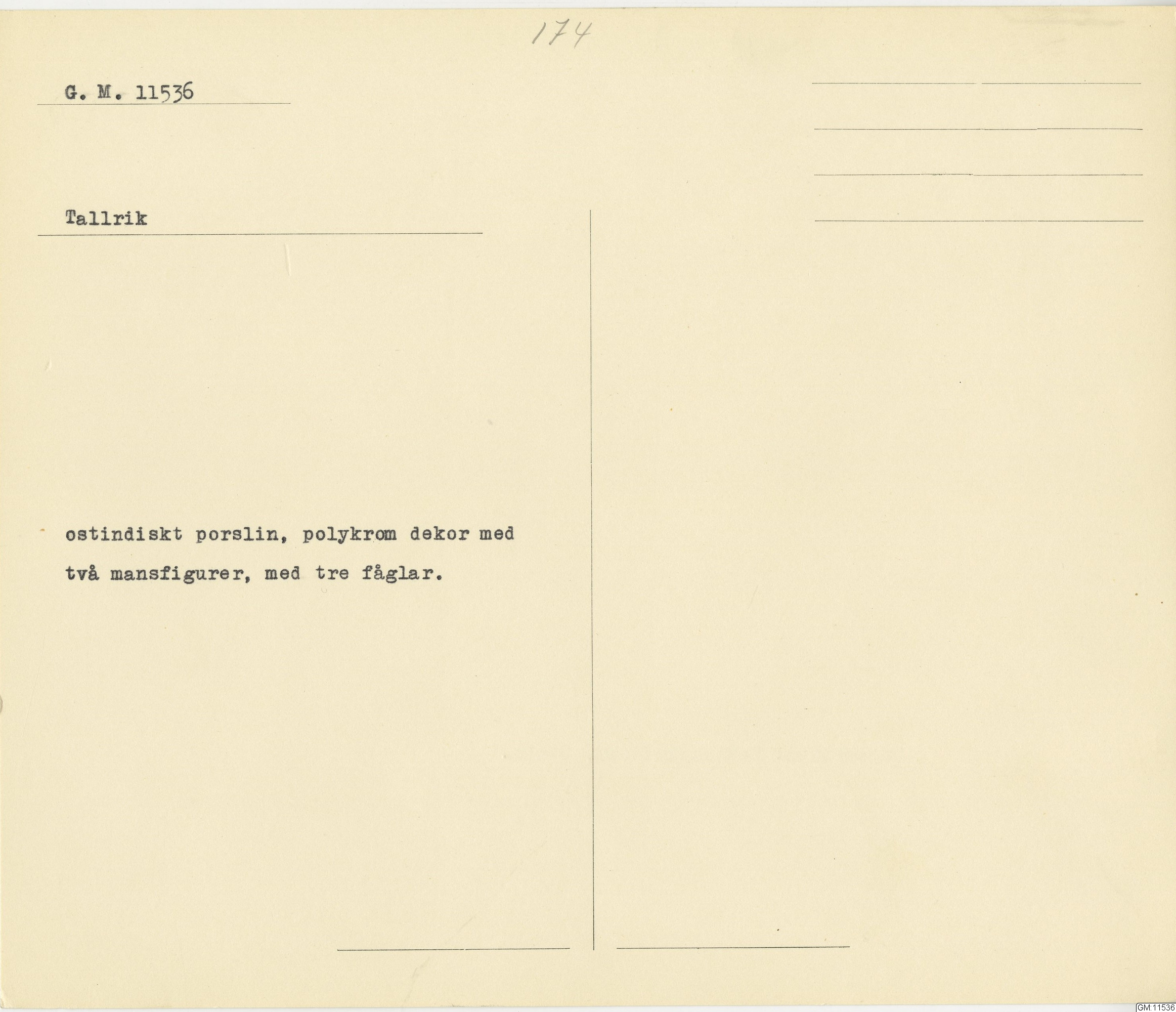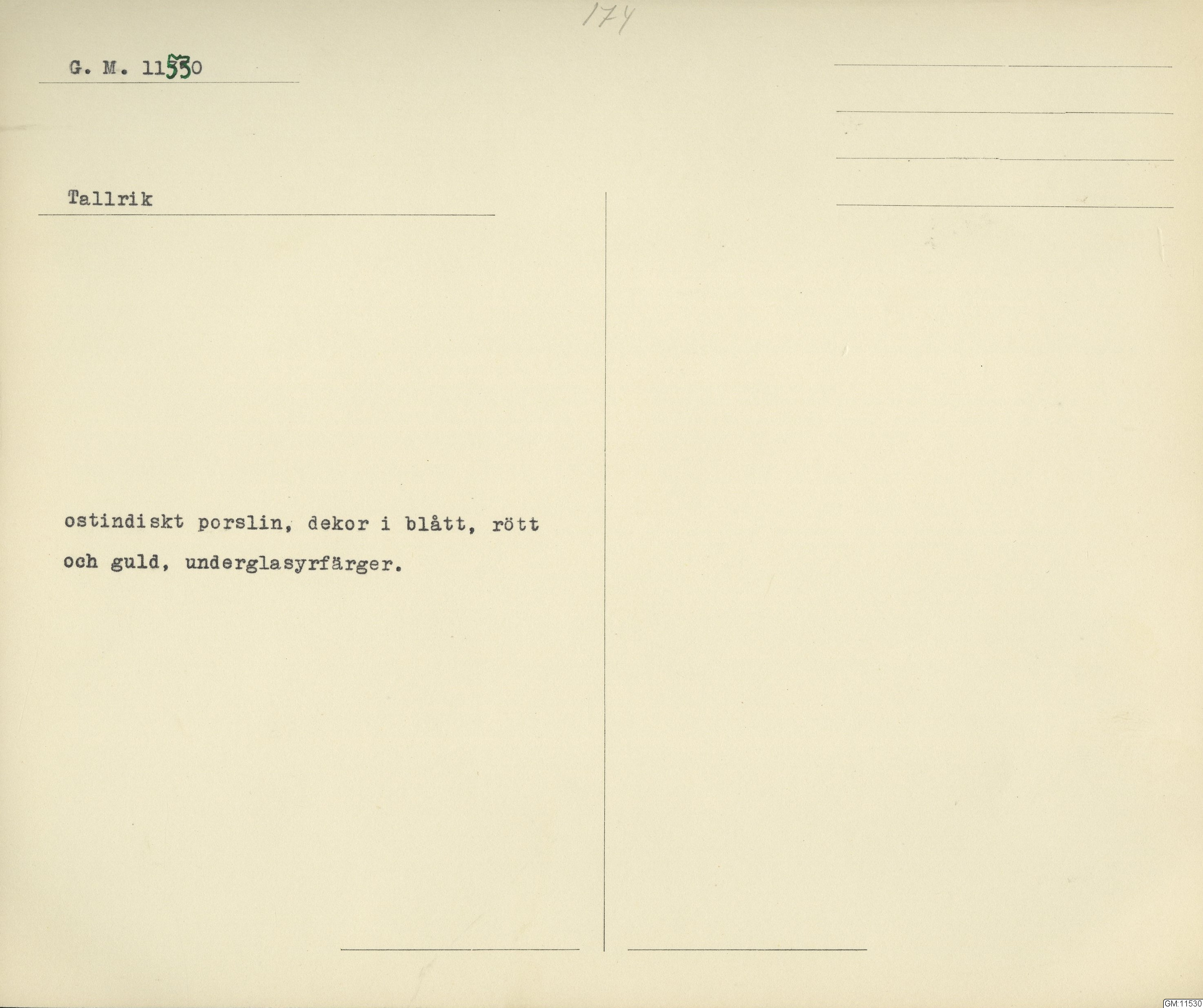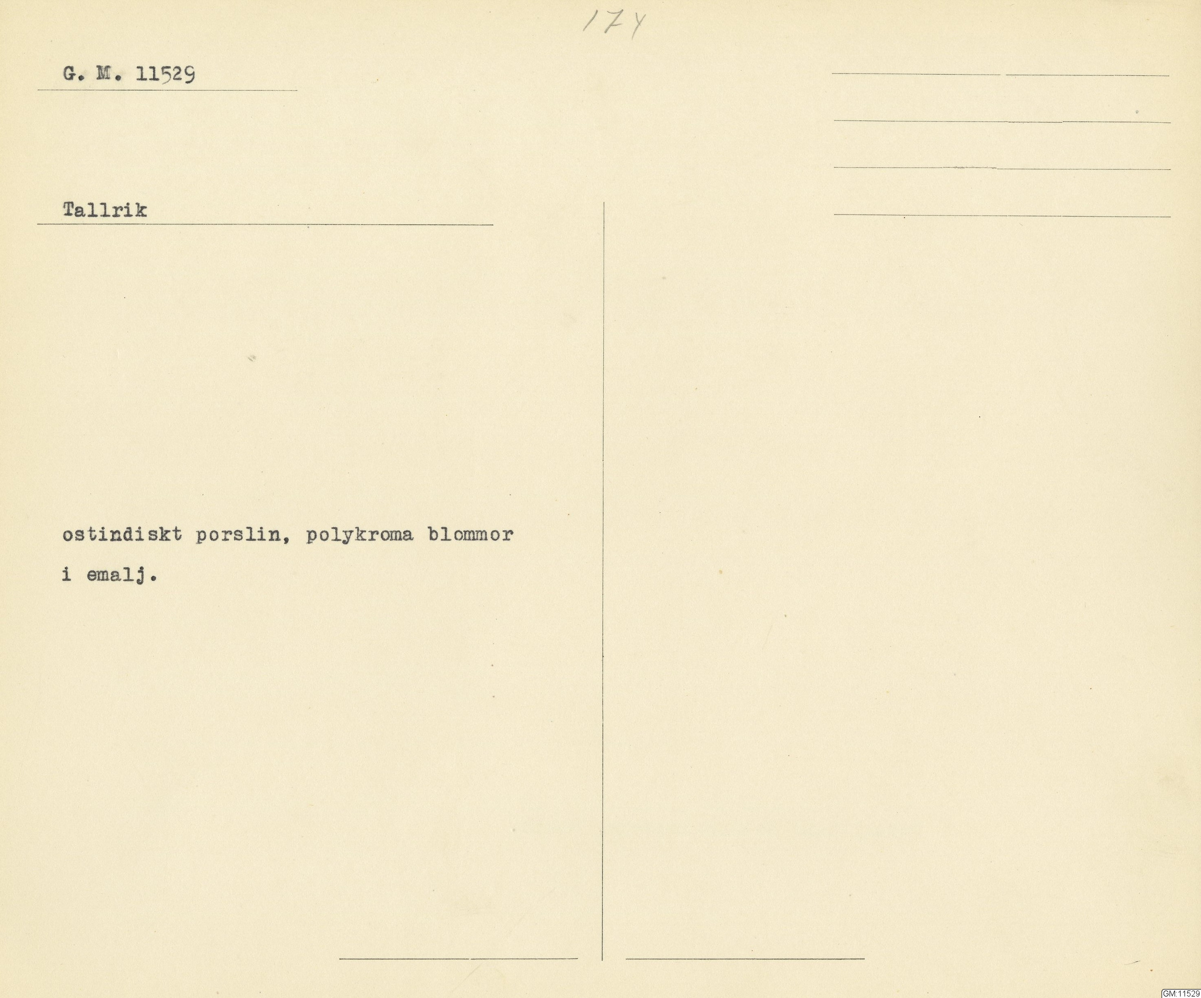 GM katalogkort 174. 18E Porslin Ostindiskt 4. tallrikar 2
