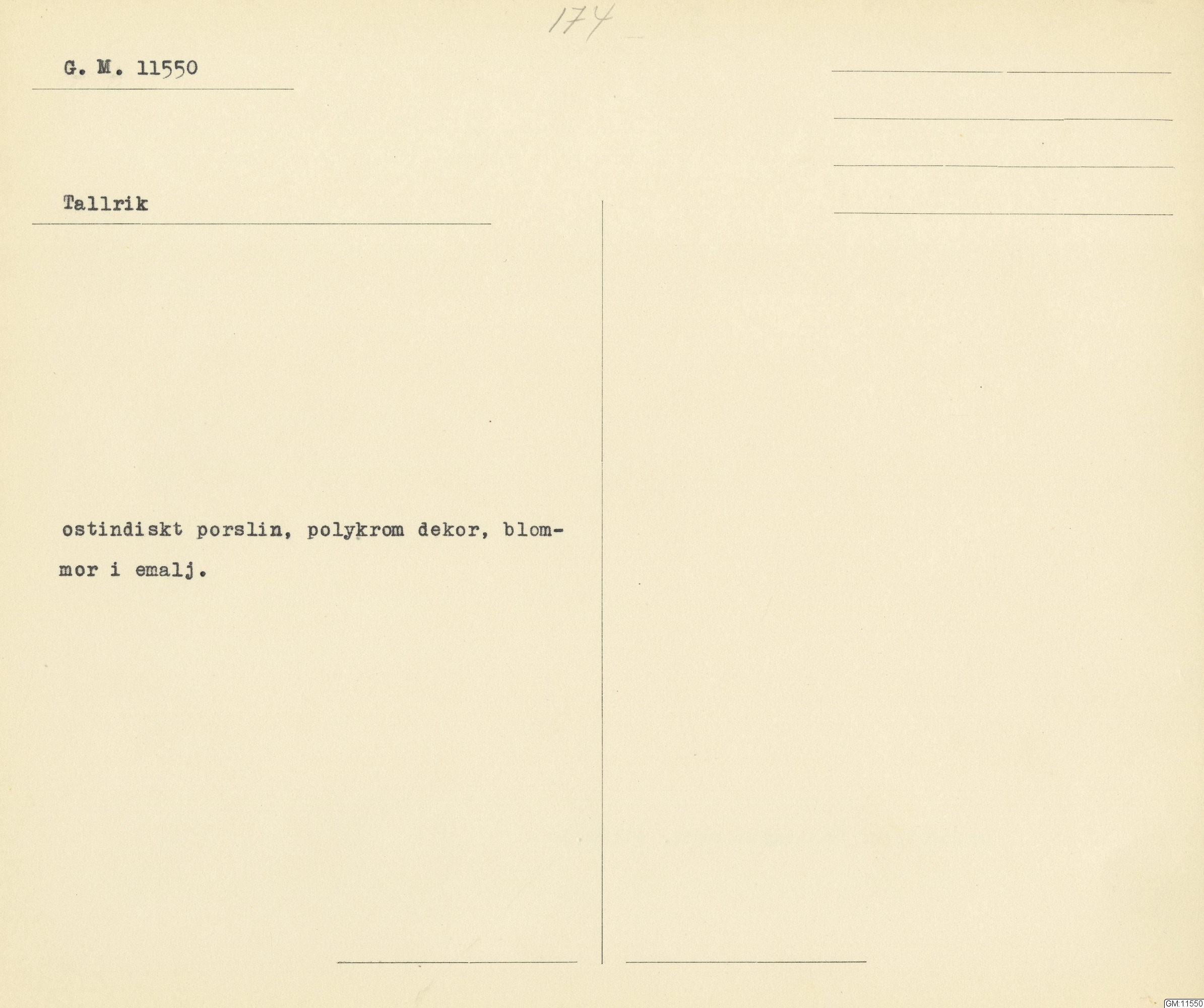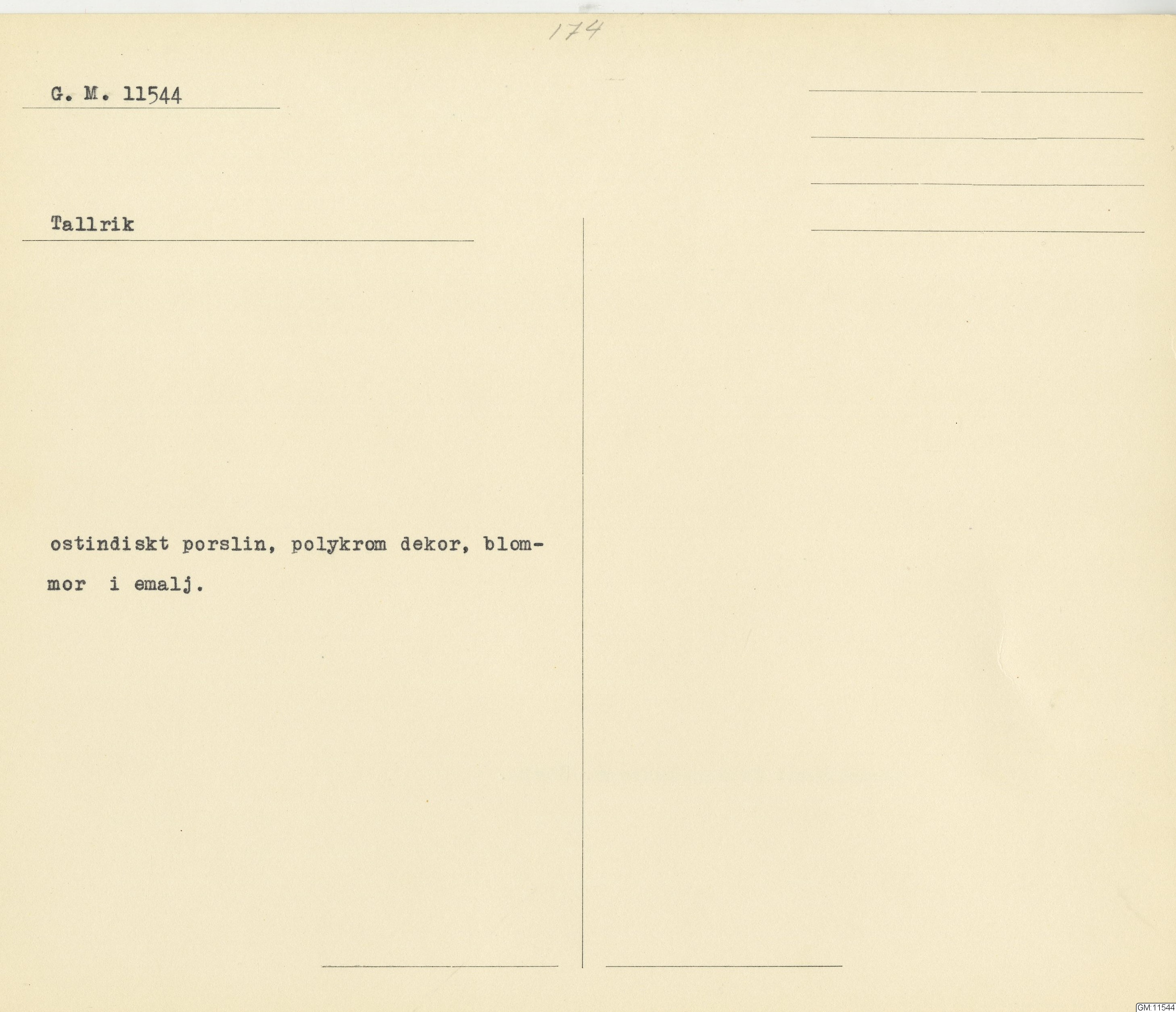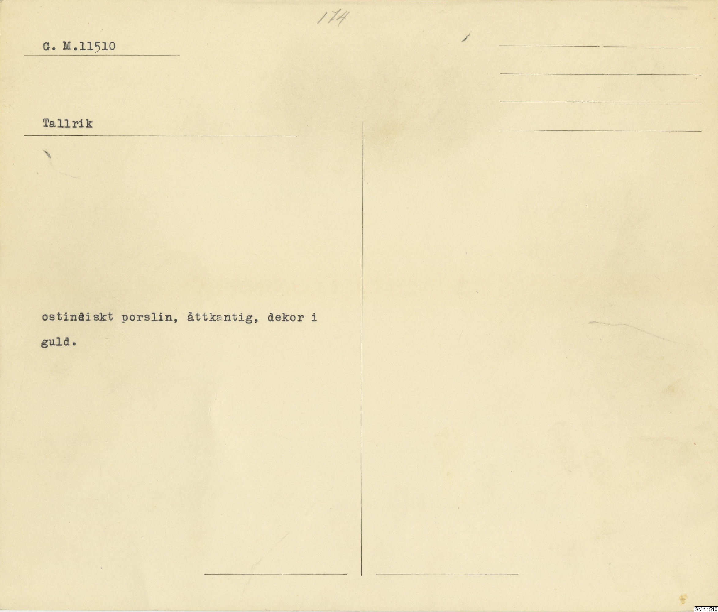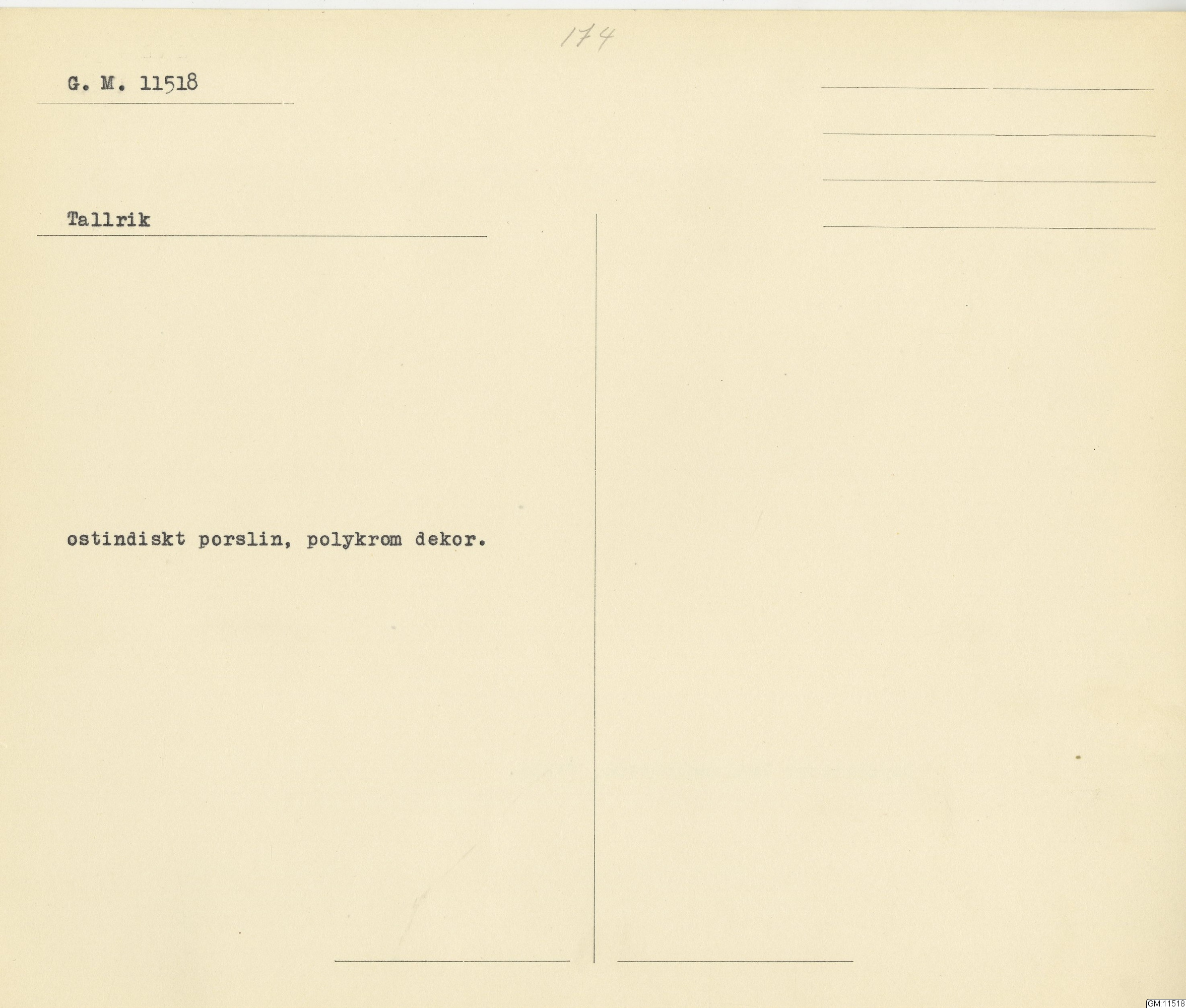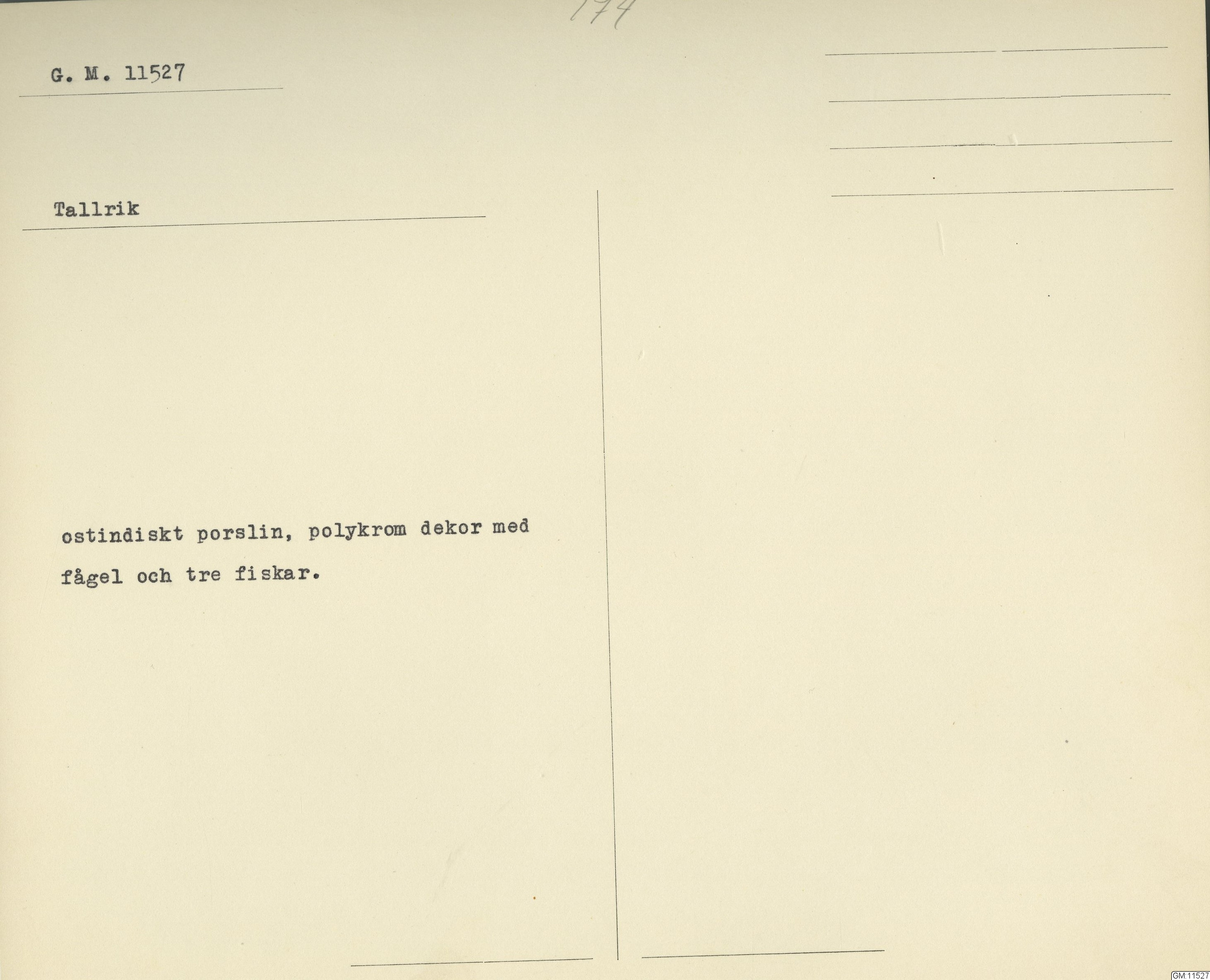 GM katalogkort 174. 18E Porslin Ostindiskt 4. tallrikar 2
