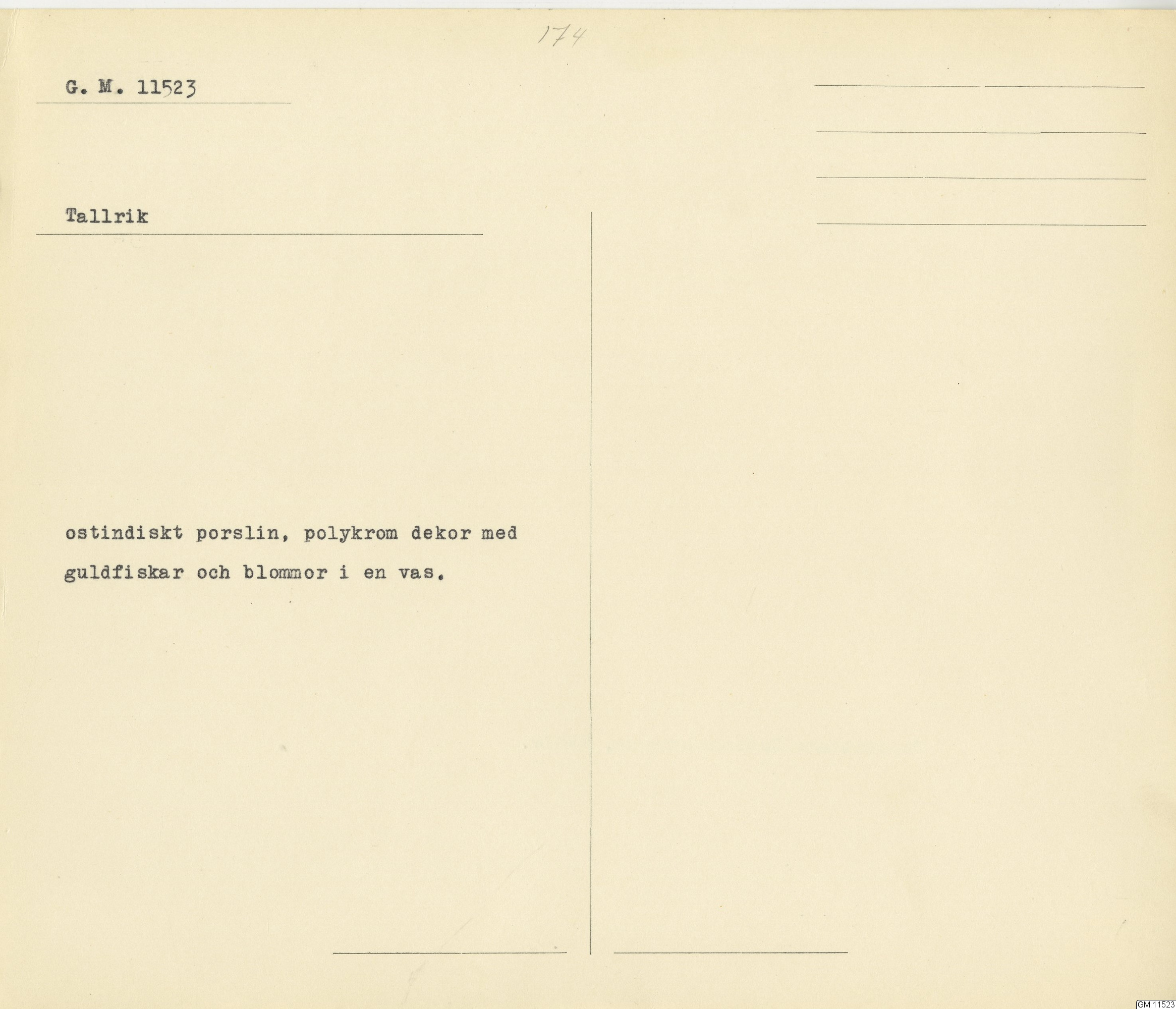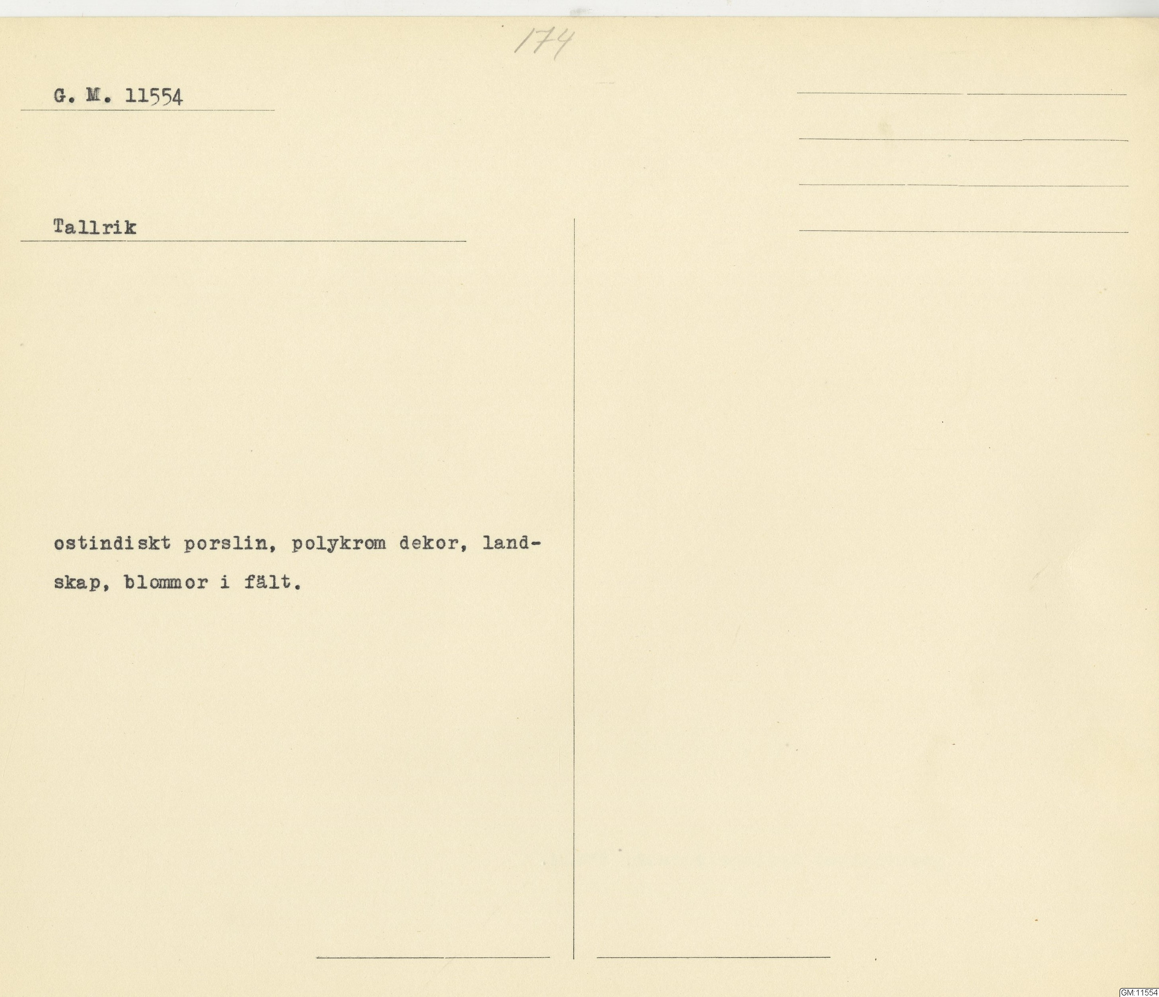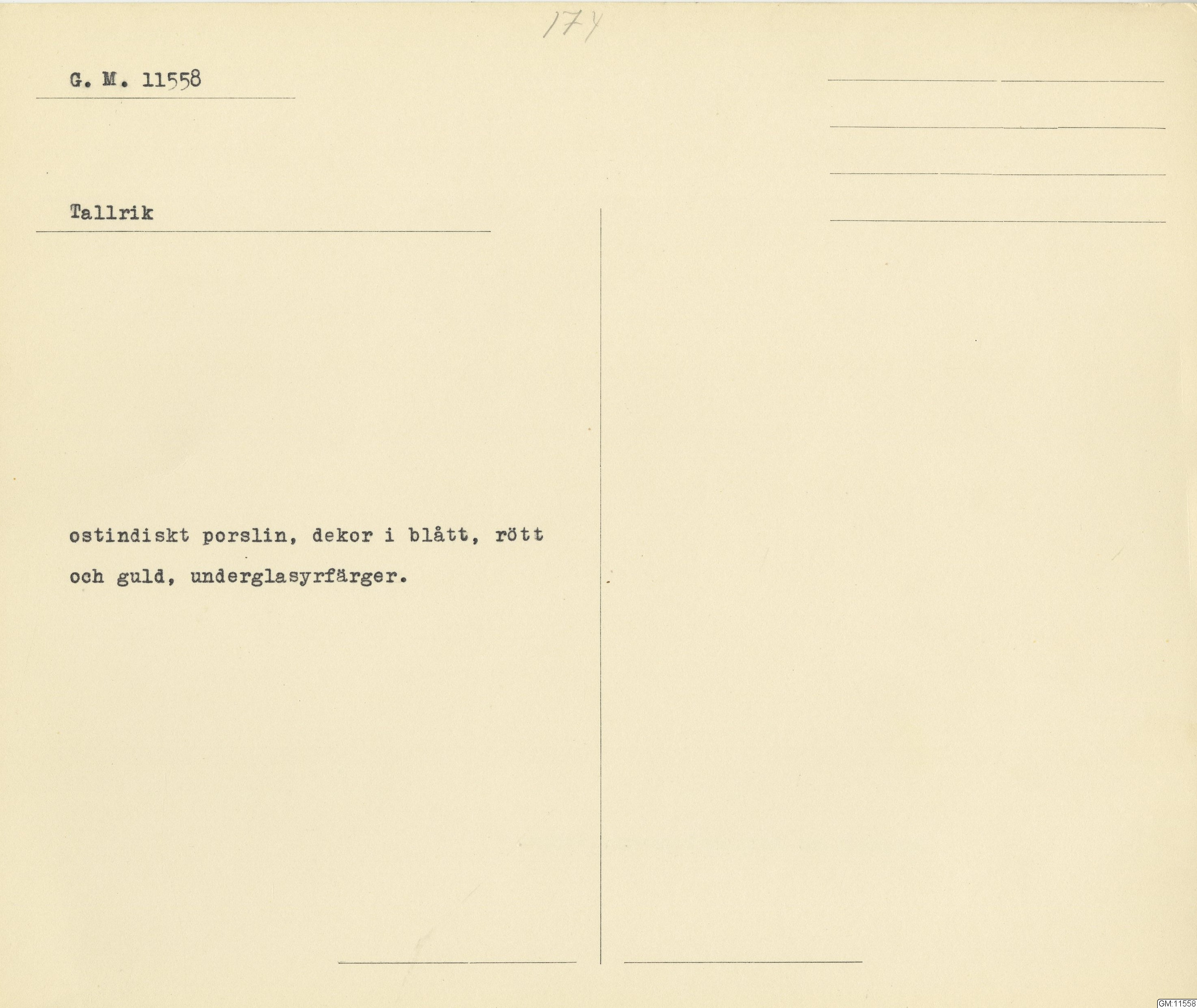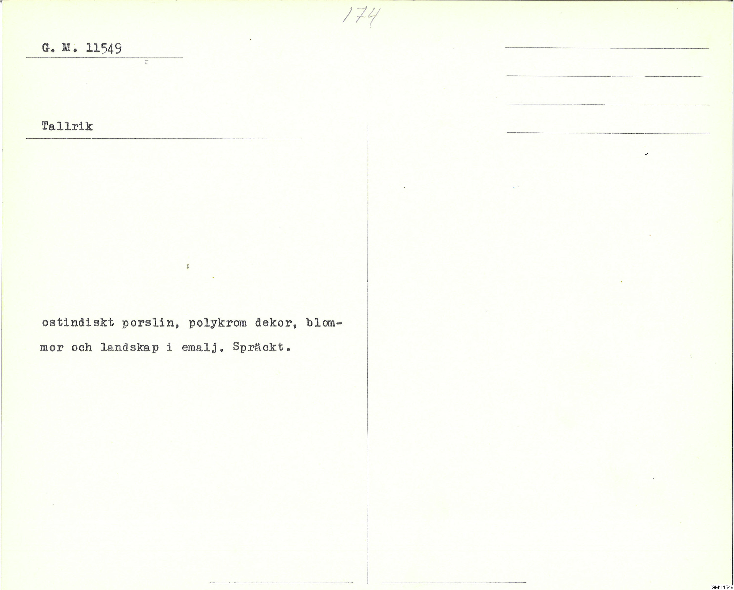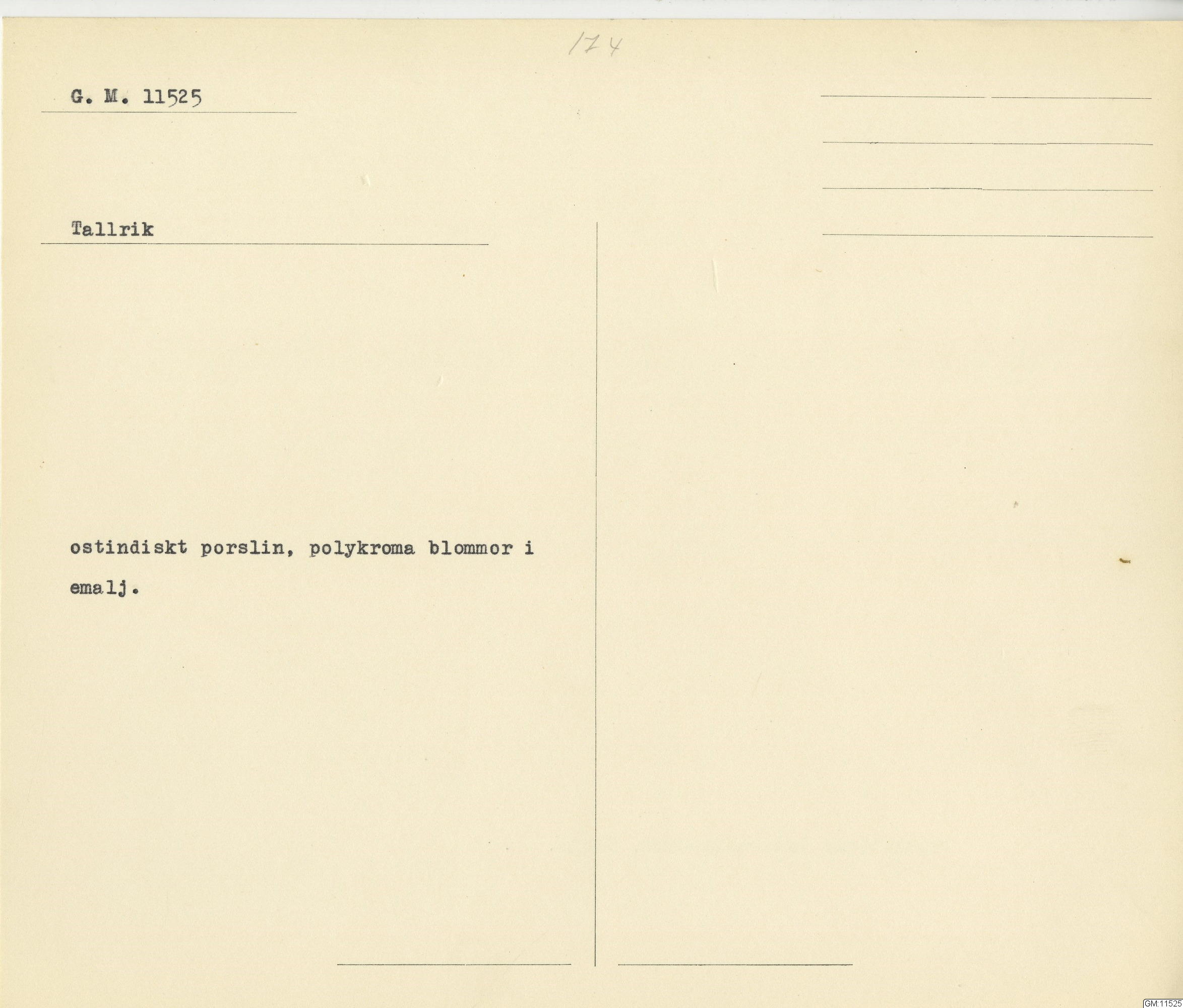 GM katalogkort 174. 18E Porslin Ostindiskt 4. tallrikar 2