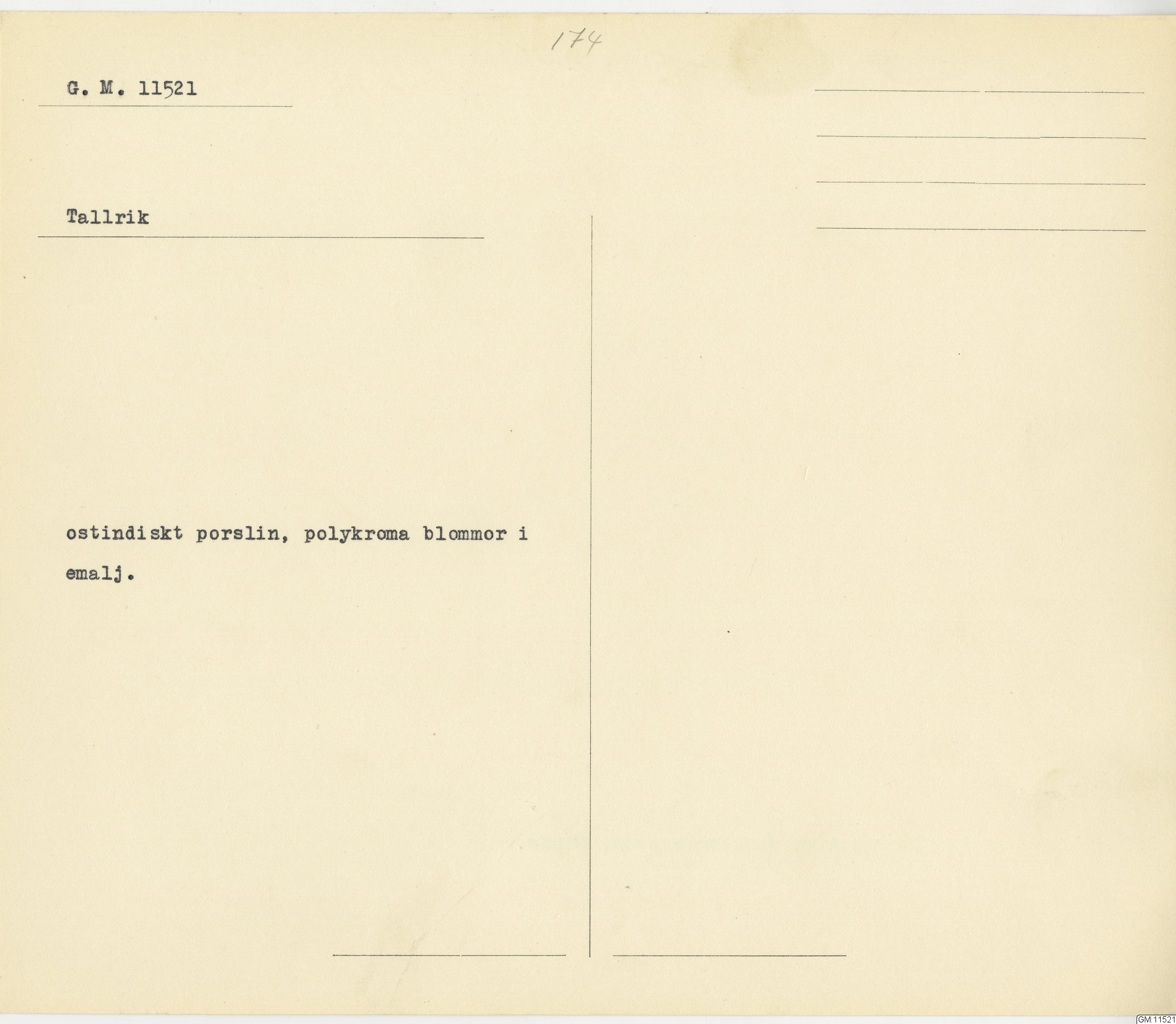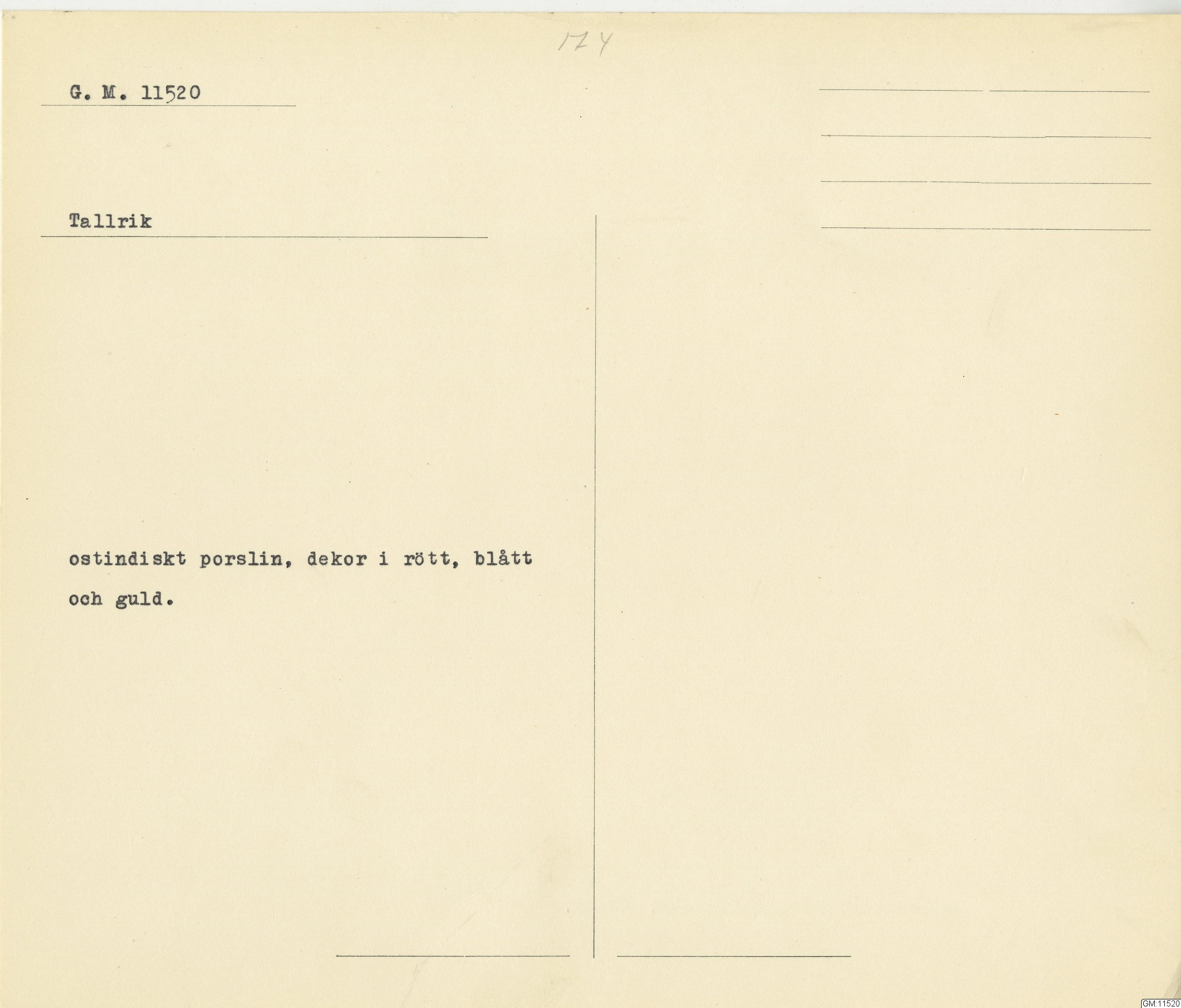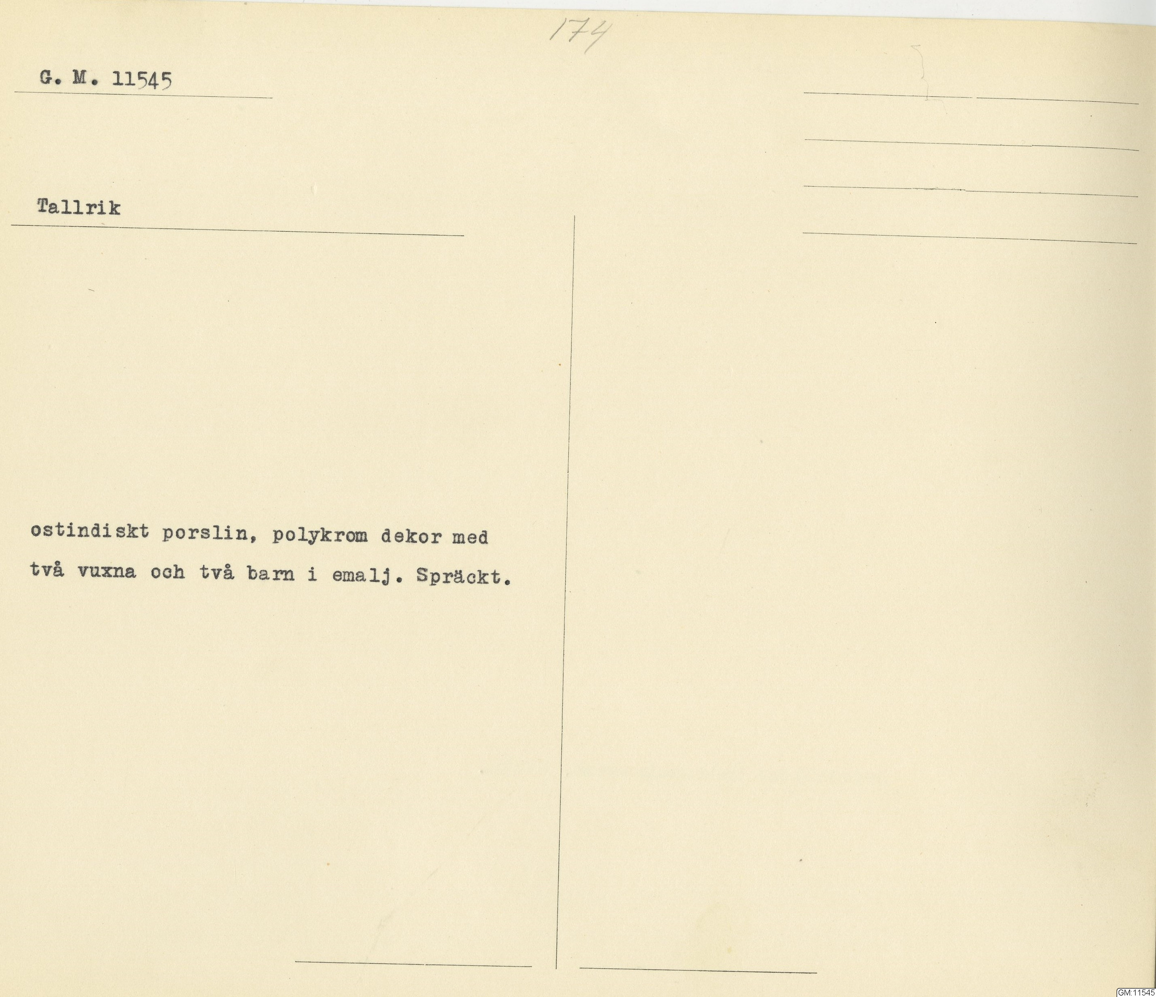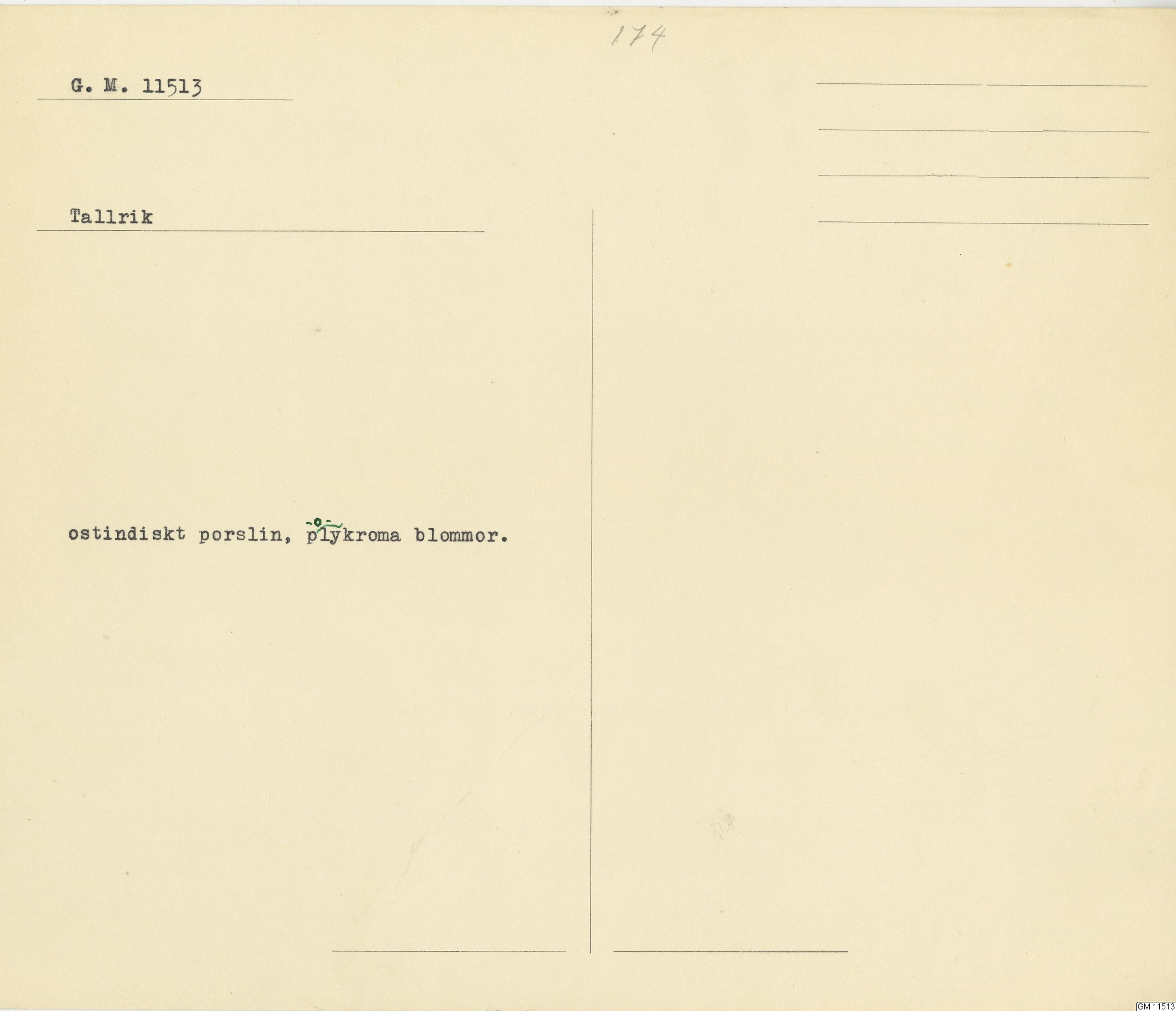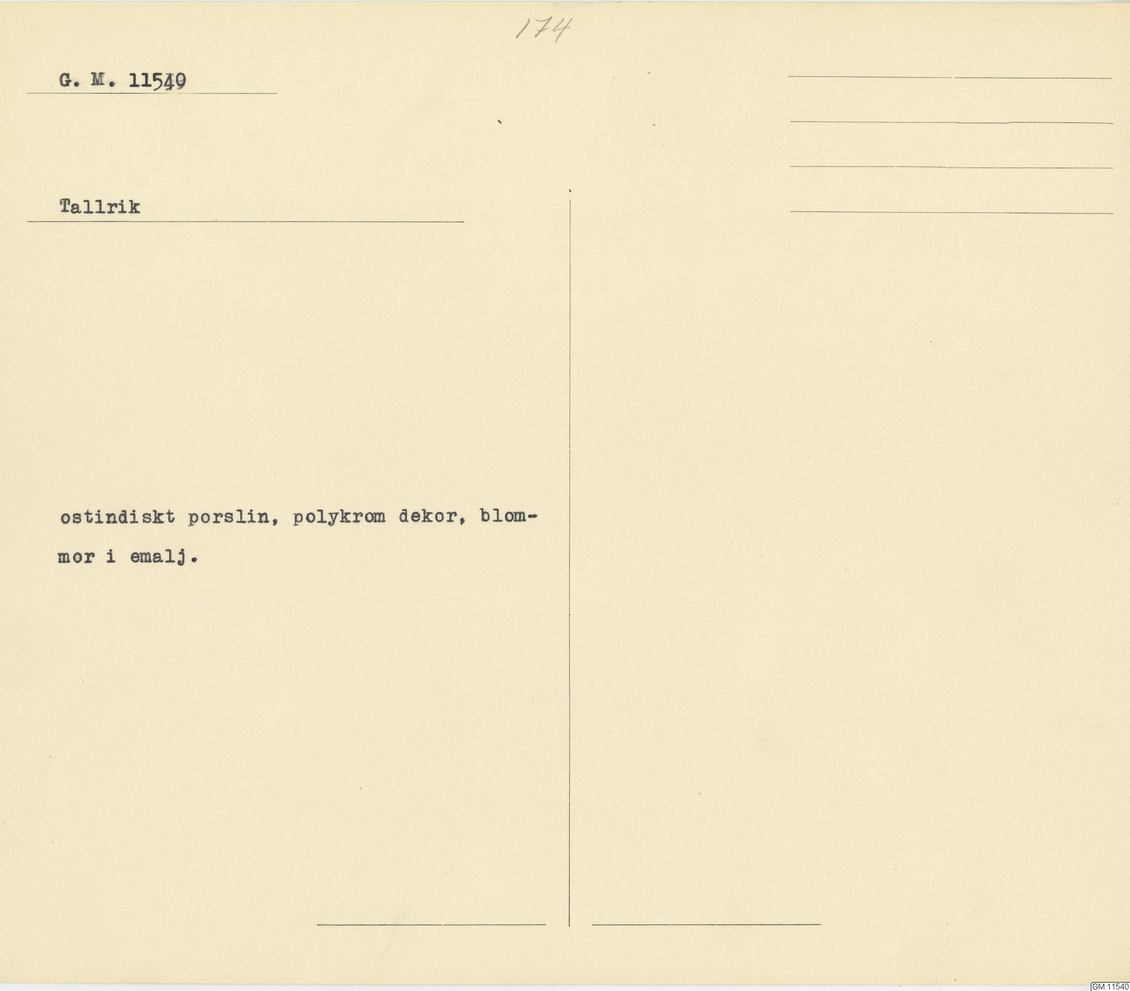 GM katalogkort 174. 18E Porslin Ostindiskt 4. tallrikar 2