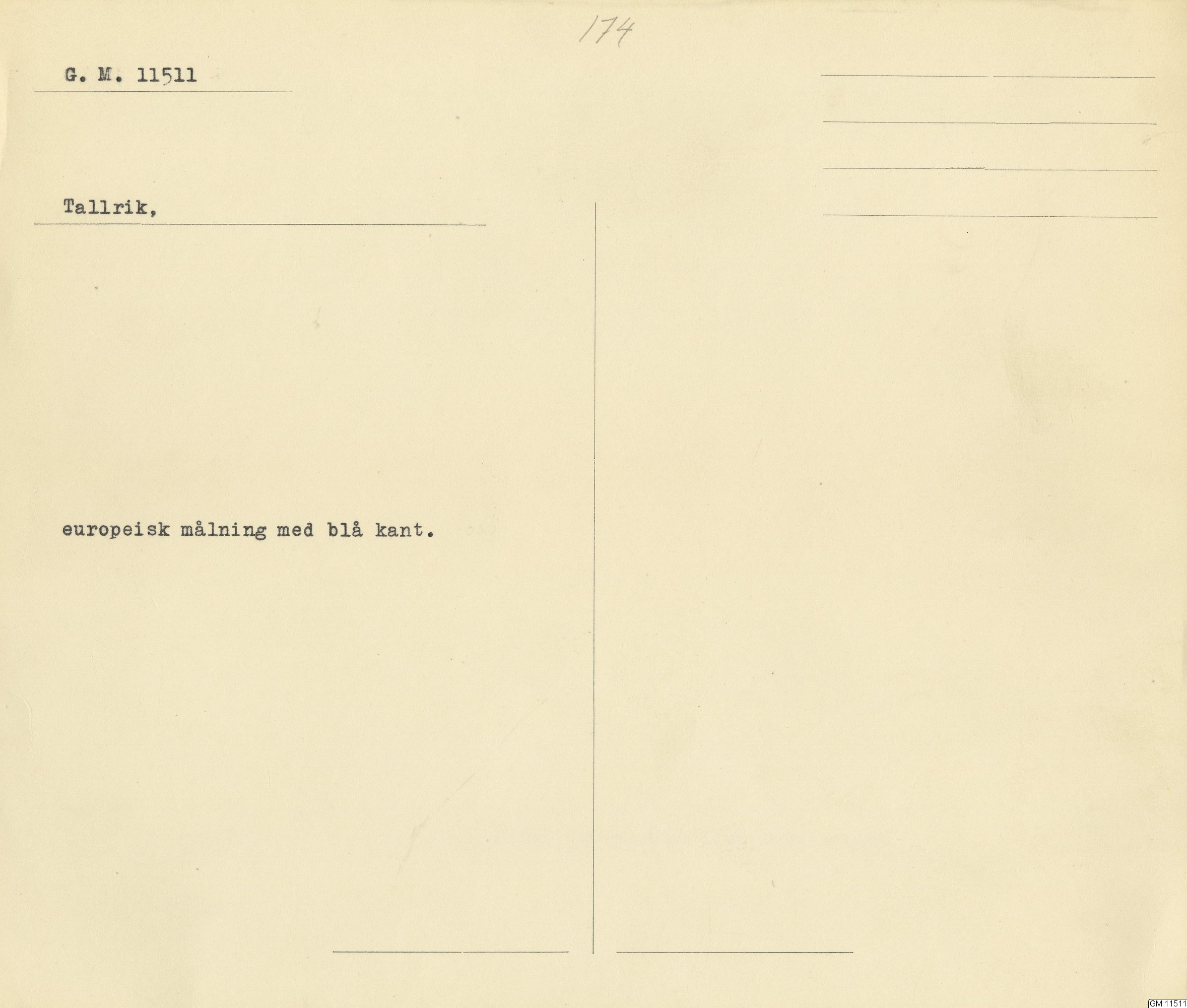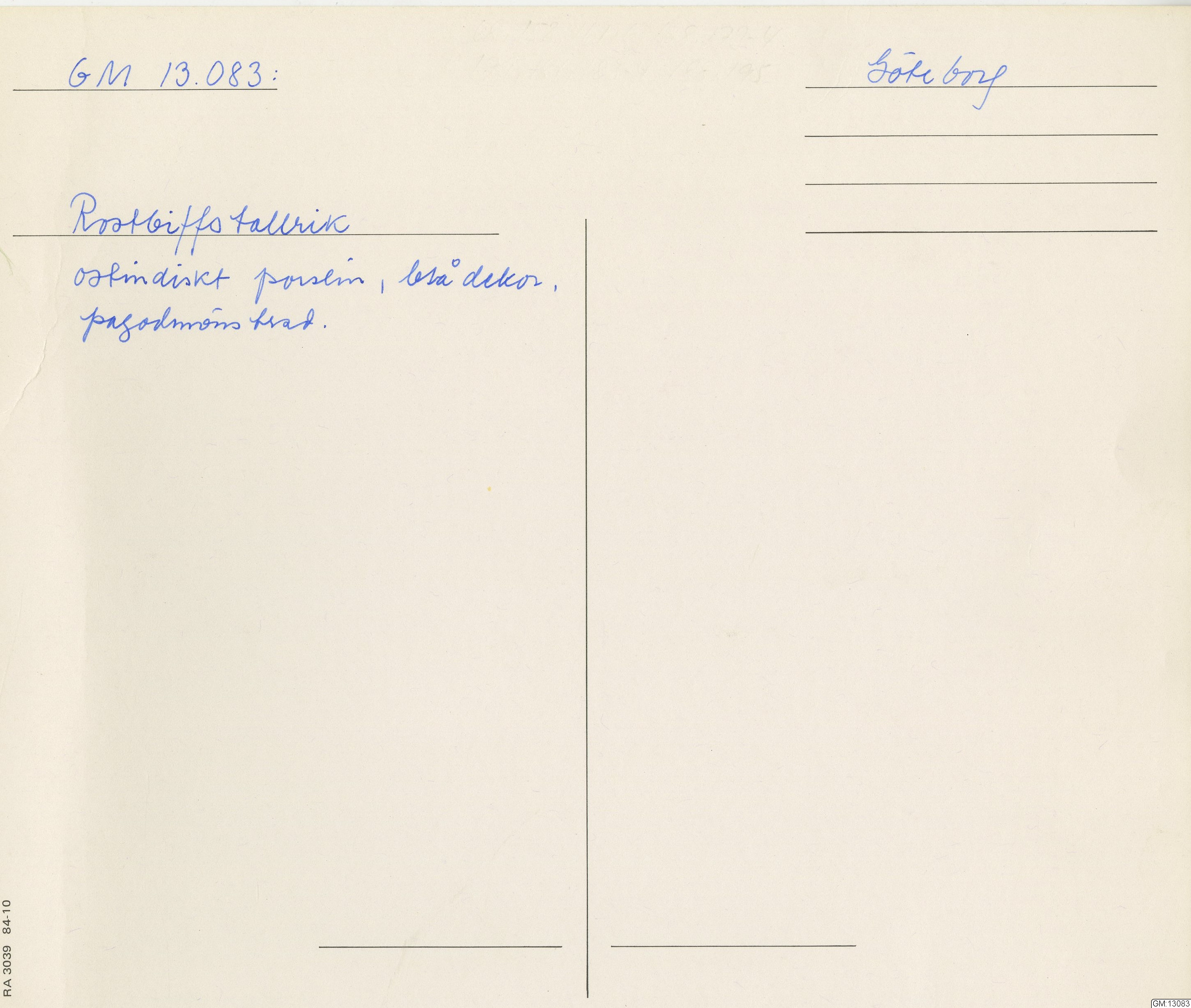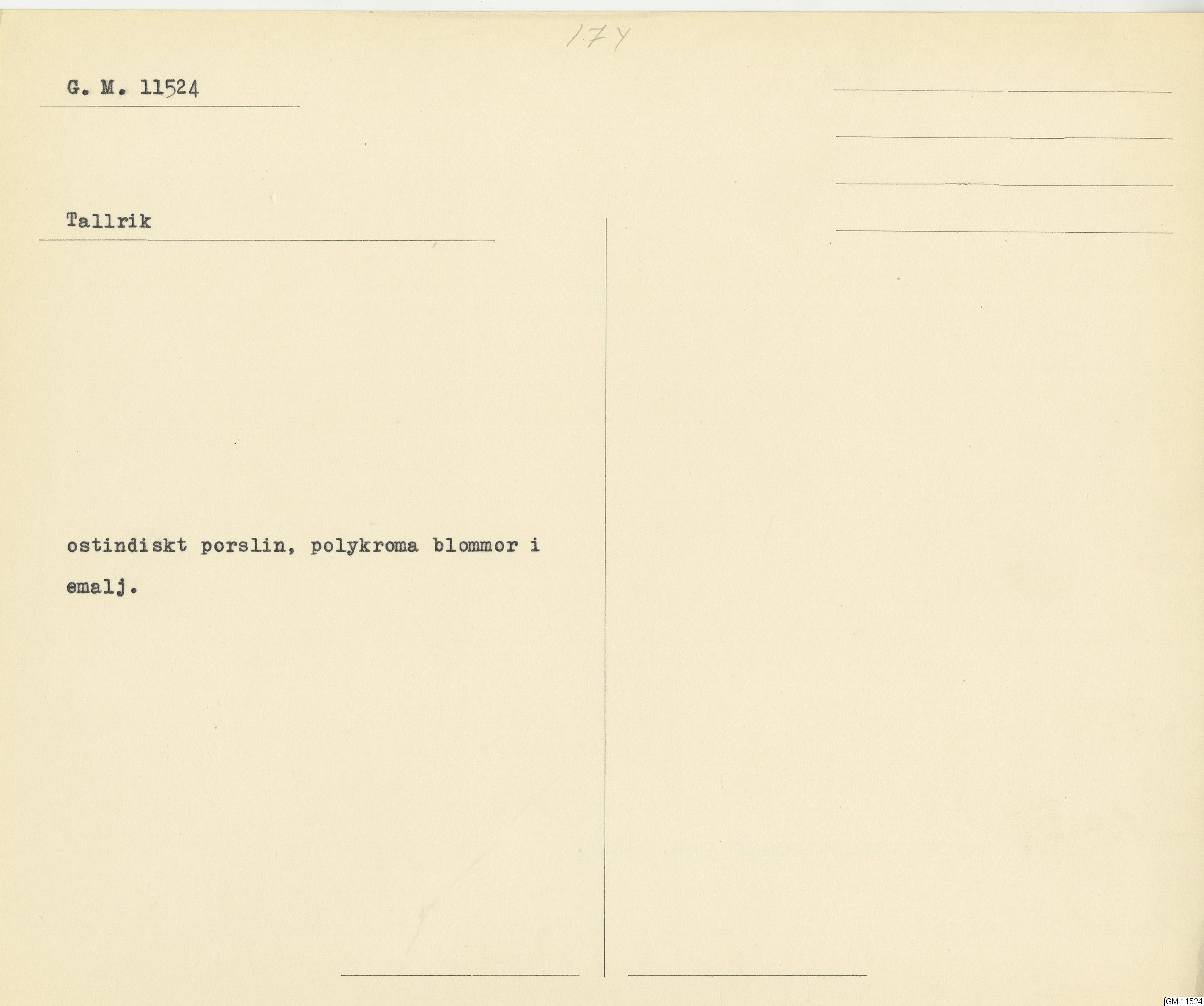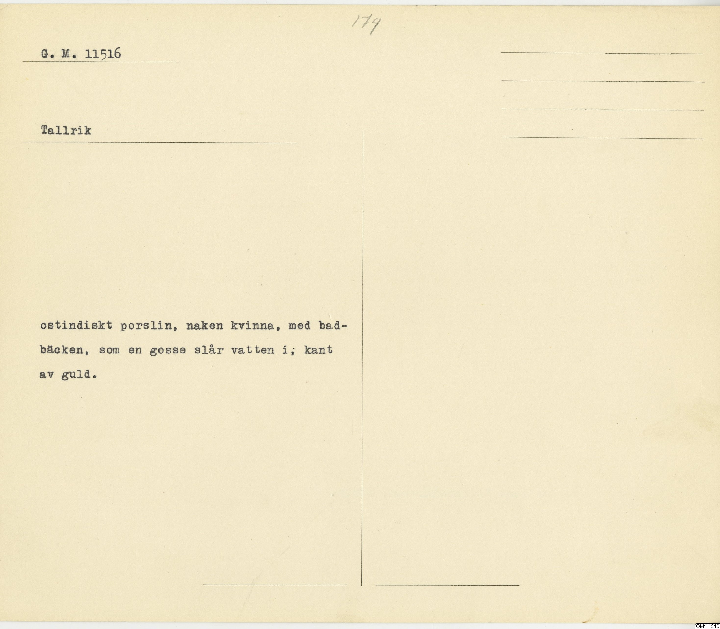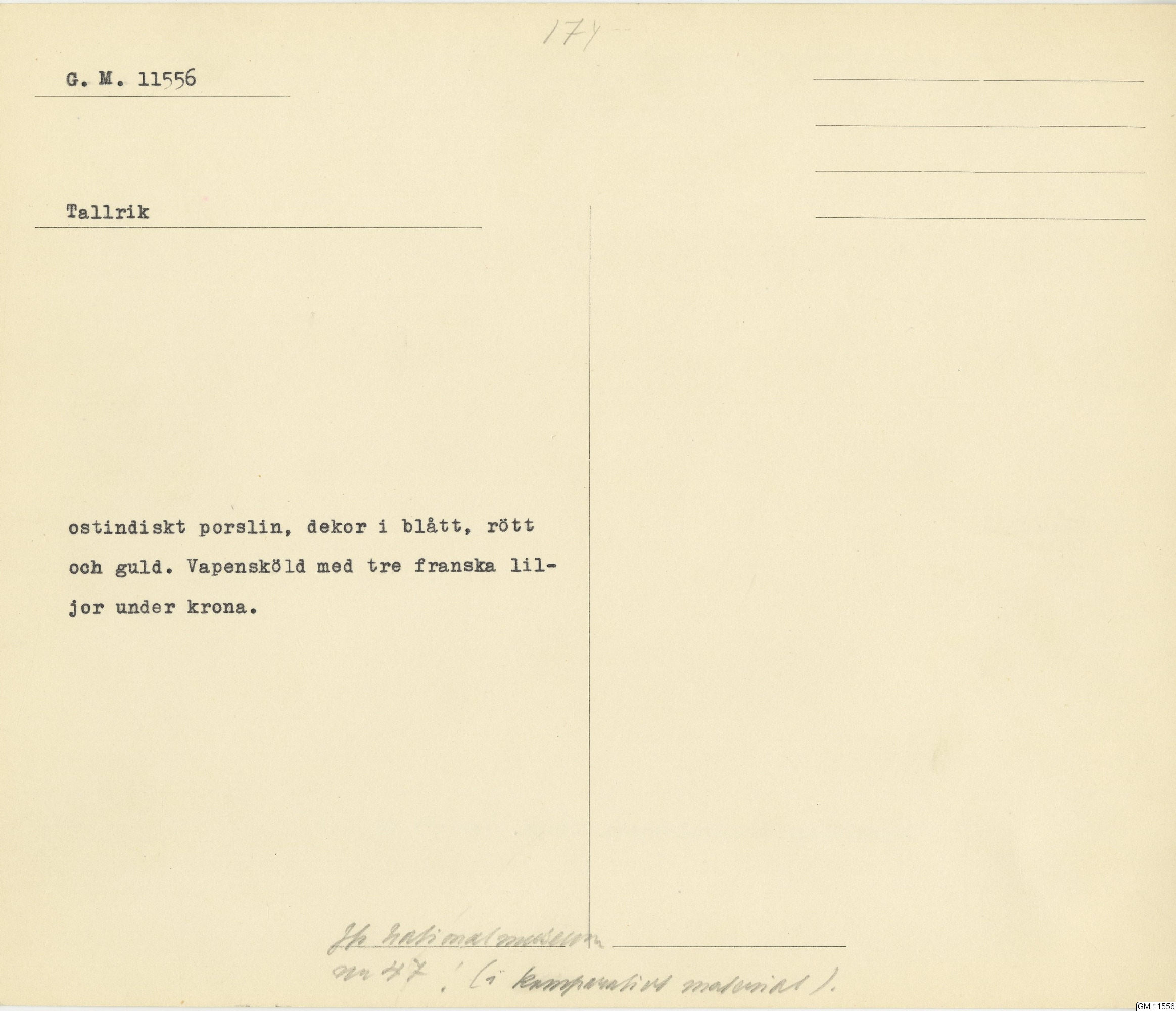 GM katalogkort 174. 18E Porslin Ostindiskt 4. tallrikar 2