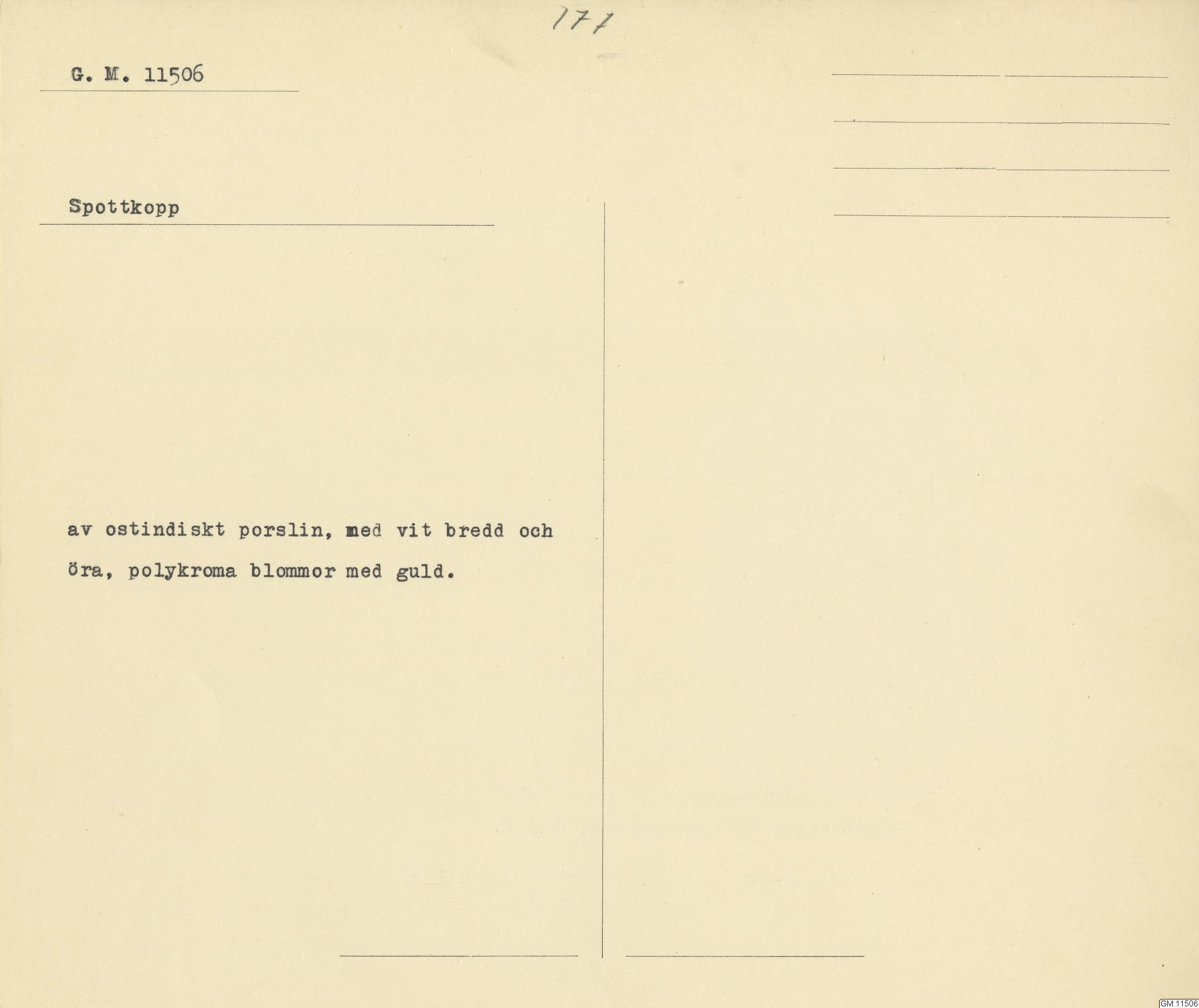 GM katalogkort 177. 18E Porslin Ostindisk 7. Krämkopp, bidé, nattkärl, askar mm