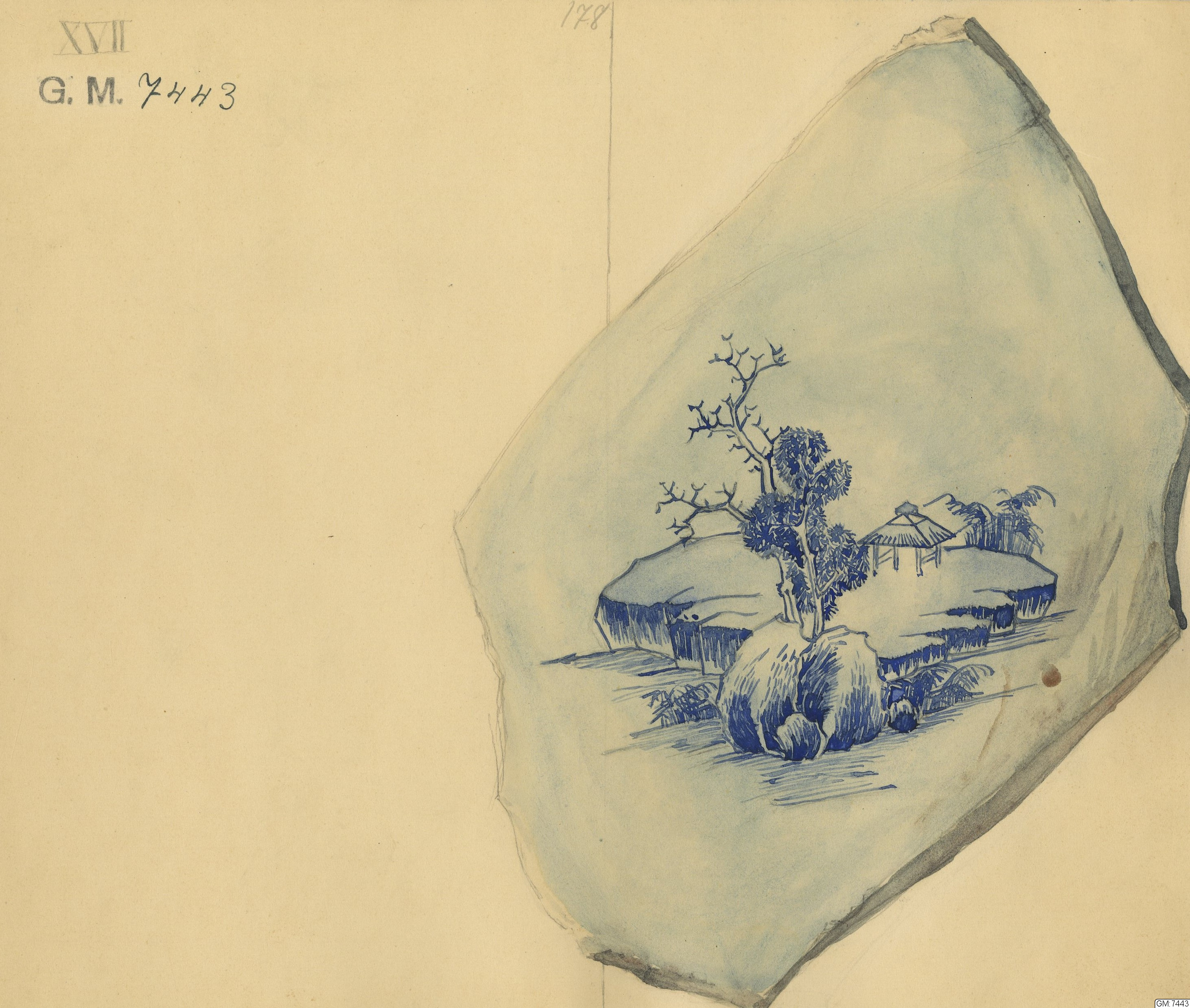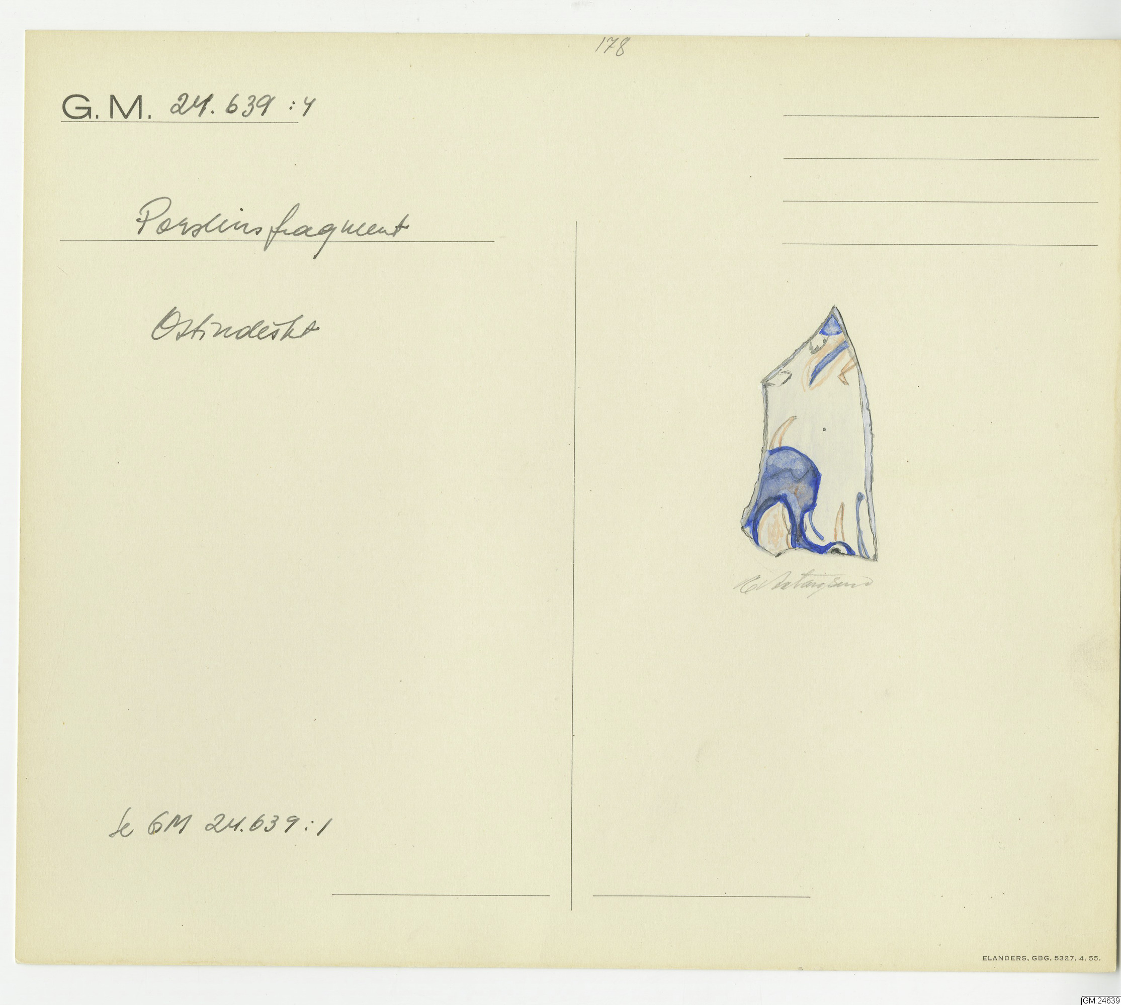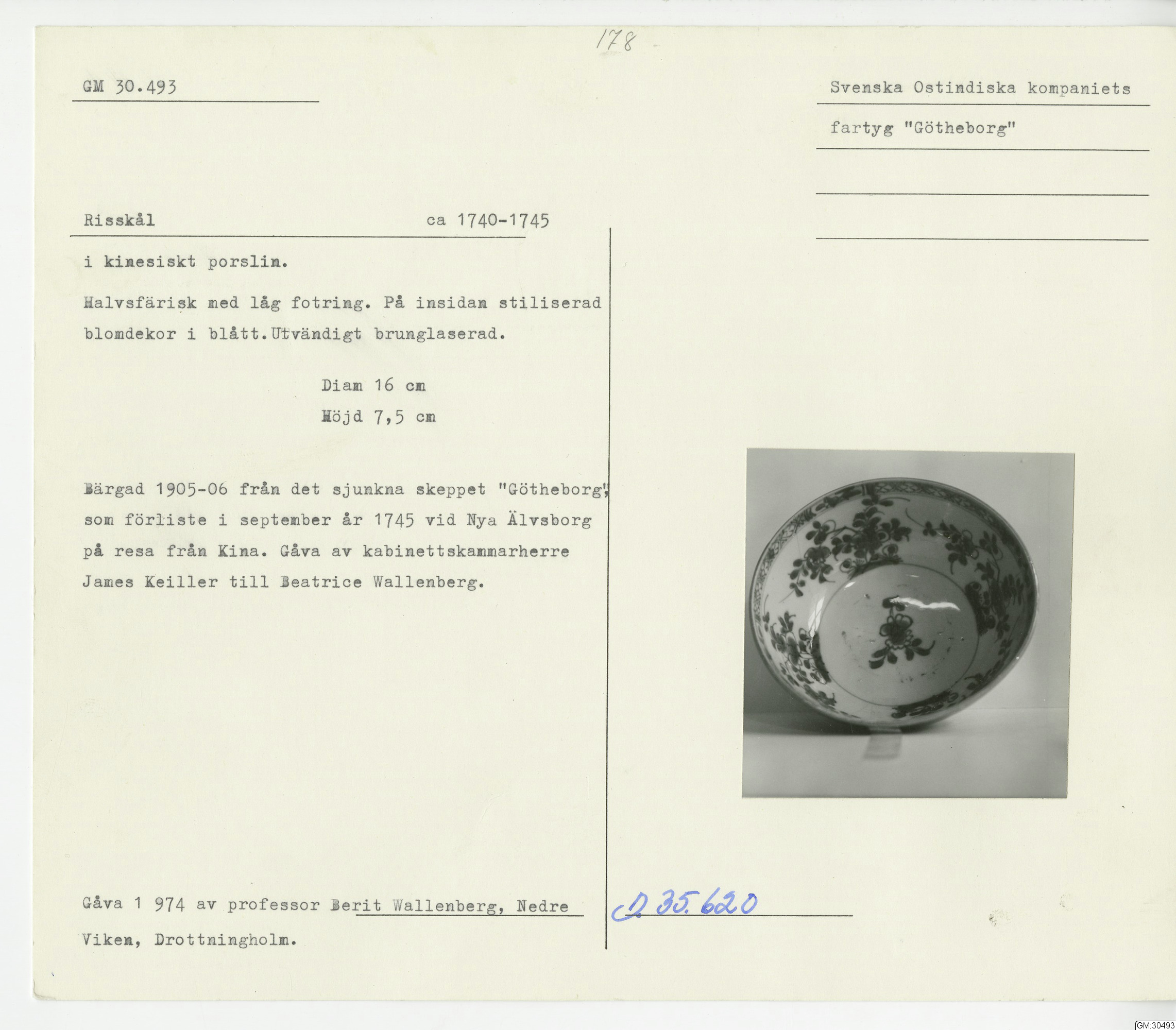 GM katalogkort 178. 18E Porslin Ostindiskt 8. Fynd från skeppet Götheborg. Fynd 1957 från samma ställe som Götheborg