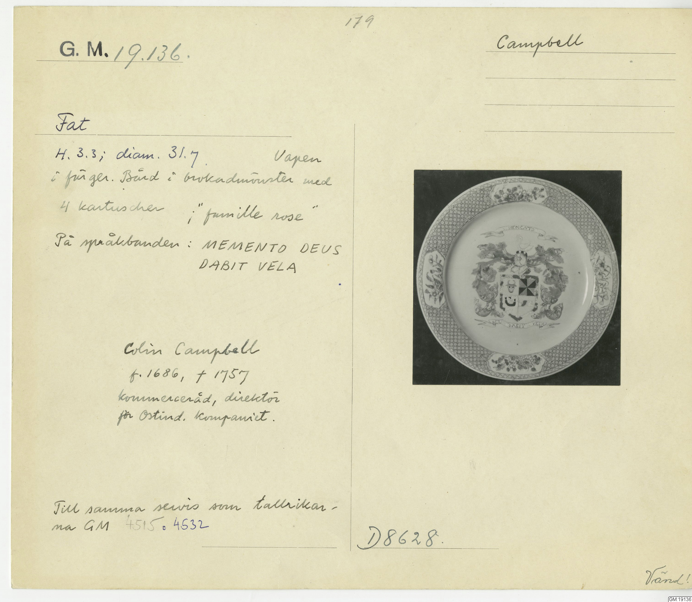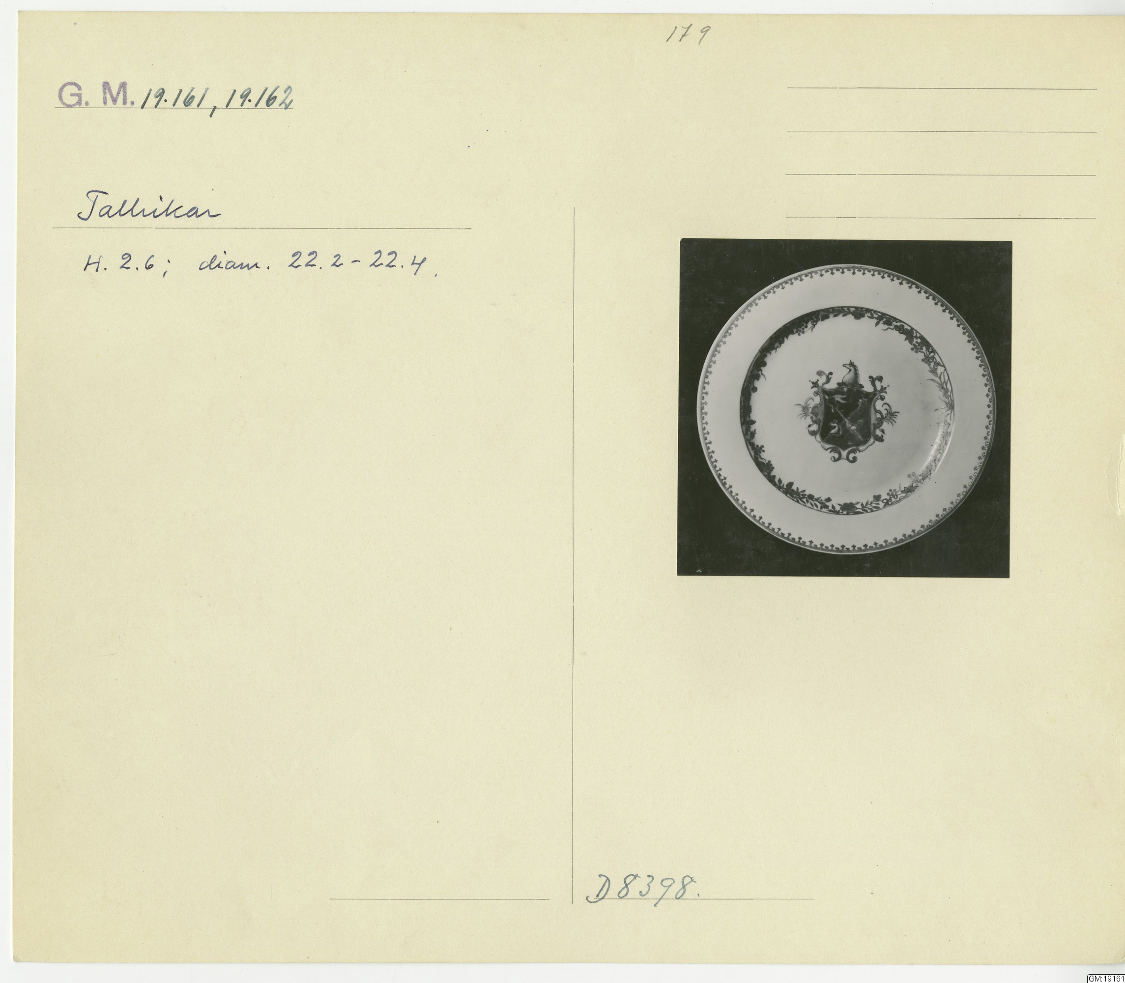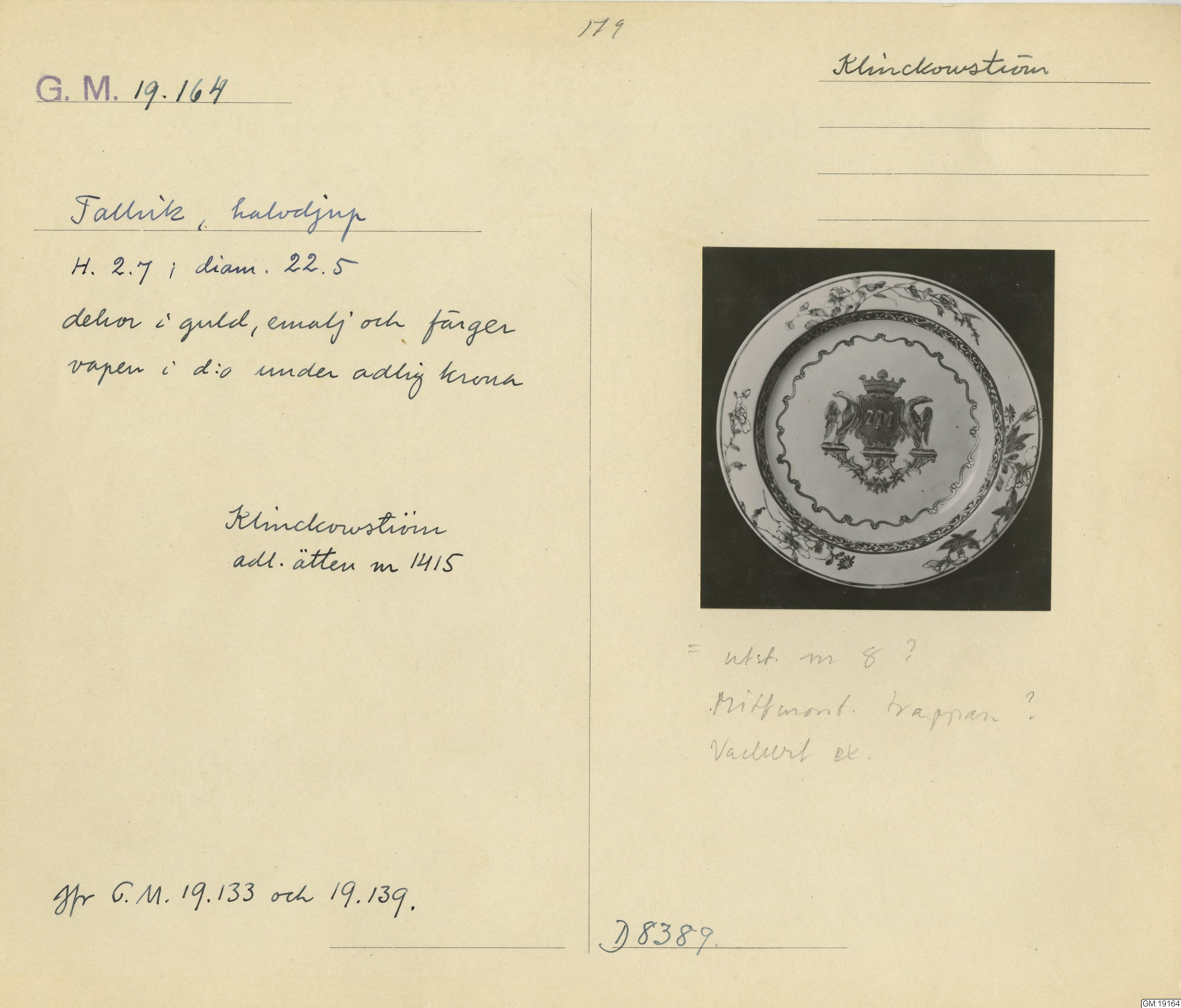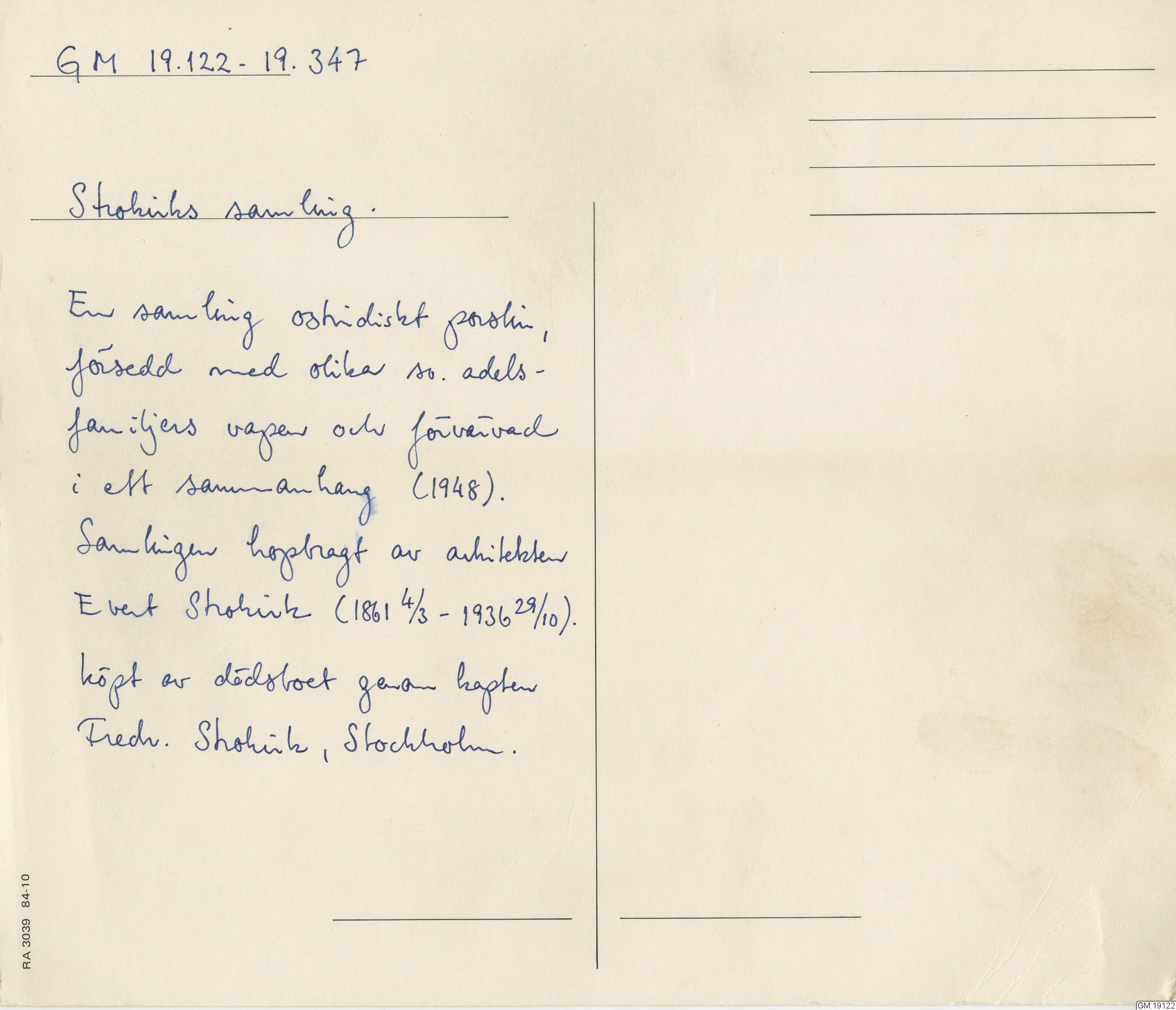 GM katalogkort 179. 18E Porslin Ostindiskt 9. Saml. Strokirk 1
