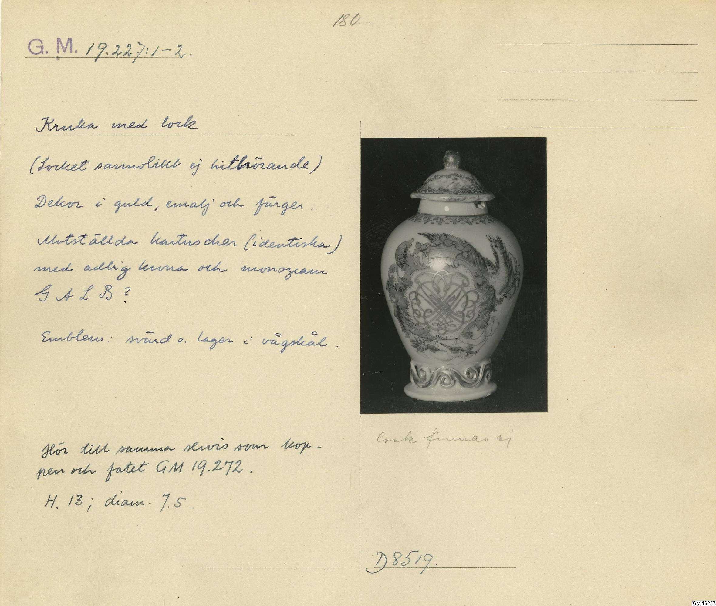 GM katalogkort 180. 18E Porslin Ostindiskt 10. Saml. Strokirk 2 :: volym, kapsel, katalogkort