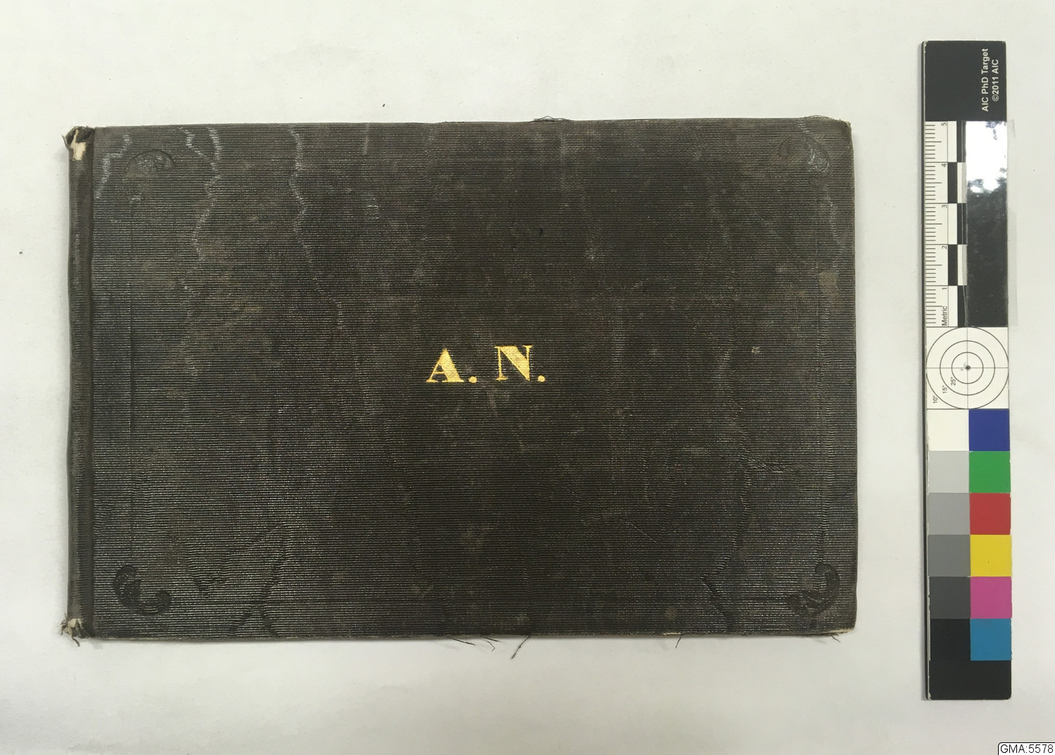 Skissbok med diverse blyertsteckningar. Har tillhört Ann Nonnen (f.1815). A.N. i guldtryck på pärmens yttersida.