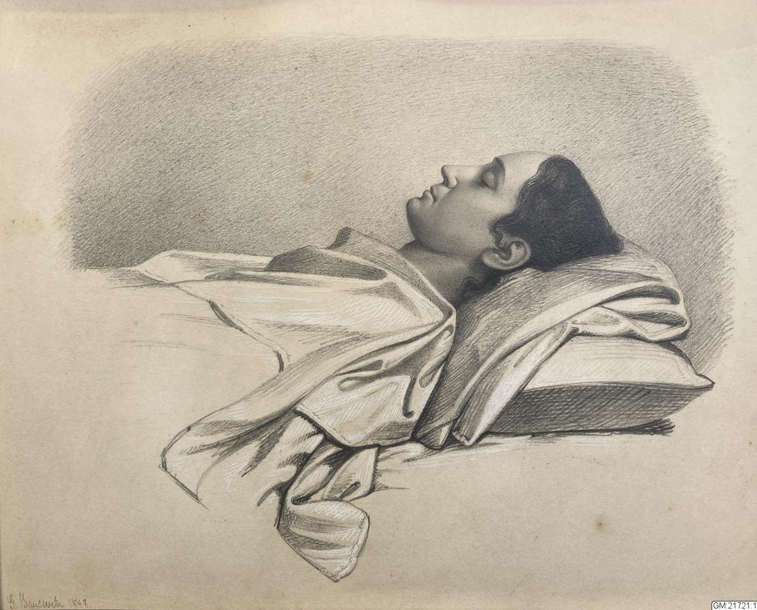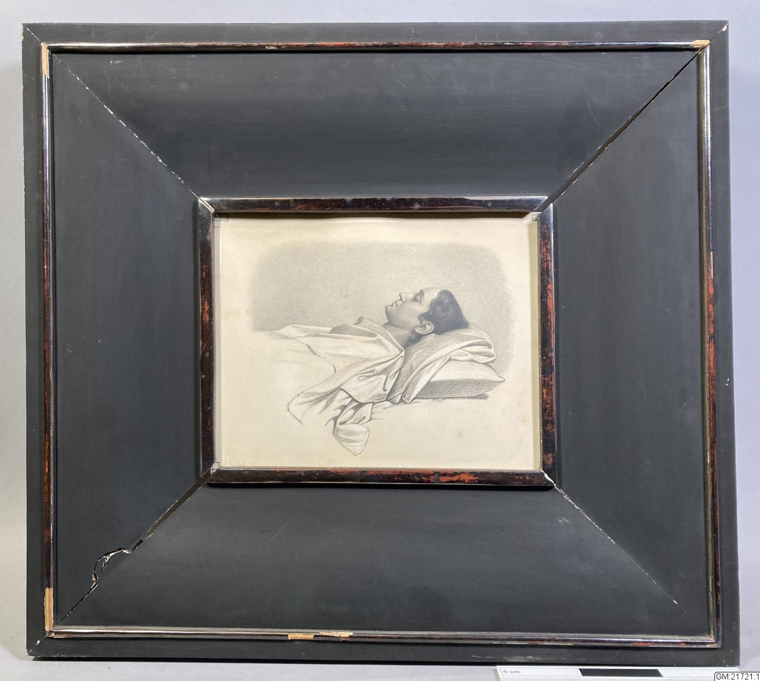 Föreställer Carolina Christina Nyström f. Silfverstolpe på sin dödsbädd år 1848. Sammanhör med tavelskåpet GM:21721, i vilket porträttet suttit monterat. Se katalogkort i huvudposten.