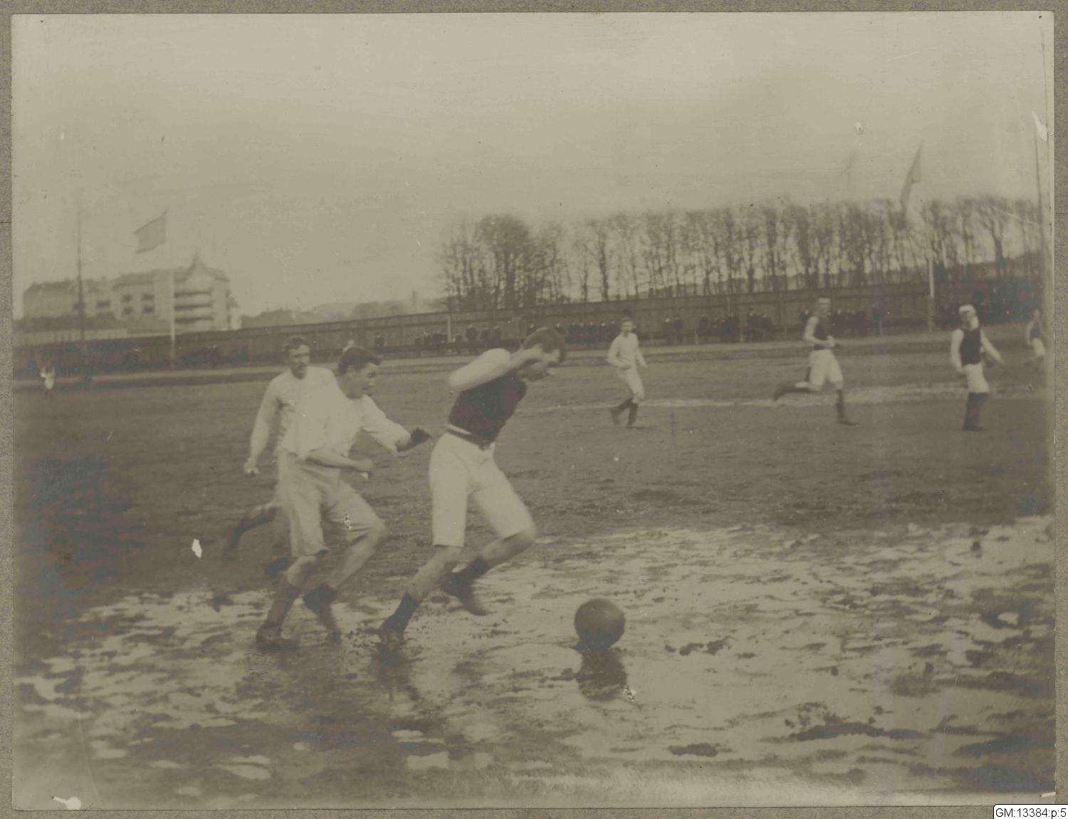 - Foto, Match på Idrottsplatsens sandplan 1903. Göteborgs Idrottsförbund mot Gärda Sportklubb. Det sistnämnda lagets spelare voro som synes, iförda tröjor utan ärmar.