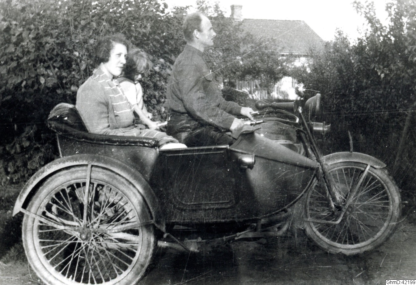 Motorcykel med sidovagn. Vid styret lantbrukare Gustaf Hjalmar Torvald, i vagnen hans hustru Ruth samt sonen Rune.