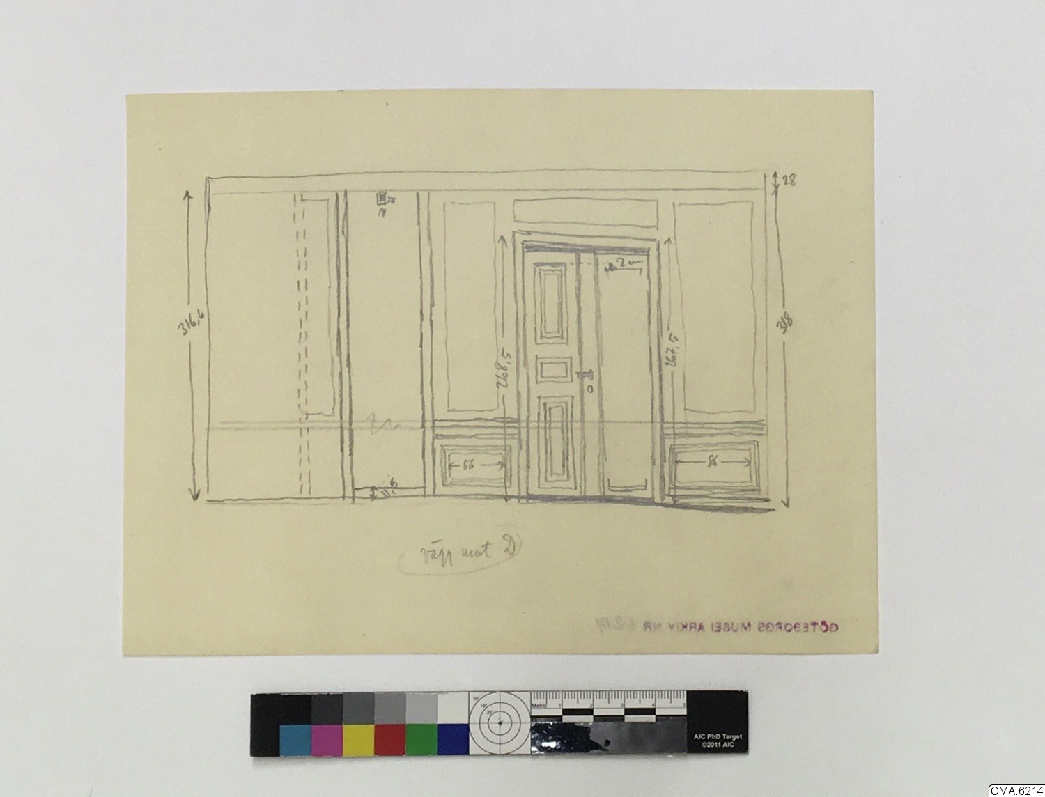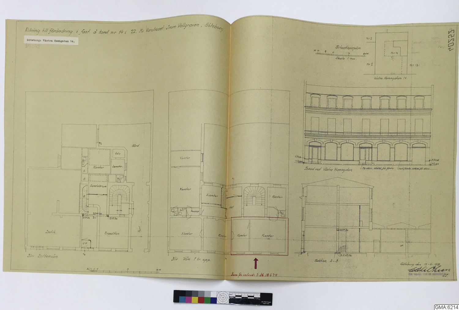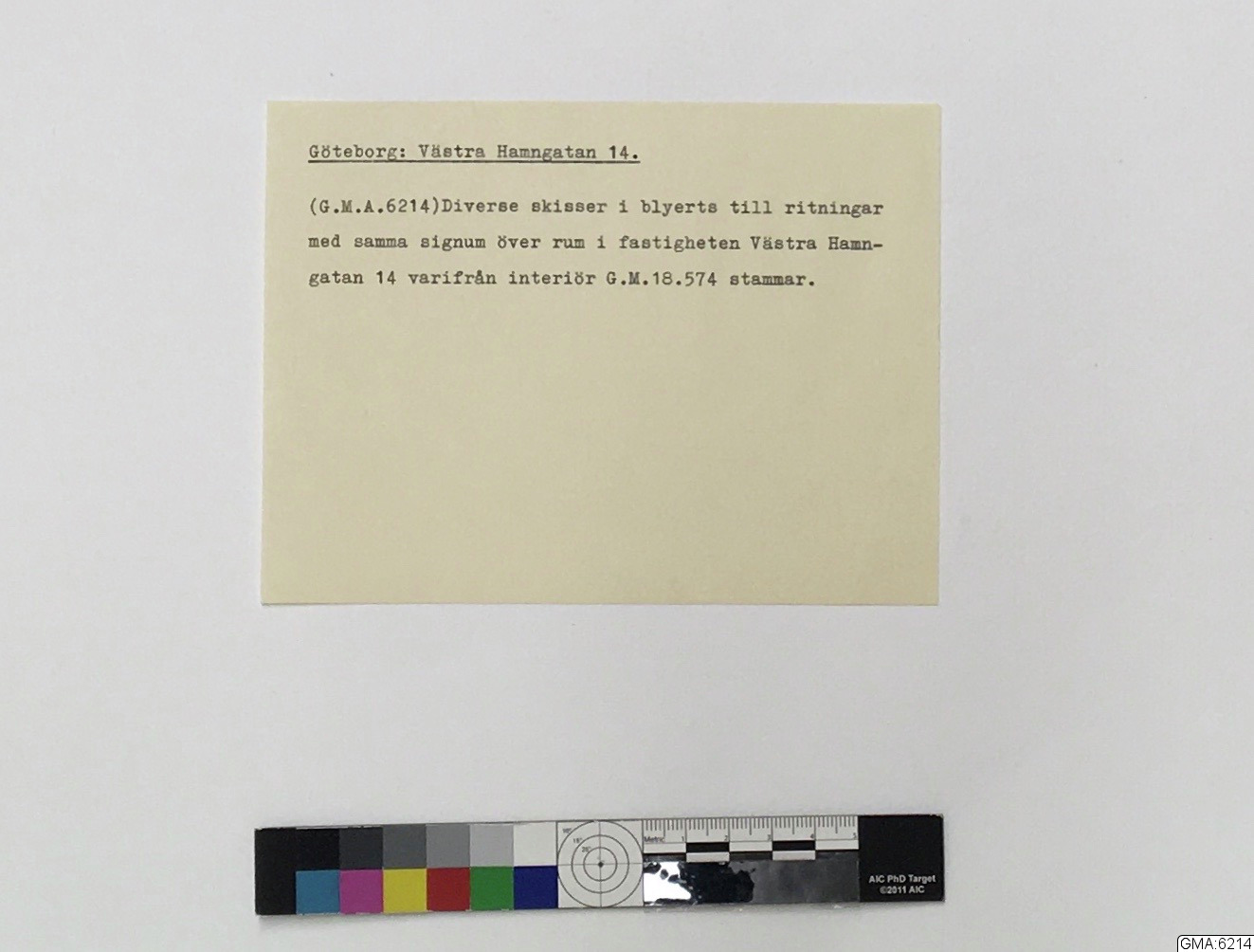 - ritningar, 2 blad, över rum i fastigheten Västra Hamngatan 14, Göteborg, varest interiör GM:18.574 varit uppsatt. Ritningarna visa rumsplan, plan av väggytor samt smärre detaljer. Utförda av Åke Brovik år 1945. (Skisser i blyerts till ritningarna, ej omnämnda i beskrivningen ovan, även märkta GMA:6214. - Till GMA:6214 har även fogats en ozalidkopia av ritning i Stadsarkitektkontorets i Göteborg arkiv över V.Hamngatan 14. Å denna har det rum från vilket interiören kommit markerats med rött.) (Jfr. neg. E.3968 - 3971.)