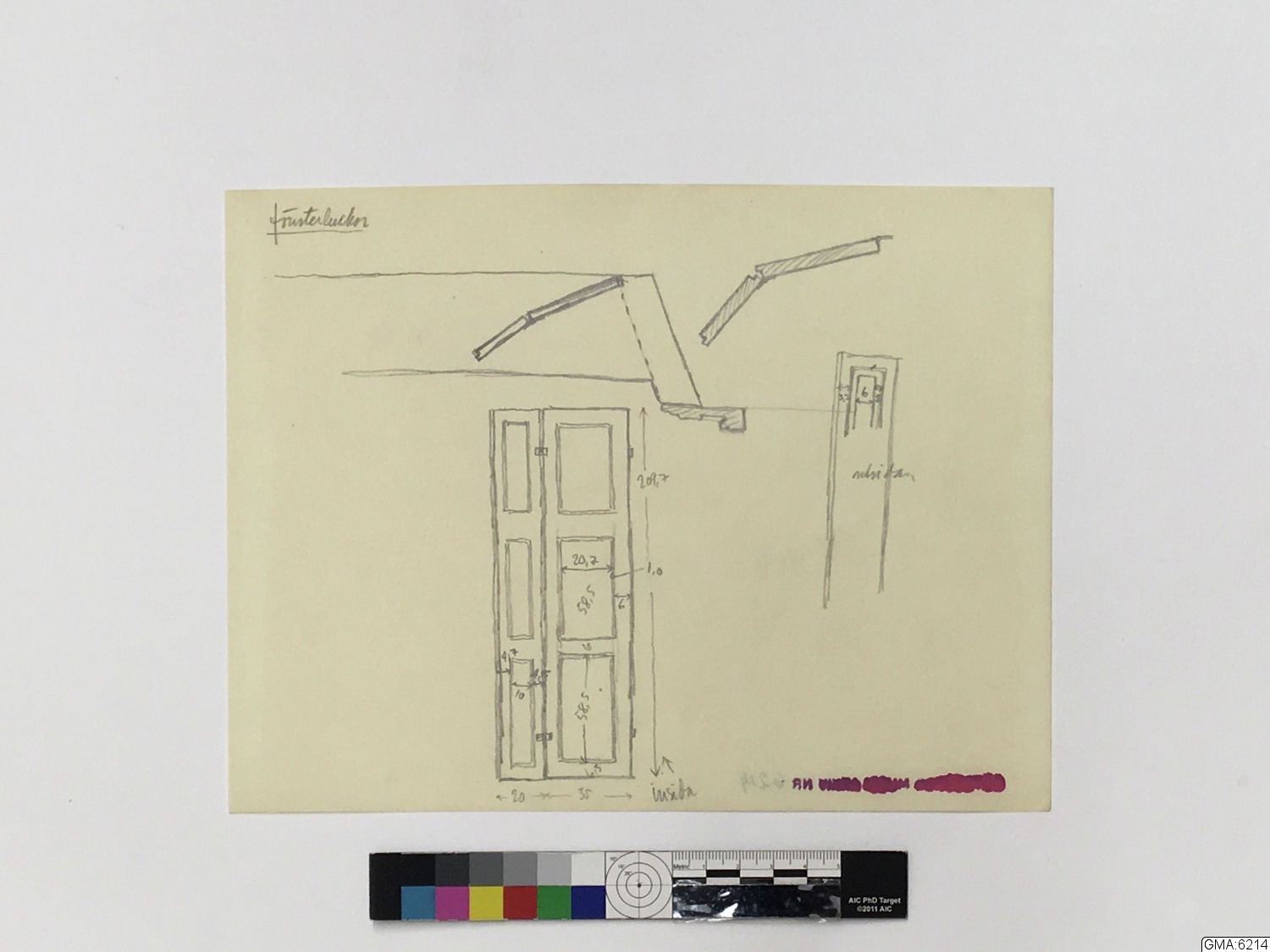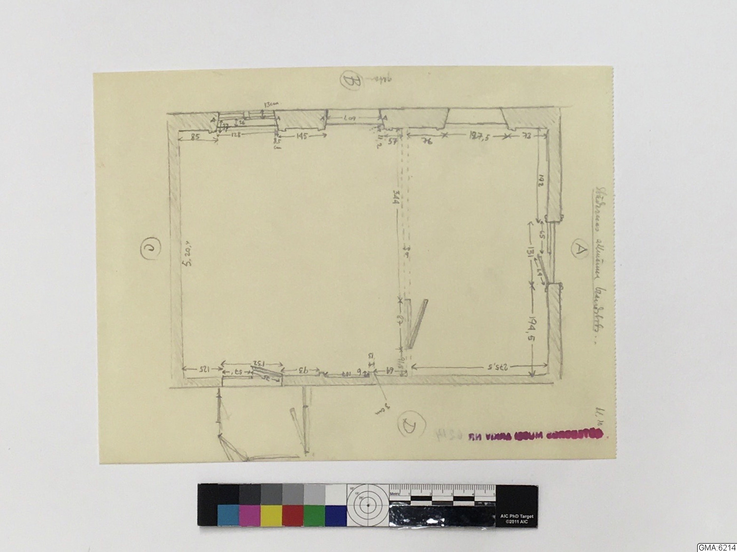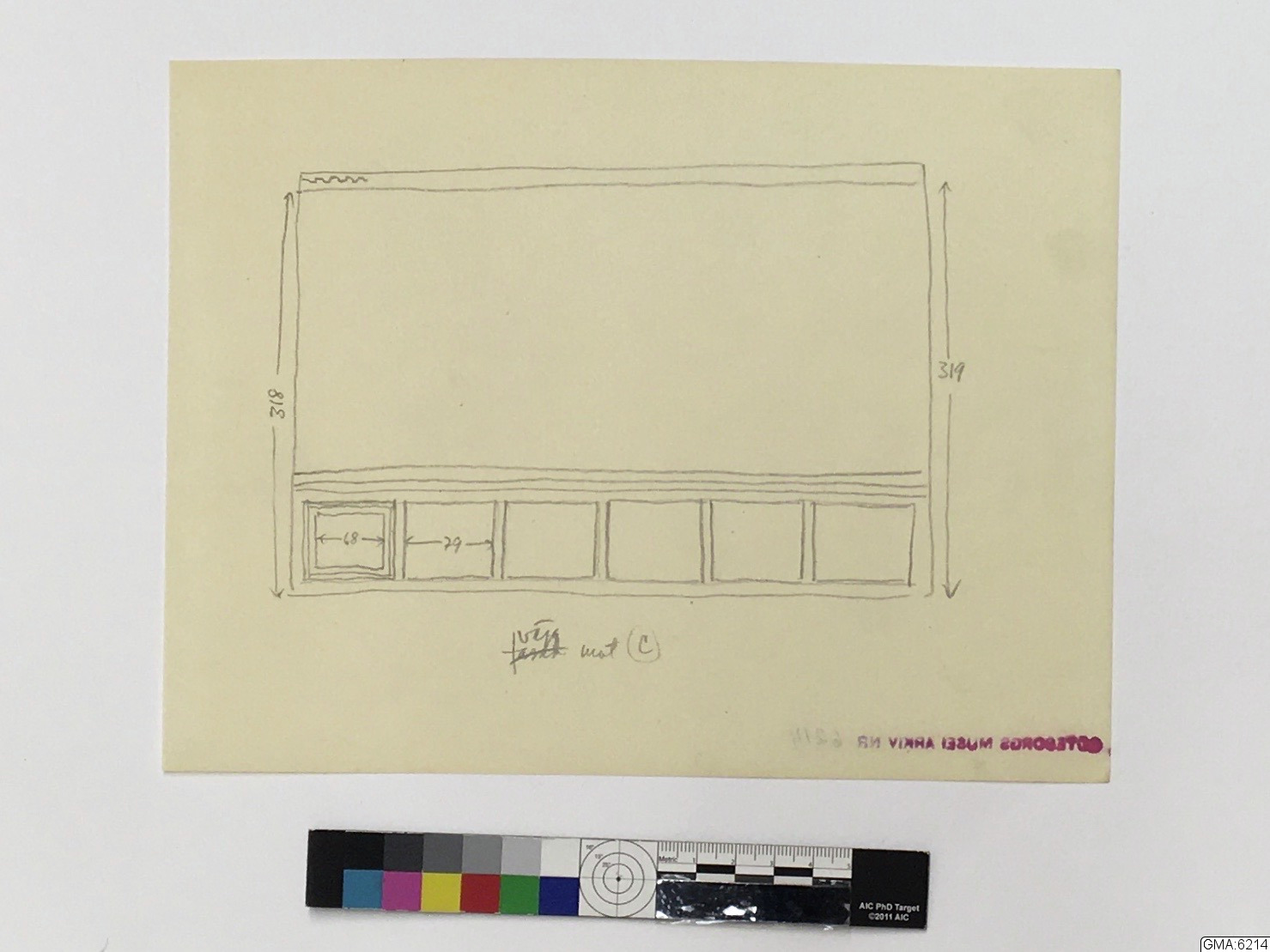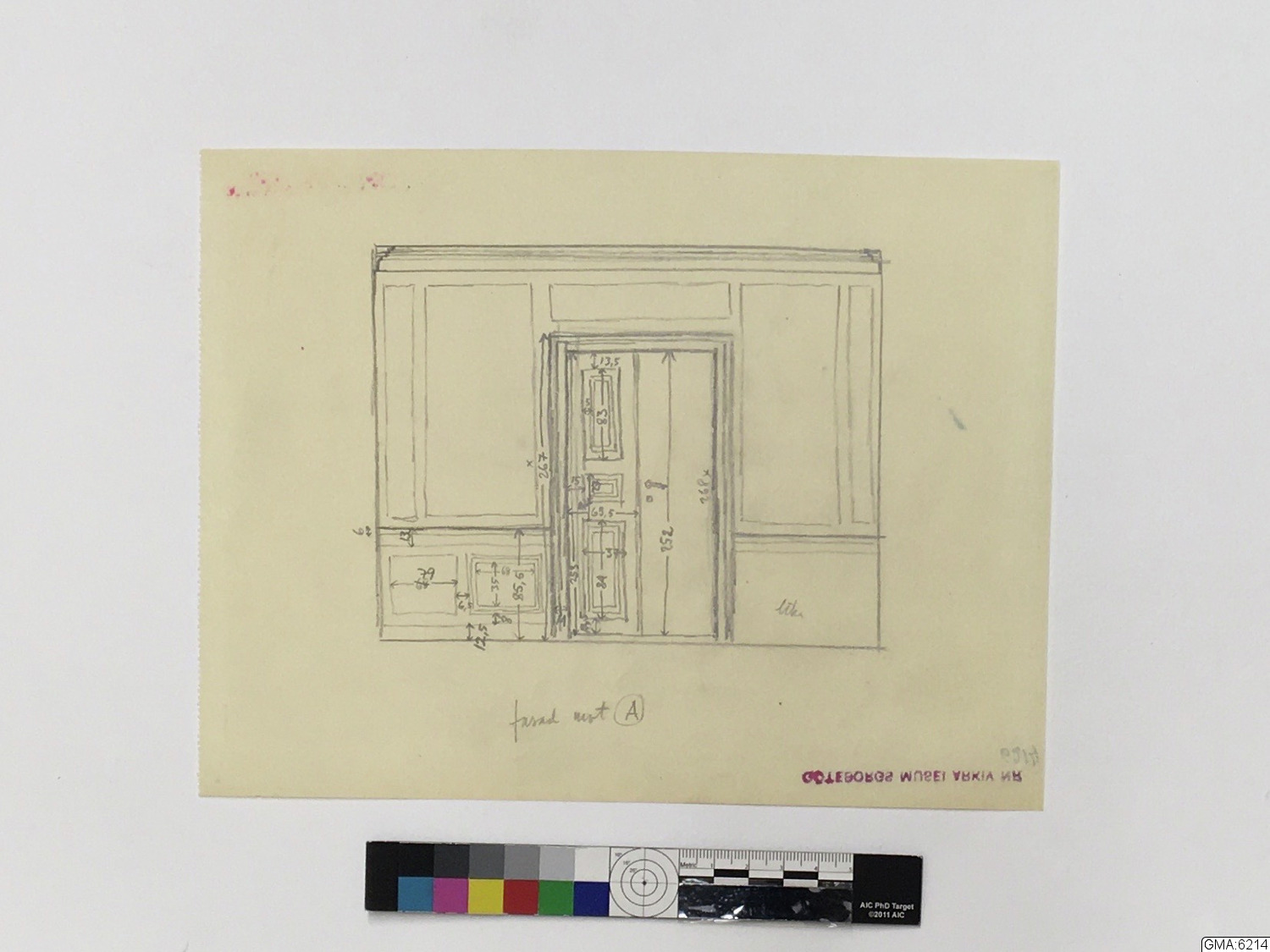 - ritningar, 2 blad, över rum i fastigheten Västra Hamngatan 14, Göteborg, varest interiör GM:18.574 varit uppsatt. Ritningarna visa rumsplan, plan av väggytor samt smärre detaljer. Utförda av Åke Brovik år 1945. (Skisser i blyerts till ritningarna, ej omnämnda i beskrivningen ovan, även märkta GMA:6214. - Till GMA:6214 har även fogats en ozalidkopia av ritning i Stadsarkitektkontorets i Göteborg arkiv över V.Hamngatan 14. Å denna har det rum från vilket interiören kommit markerats med rött.) (Jfr. neg. E.3968 - 3971.)