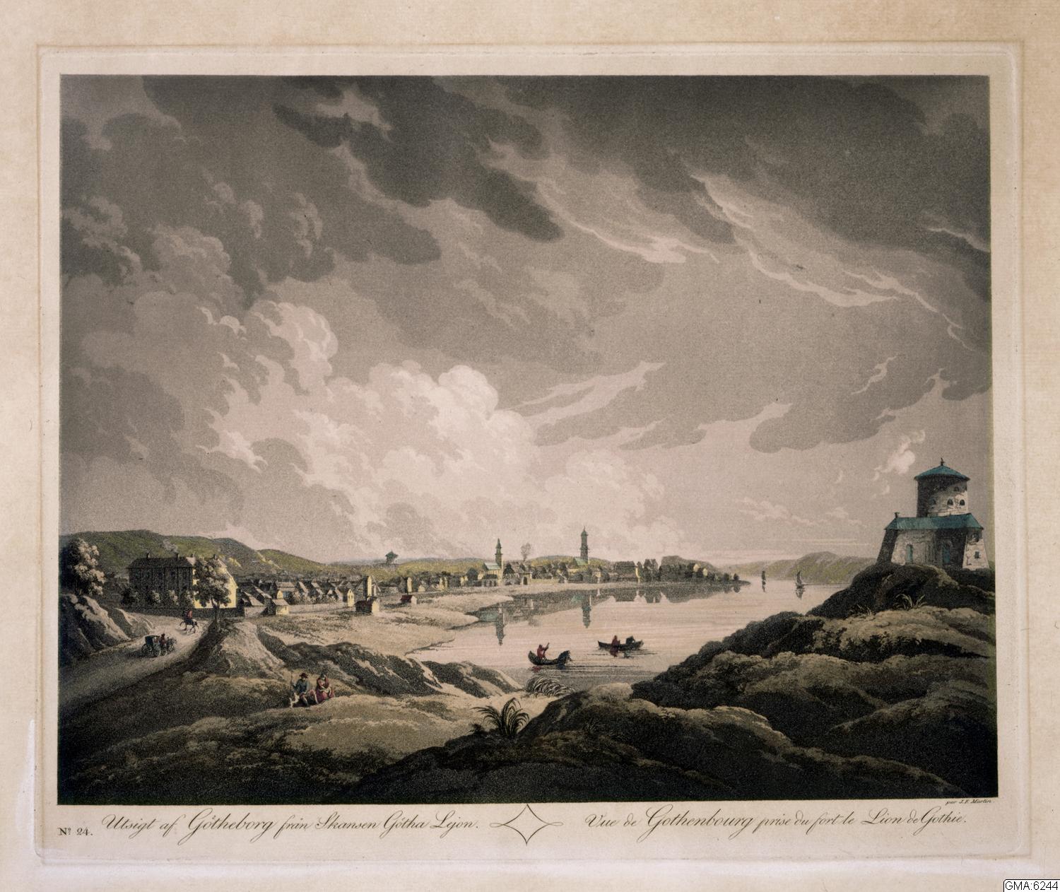 "Utsigt af Götheborg från Skansen Götha Lejon". Ur planschverket Svenska Vuer, från 1805 troligen, plansch nr 24. Text även på franska.