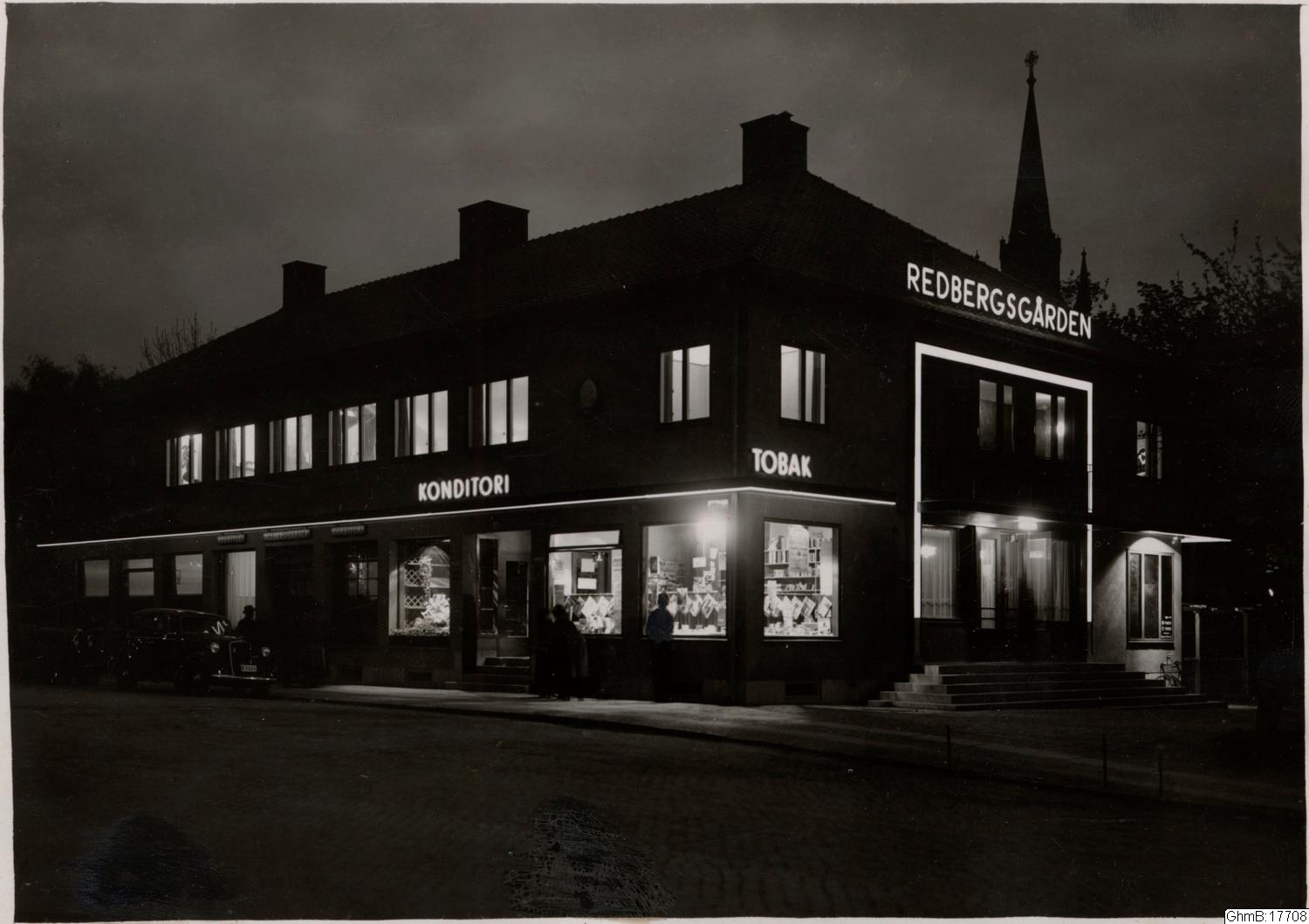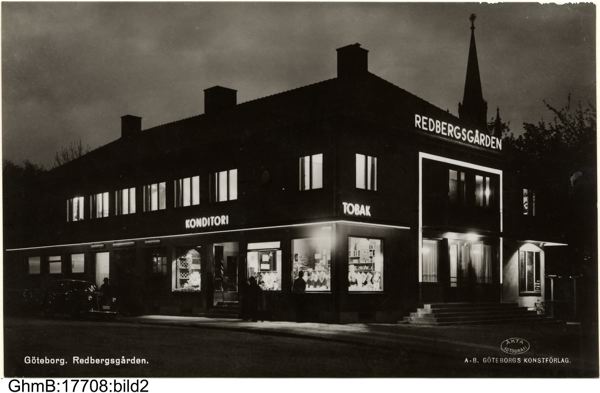 Här i fastigheten Danska Vägen 110 (kvarteret Sankt Pauli 43:33 Redbergslid 6) öppnades biografen Redbergsgården den 30 oktober 1943, med 243 platser i den tidigare Folkets Hus-salen. Film visades dock enbart lördagar-söndagar. Man stängde den 25 april 1971, varefter där bland annat varit Idrottens Bingo. På fotot lyser neonskylten KONDITORI och där finns ännu konditoriet Redbergsgården, som än i dag är i grundarfamiljen Jerkstrands regi.