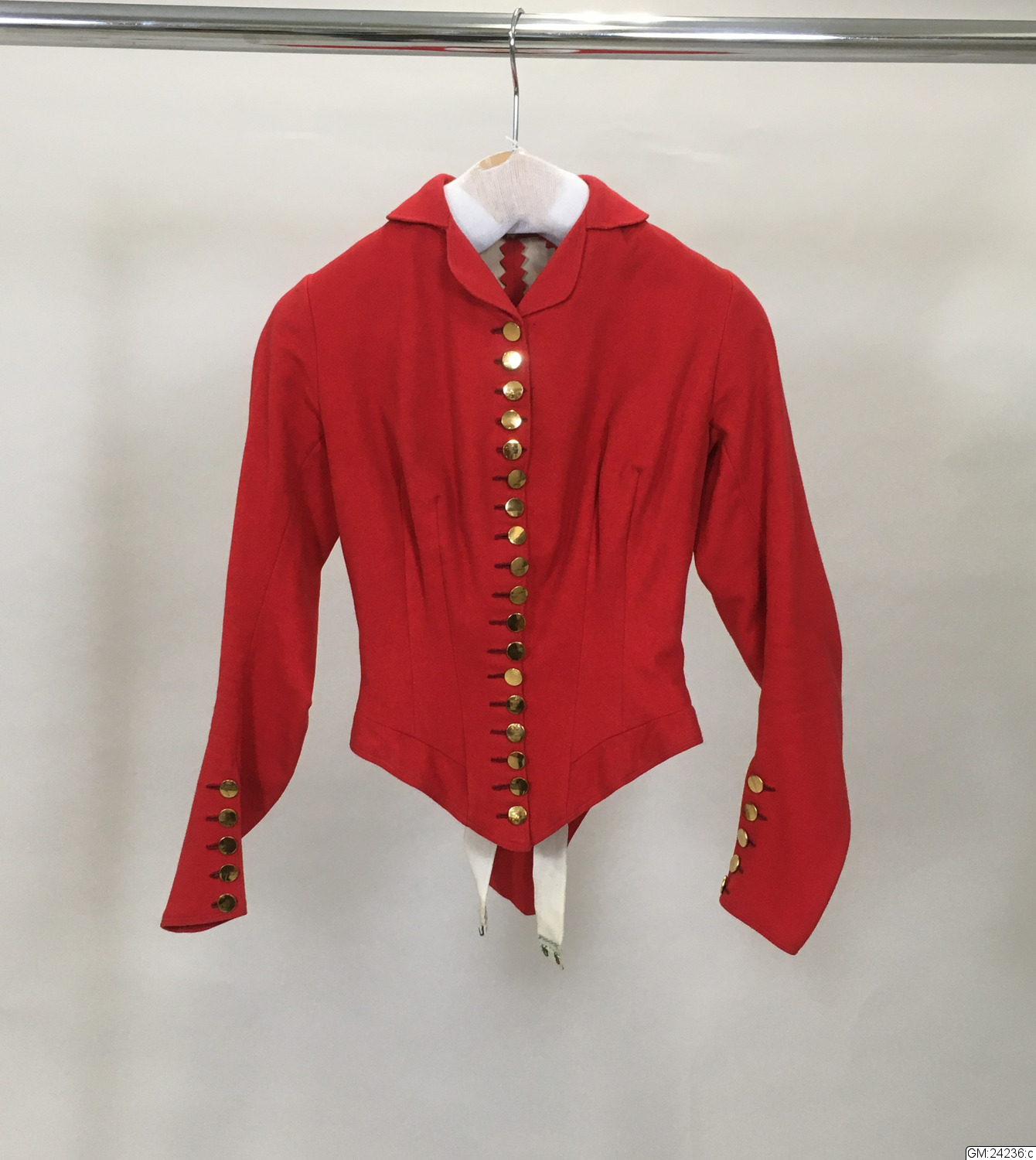 - jacka m. liten krag med slag. Knpps framtill med 18 knappar av gulmetall. Livet fortsätter framtill i en snibb. Lång insydd ärm, knäppes vid handleder med fem knappar av gulmetall. livet fortsätter mitt bak i ett smalt skört garnerat med två gulmetallsknappar. Fodrad med beigevitt diagnoalvävt bomulltstyg. Elva fjädrar. Vitt midjeband med två hyskor och hakar. Mitt bak på kragens insida en metallknapp.