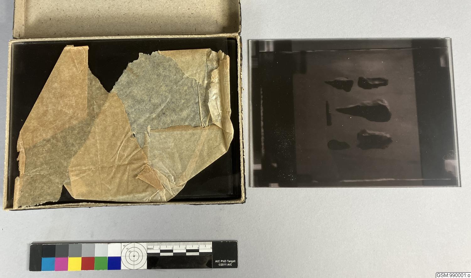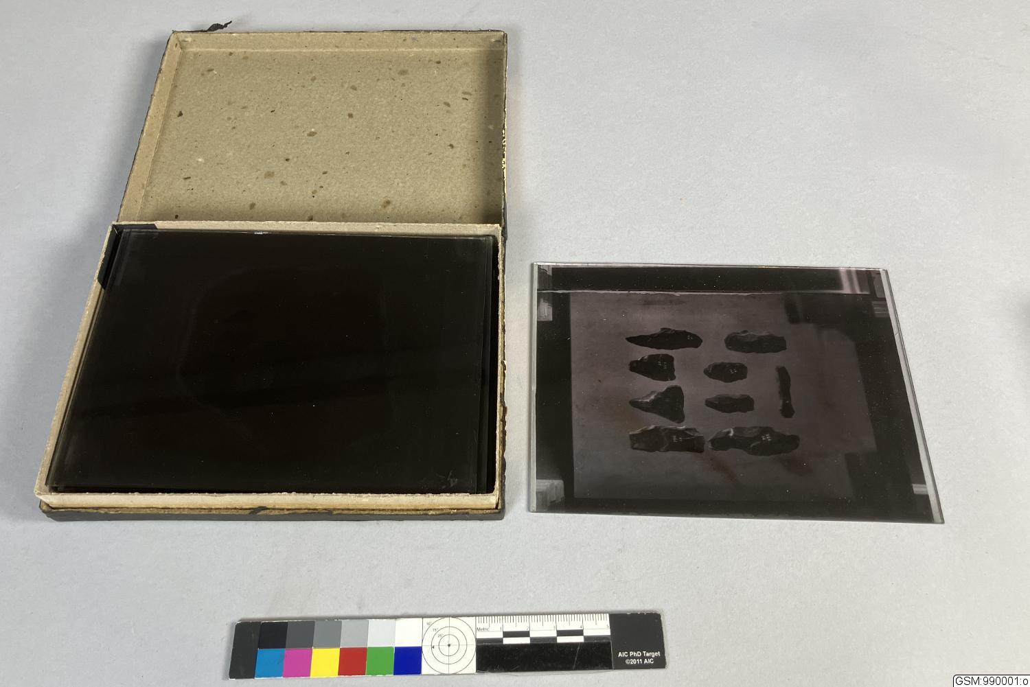 Dessa glasplåtar i kartong förvarades tillsammans med Sarauw kamera. Motiven är flintartartefakter.