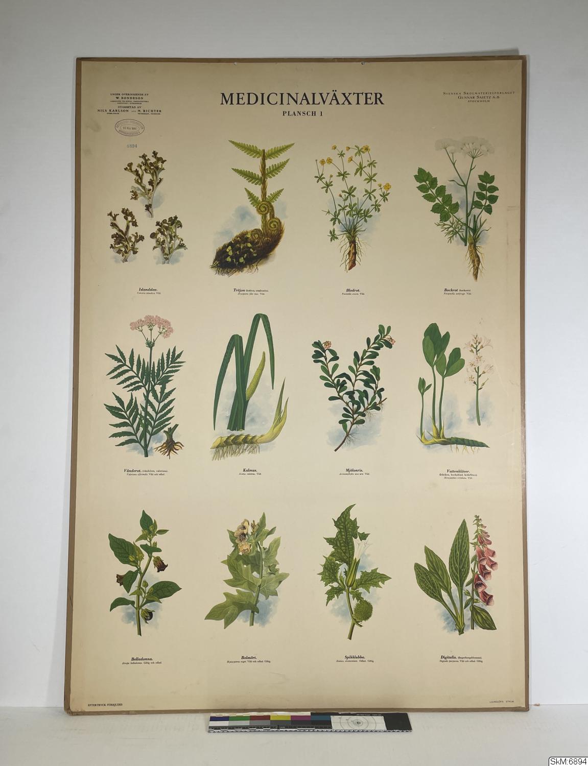 plansch föreställande islandslav, träjon, blodrot, bockrot, vänderot, kalmus, mjölonris, vattenklöver, belladonna, bolmört, spikklubba, digitalis.